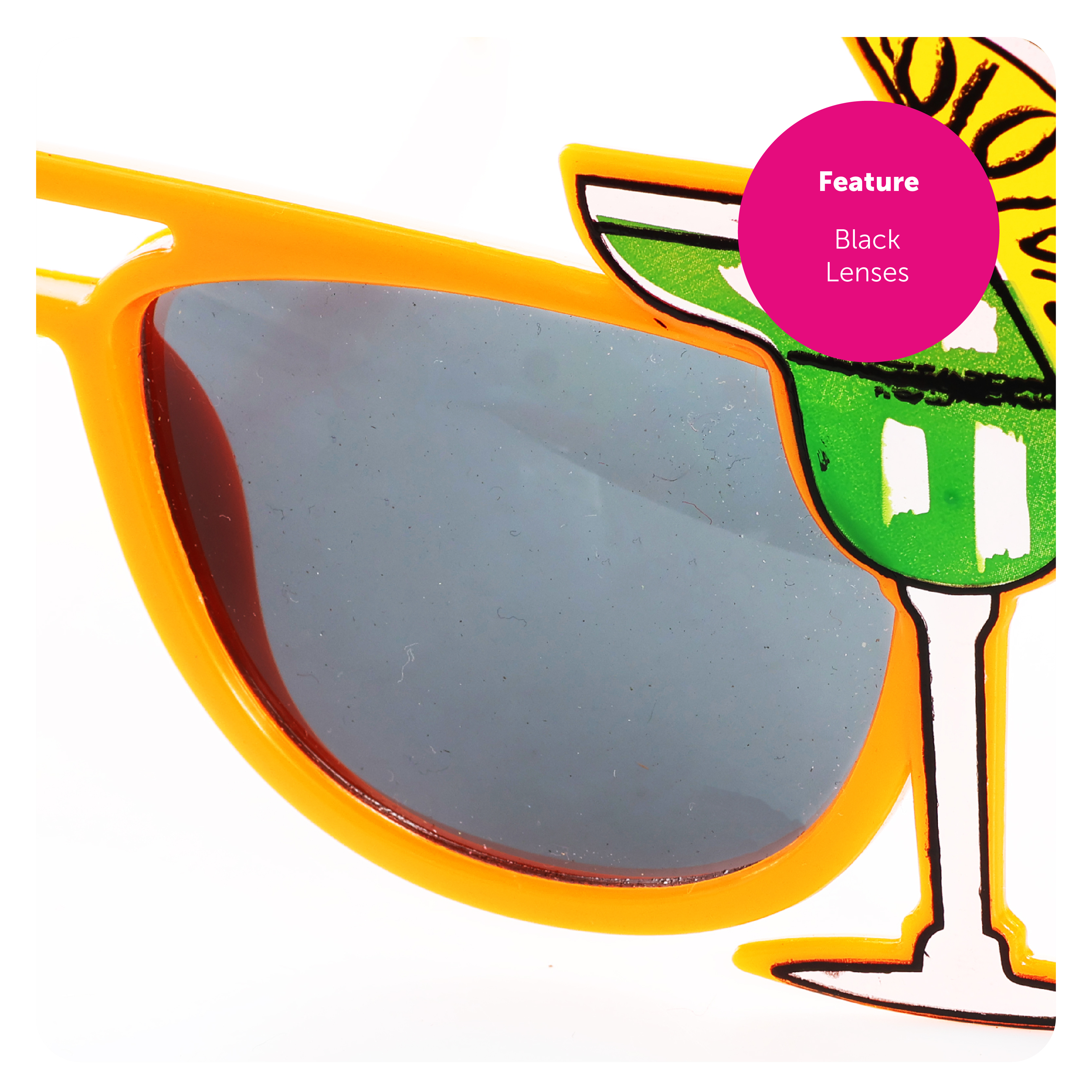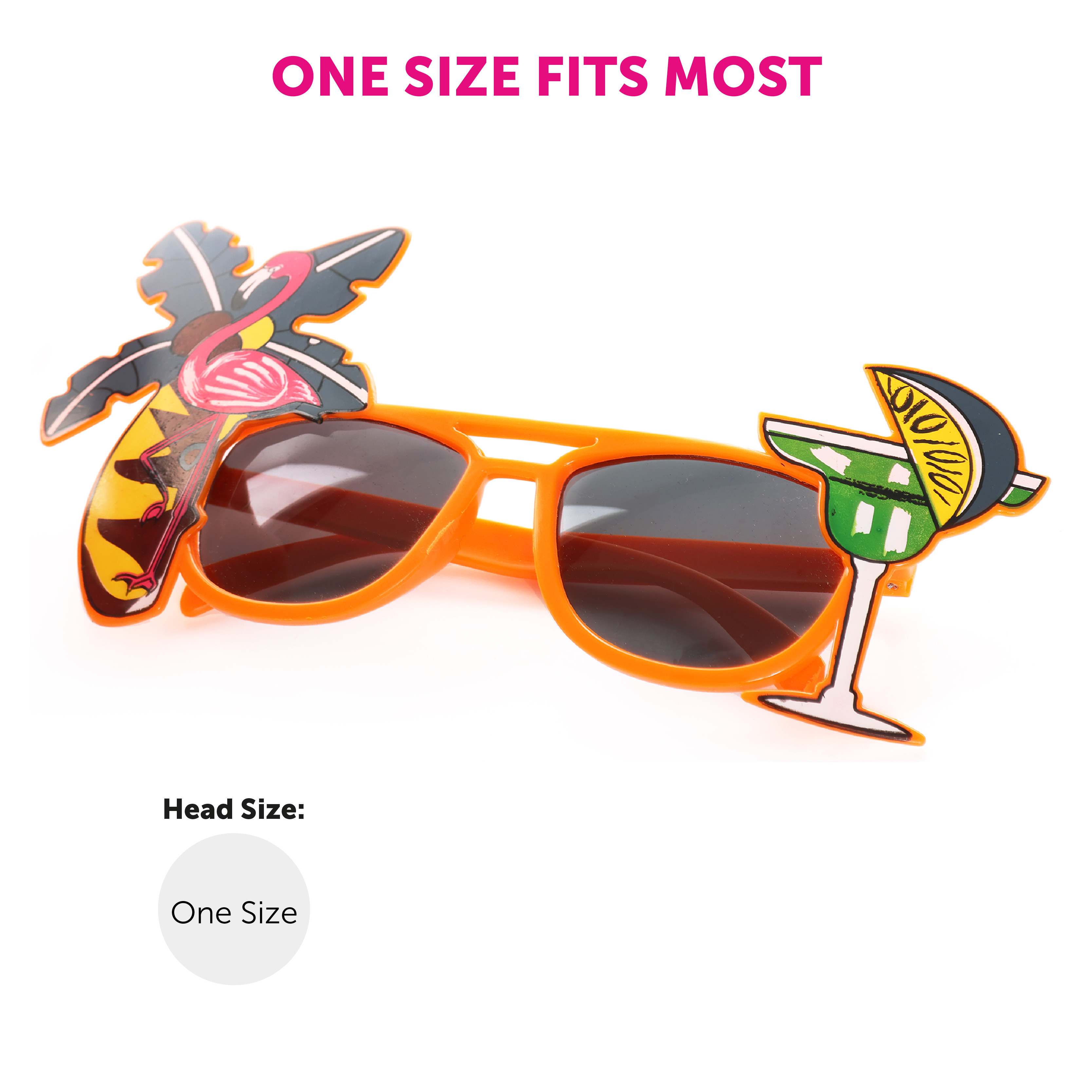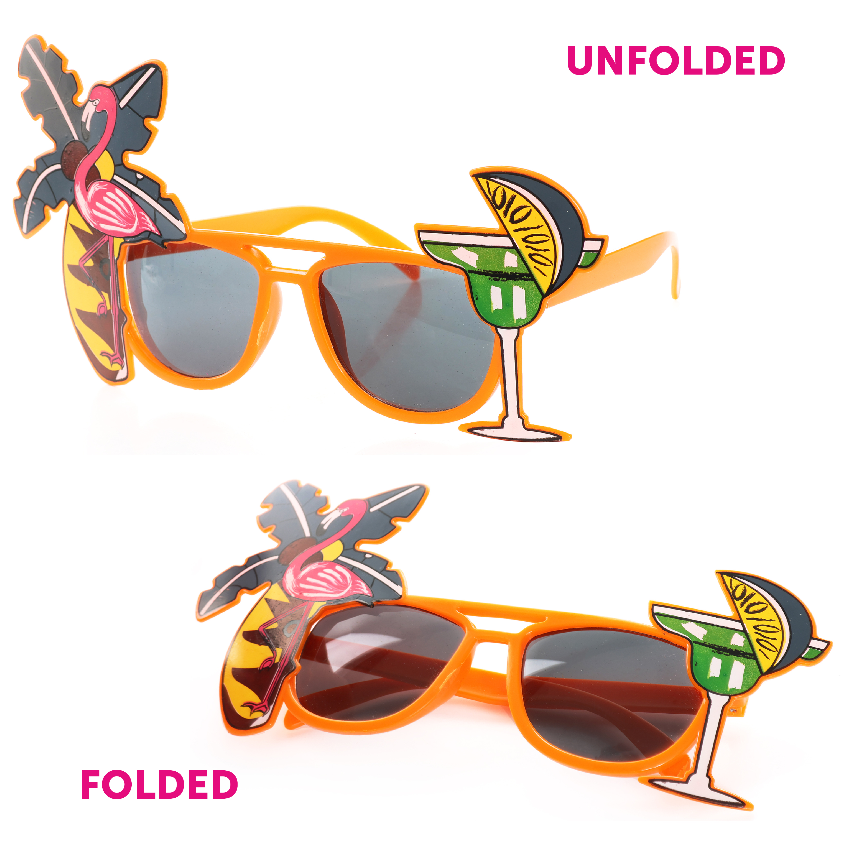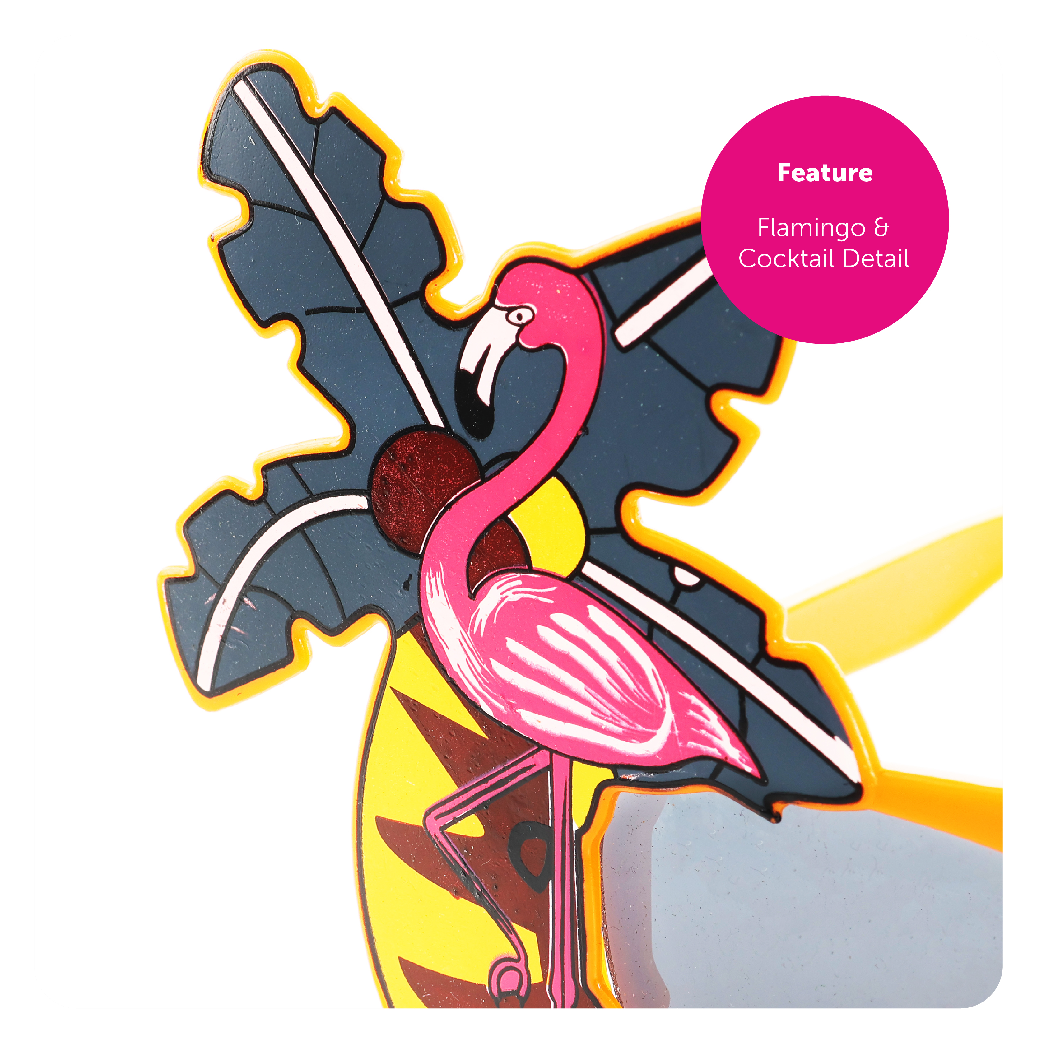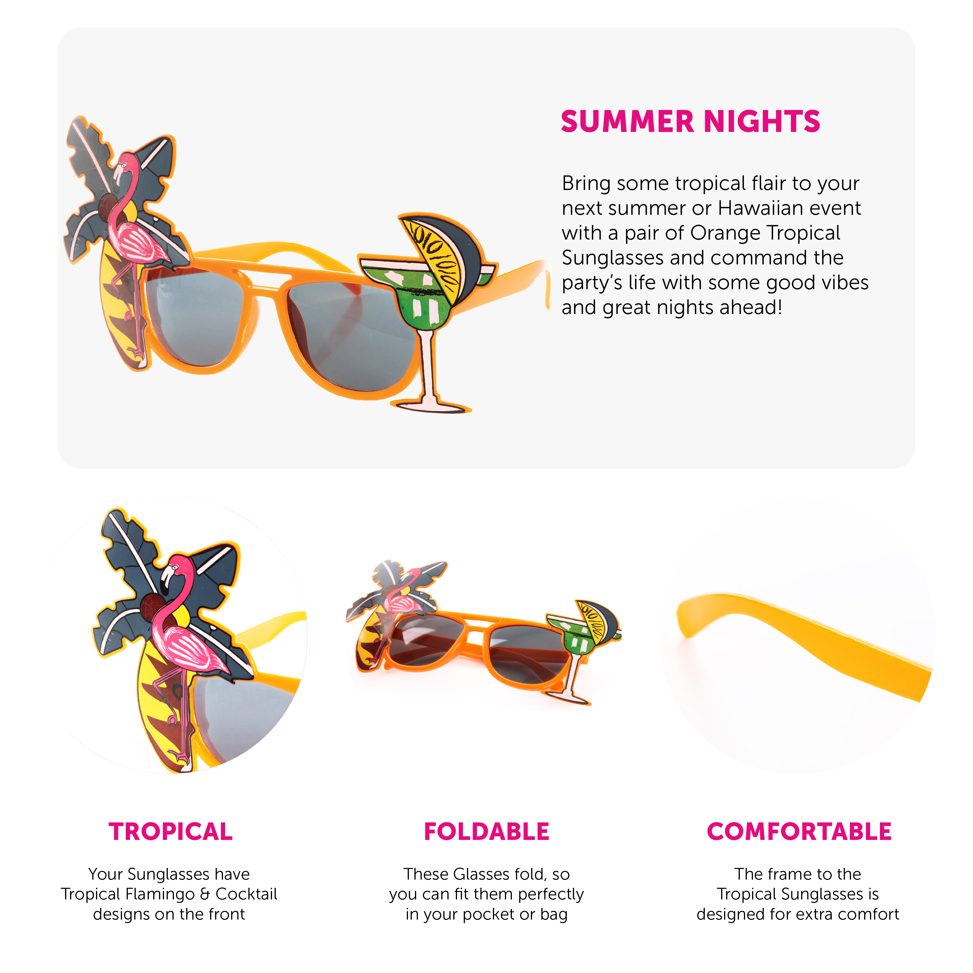 TROPICAL SUNGLASSES DETAILS: Your Tropical Sunglasses have a plastic, vibrant Orange frame with Black Lenses and colourful Flamingo, Palm Tree and Cocktail designs on the front - perfect for any summer party!