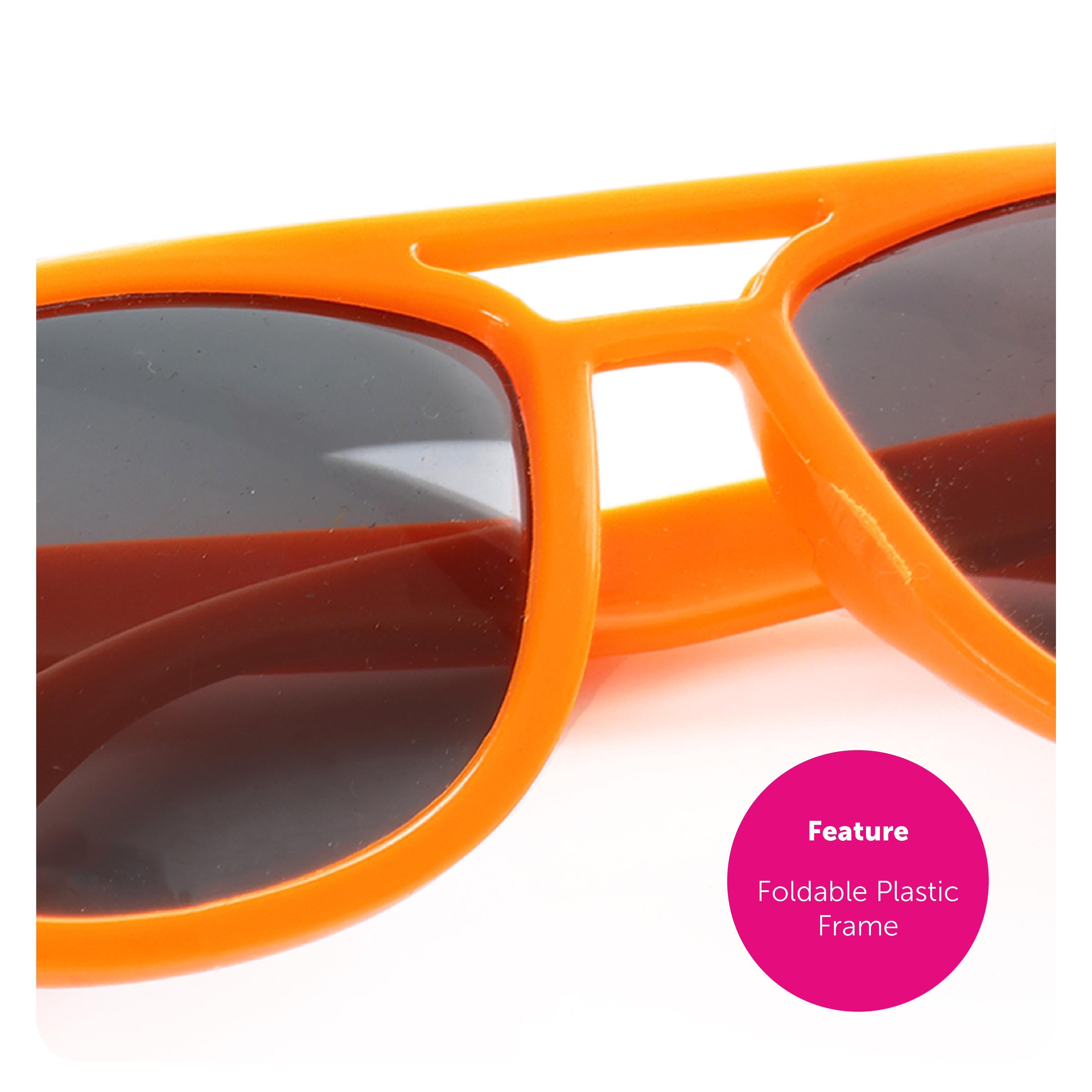 ONE SIZE FITS ALL: No matter the head size, these Orange Tropical Sunglasses will fit most comfortably, and can be stored easily on your travels with their fold down frame!