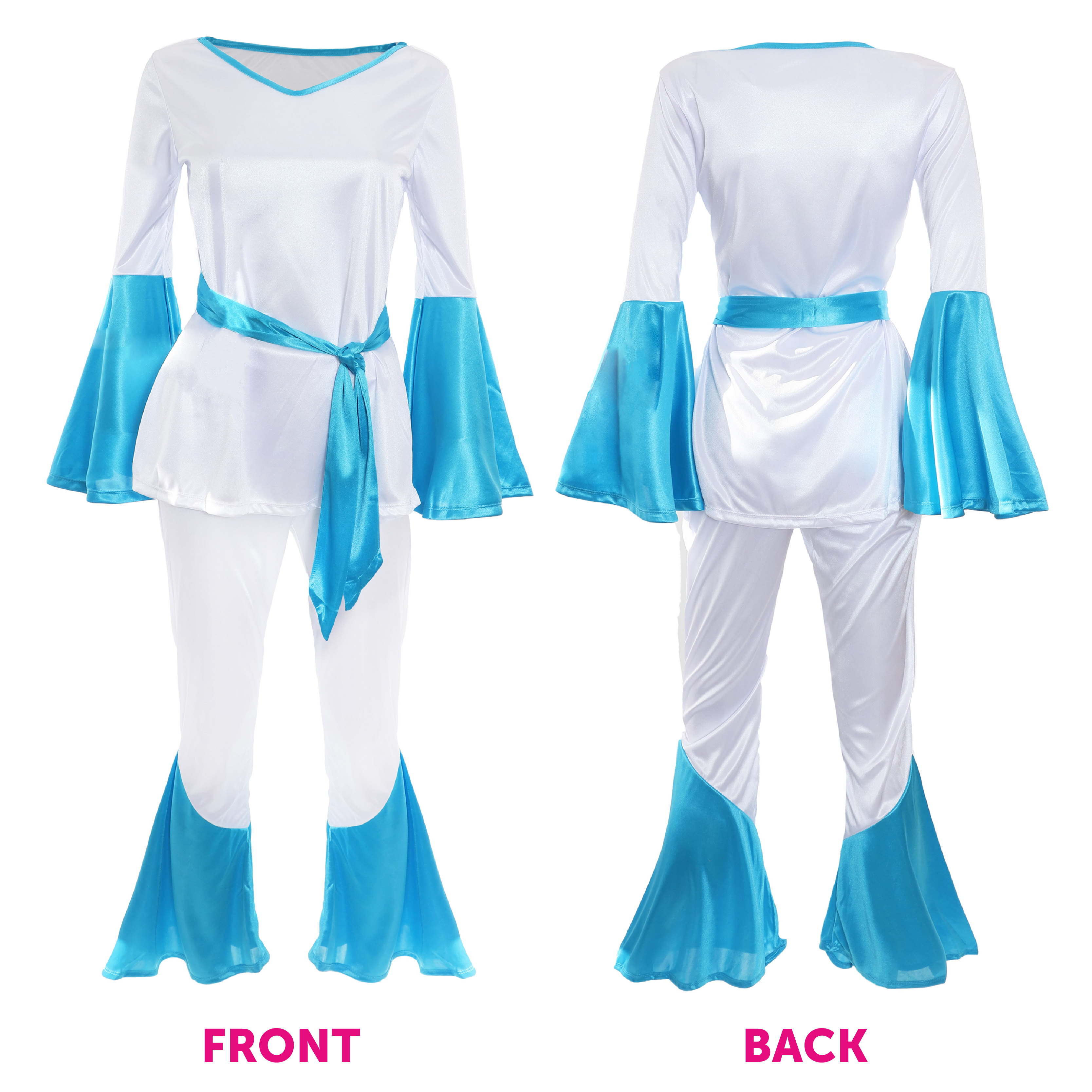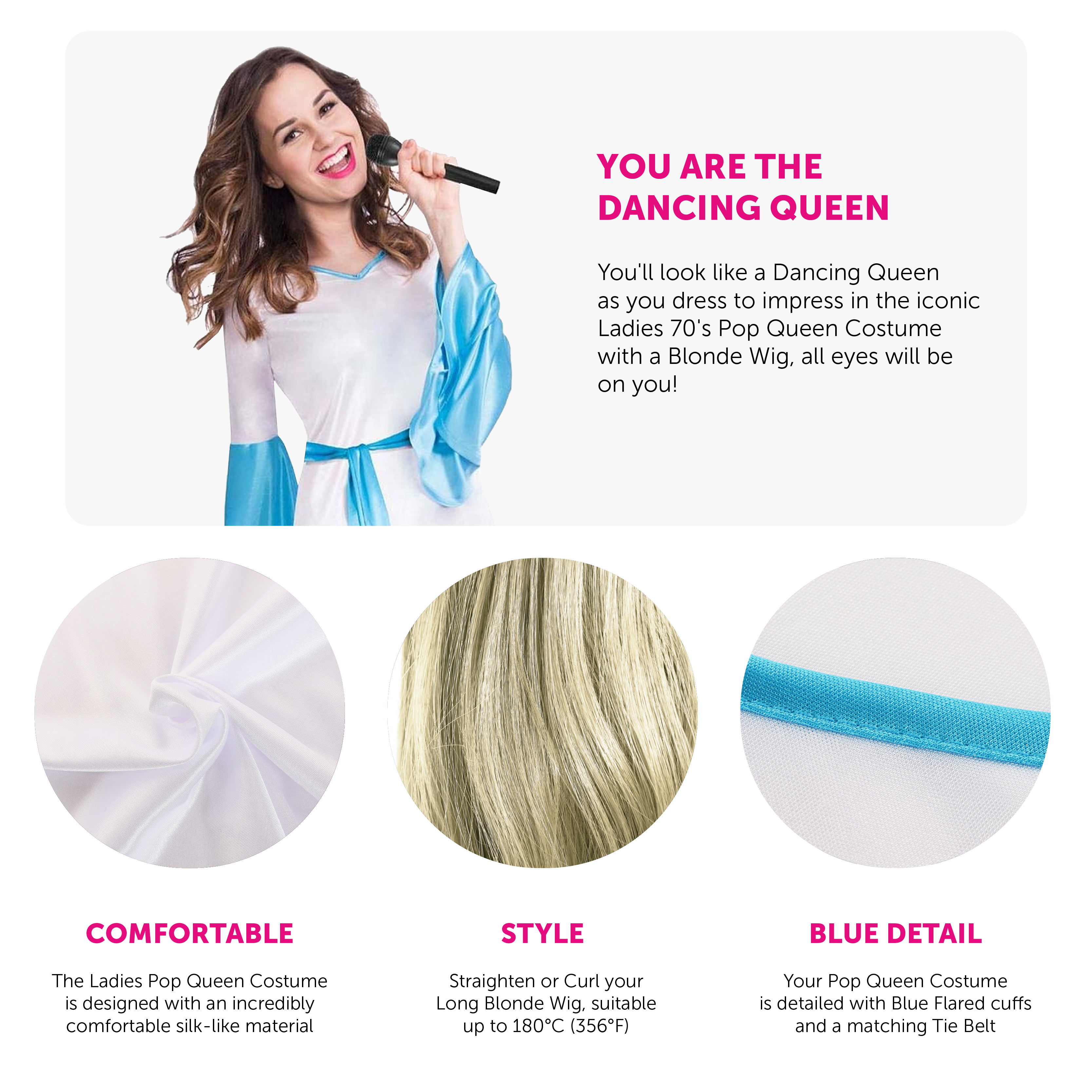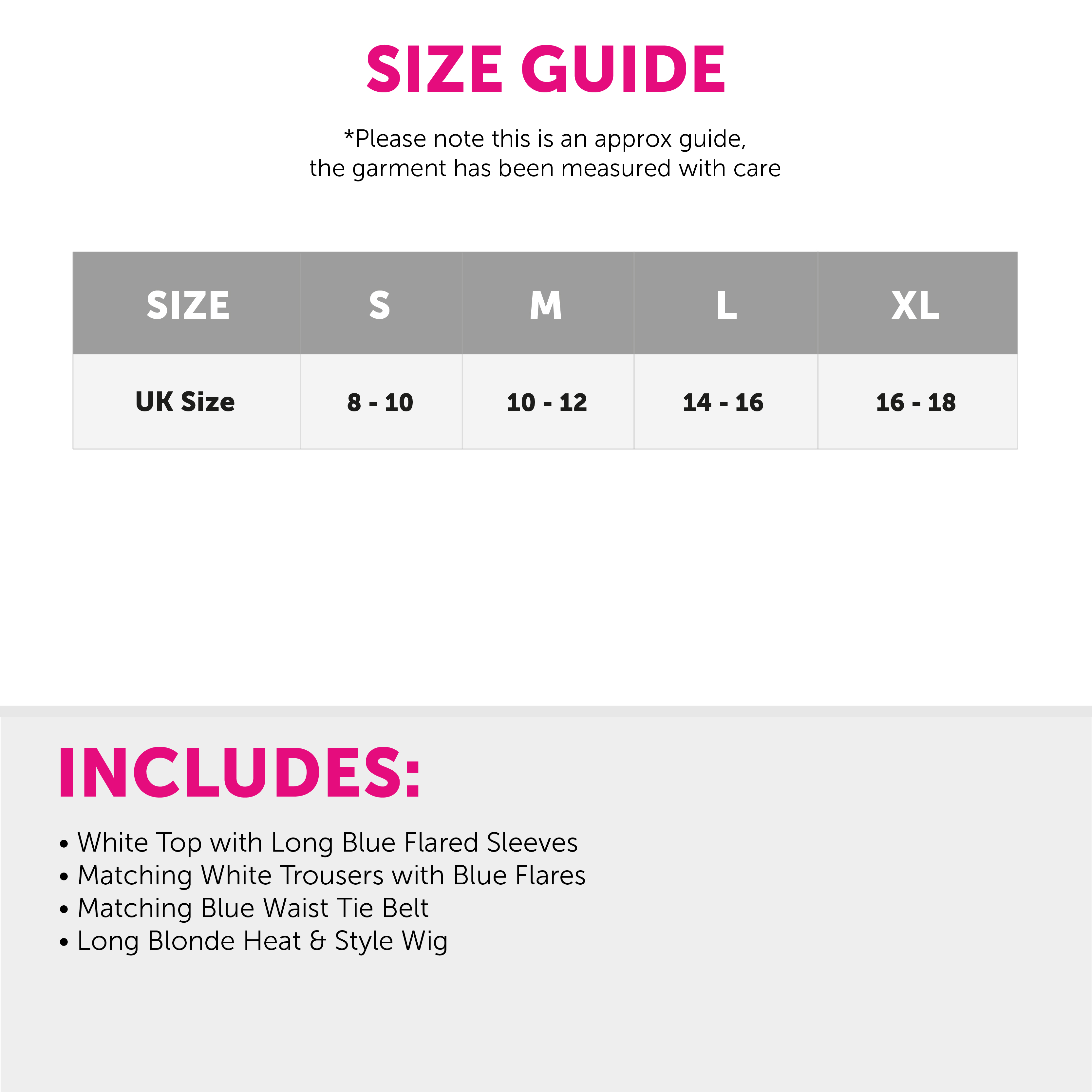 COSTUME DETAILS: This Ladies 70's Pop Queen Costume includes a luscious, light Blonde Wig with a fringe, it is suitable for heat styling in any way you want, a long sleeved White Top with Blue Flared Cuffs, matching White Trousers with Blue Flares and a simple Blue Waist Tie Belt, making it the perfect Costume for any 70's themed event!