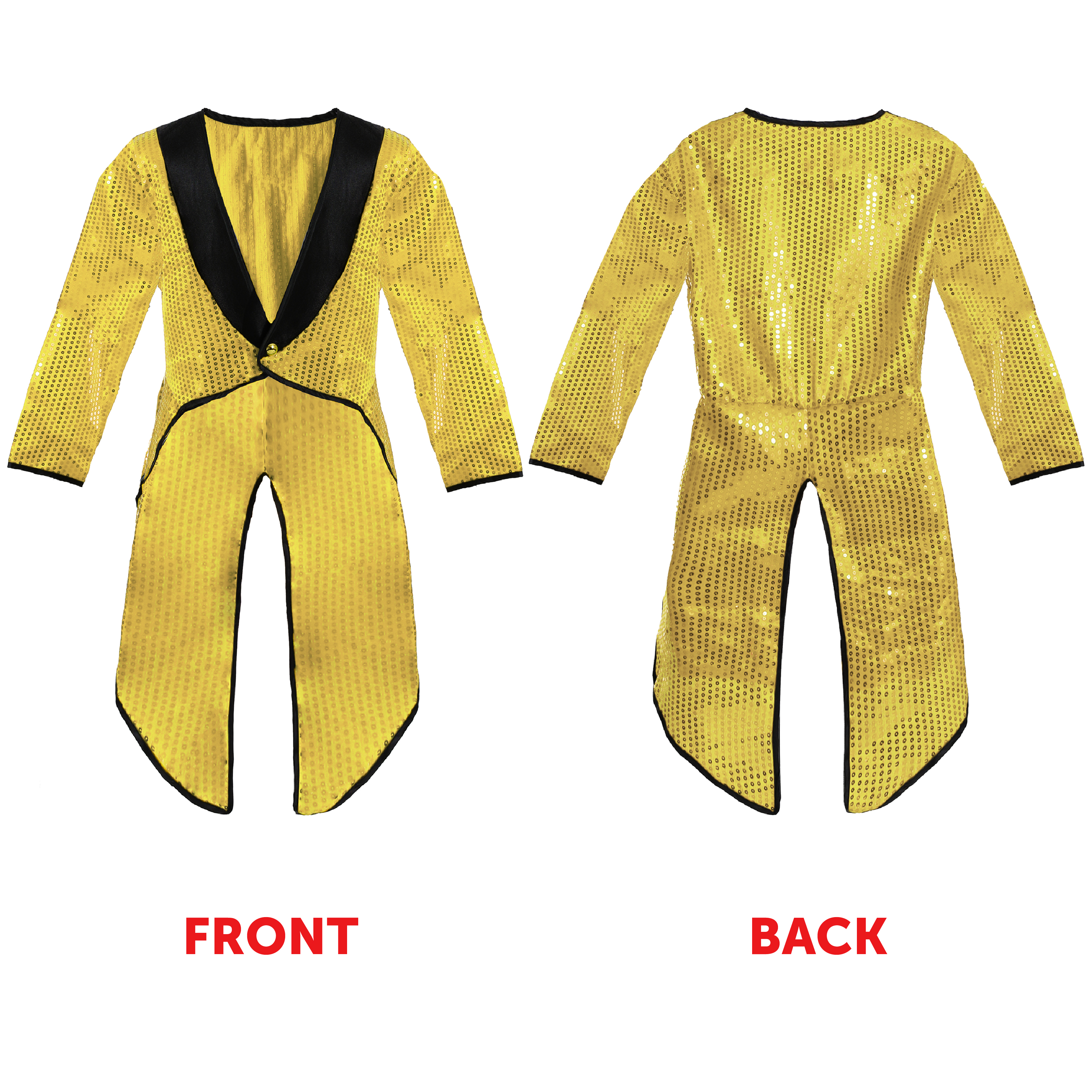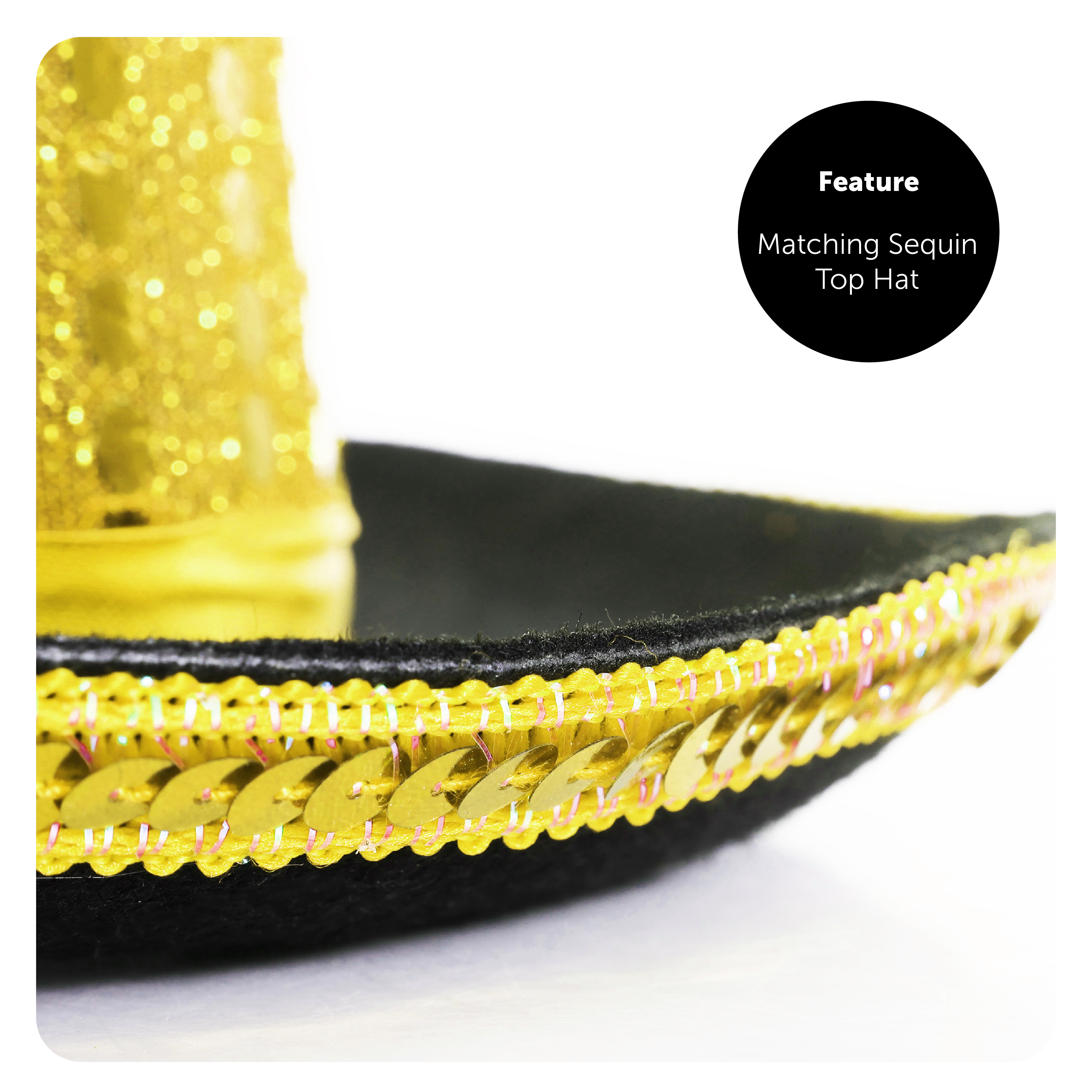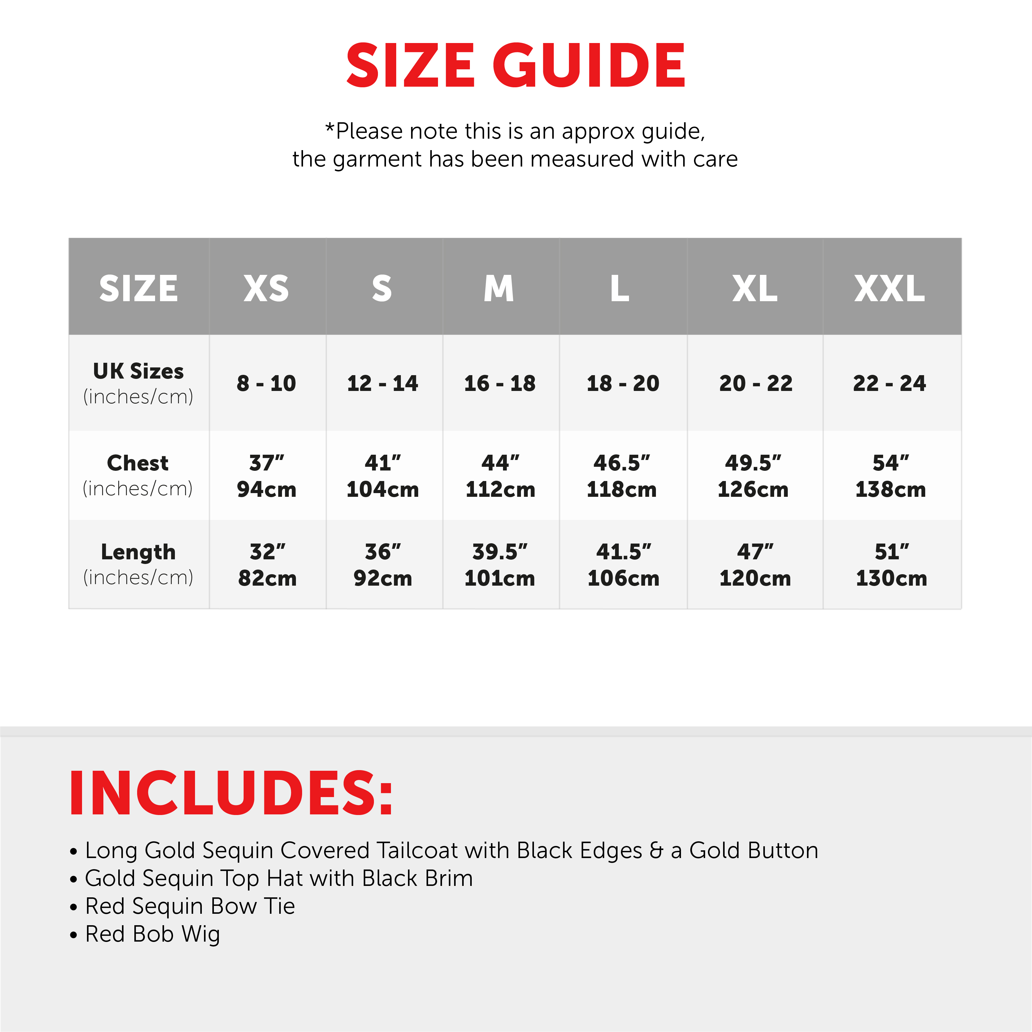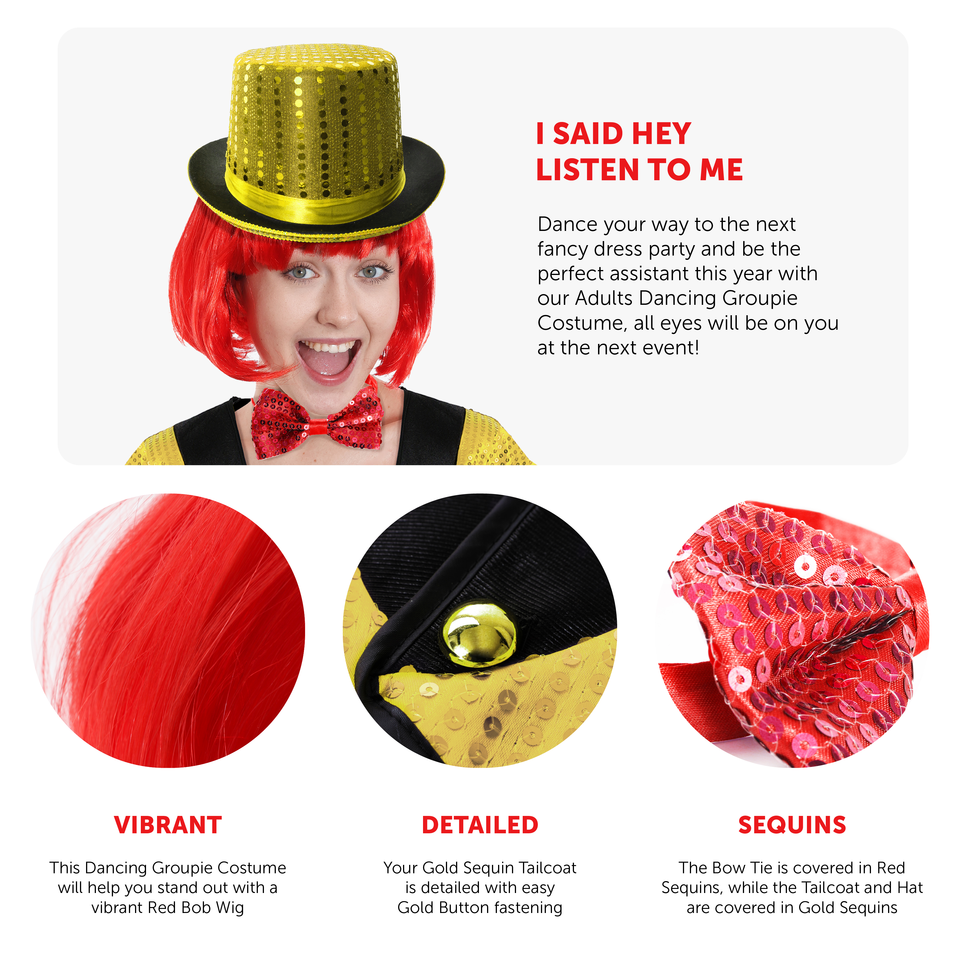 COSTUME INCLUDES: The Adults Dancing Groupie Costume includes a sparkly Gold Top Hat with a Black brim and Sequin detail, a vibrant Red Bob Wig, a long Gold Sequin Tailcoat with button fastening and Black edging, and a Red Sequin Bow Tie with an adjustable strap, the perfect look for any fancy dress event!