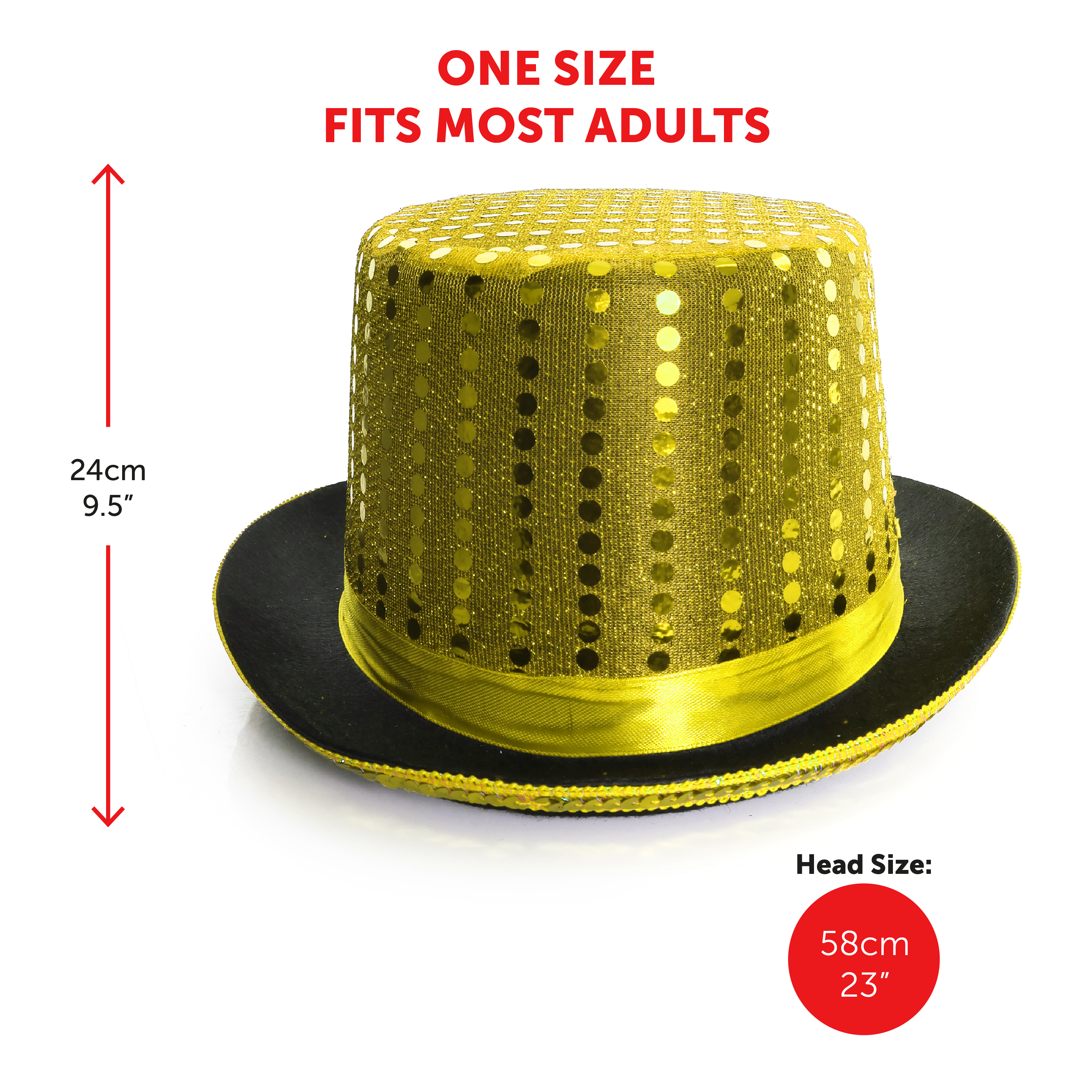 ONE SIZE FITS MOST HAT: The Gold Sequin Top Hat is a great size and fits most Adults comfortably with a height measuring 24cm (9.5"), and a head size of 58cm (23")