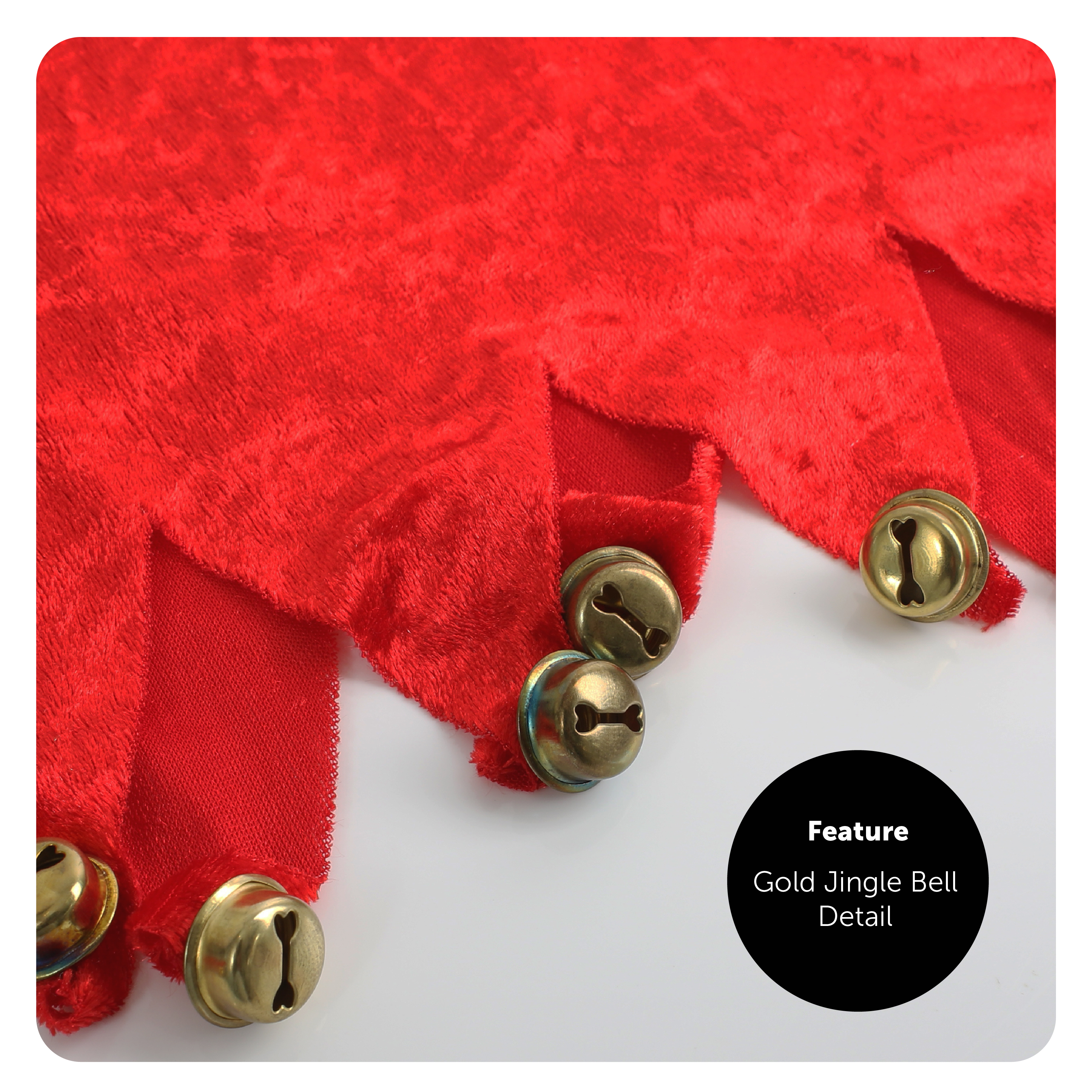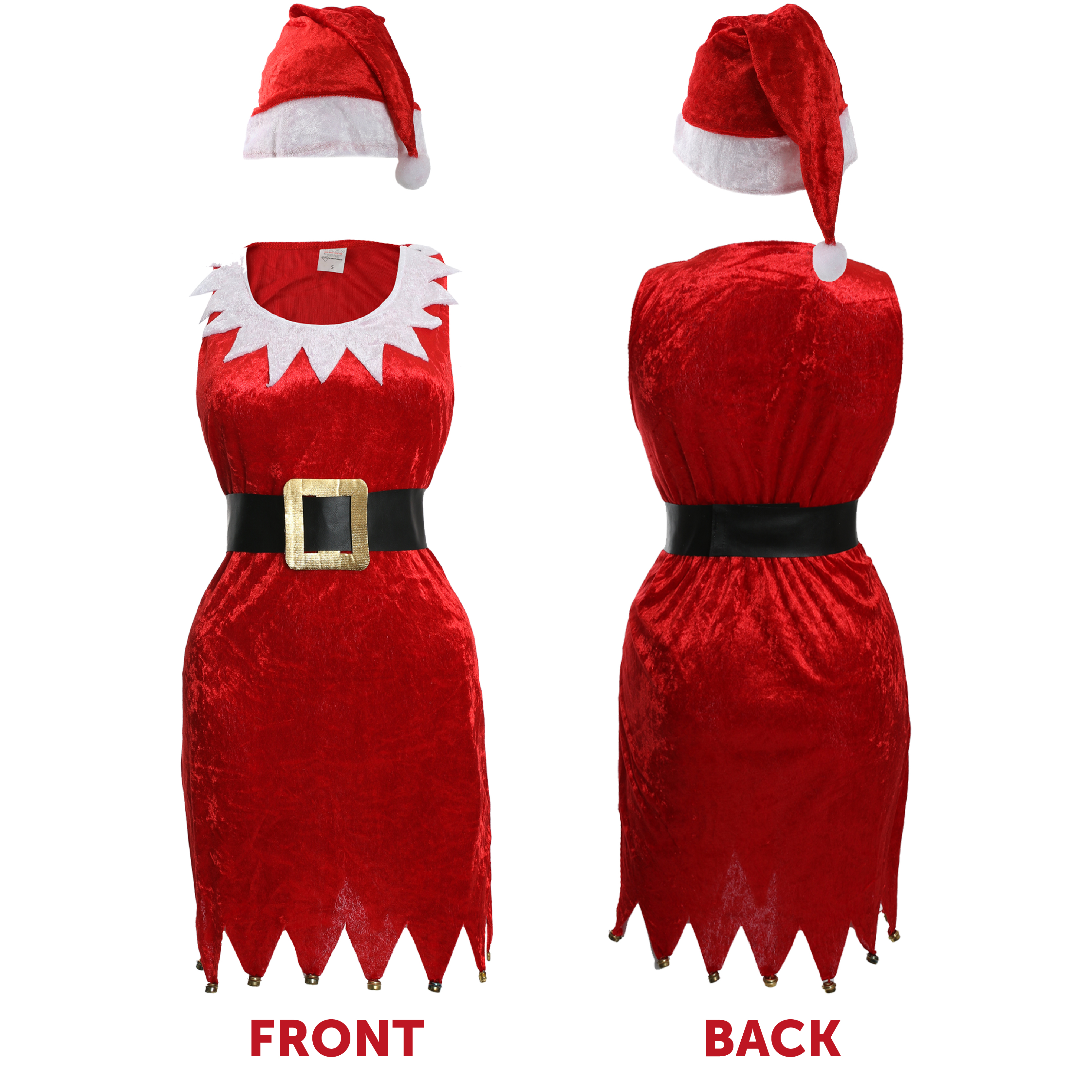 COSTUME INCLUDES: Your Sexy Velour Red Santa Dress will include a Velour Santa dress with a Jagged White collar, black belt with gold buckle, gold bells on the jagged tip edge of the dress, and a matching Velour Santa hat with a white bobble!