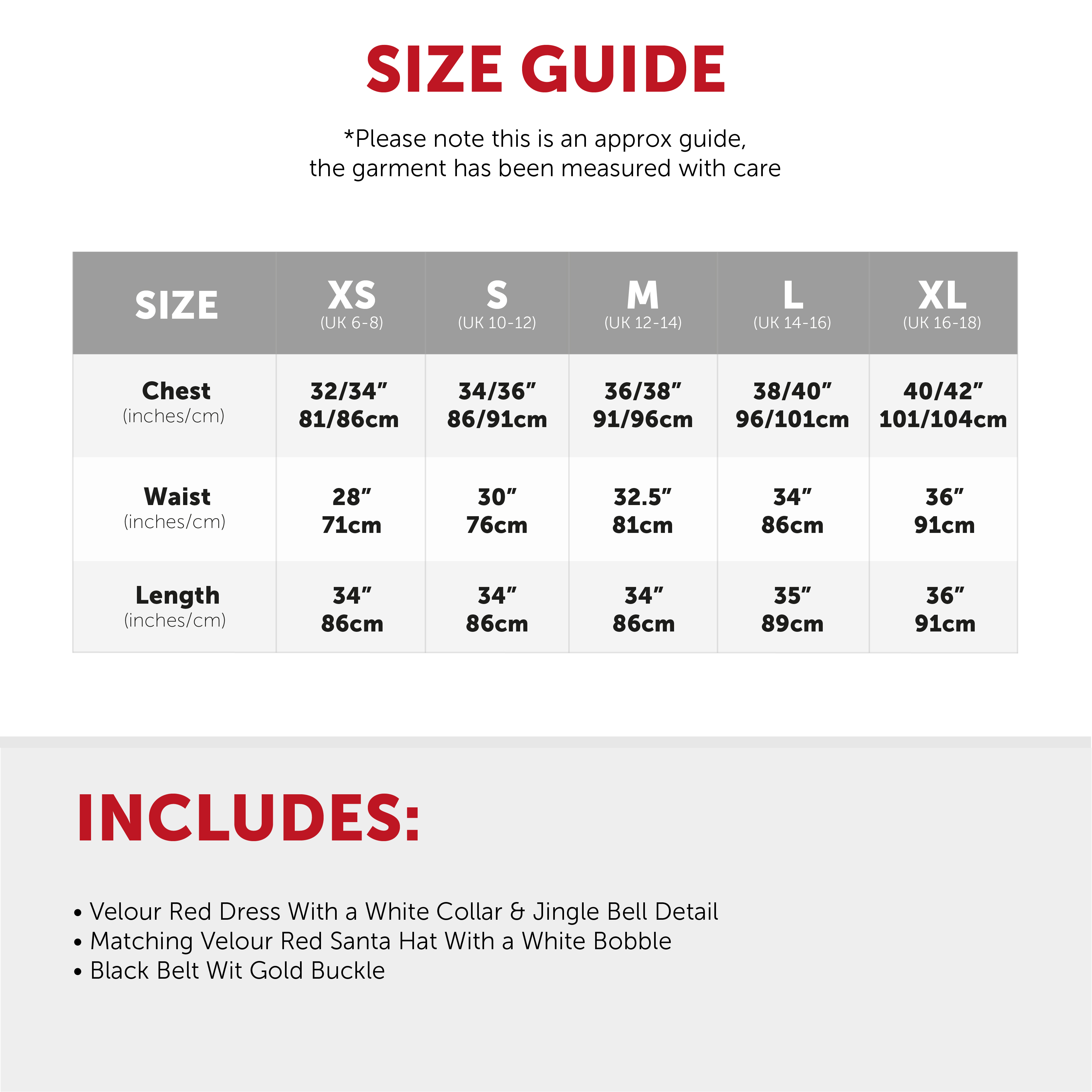 AVAILABLE IN MULTIPLE SIZES: Your Ladies Sexy Velour Santa Dress is available in multiple sizes from X-Small to X-Large: X-Small (UK 6-8) - Bust: 32-34"/81-86cm - Waist: 28"/71cm - Length: 34"/86cm | Small (UK 10-12) - Bust: 34-36"/86-91cm - Waist: 30"/76cm - Length: 34"/86cm | Medium (UK 12-14) - Bust: 36-38"/91-96cm - Waist: 32.5"/81cm - Length: 34"/86cm | Large (UK 14-16) - Bust: 38-40"/96-101cm - Waist: 34"/86cm - Length: 35"/89cm | X-Large (UK 16-18) - Bust: 40-42"/101-104cm - Waist: 36"/91cm - Length: 36"/91cm