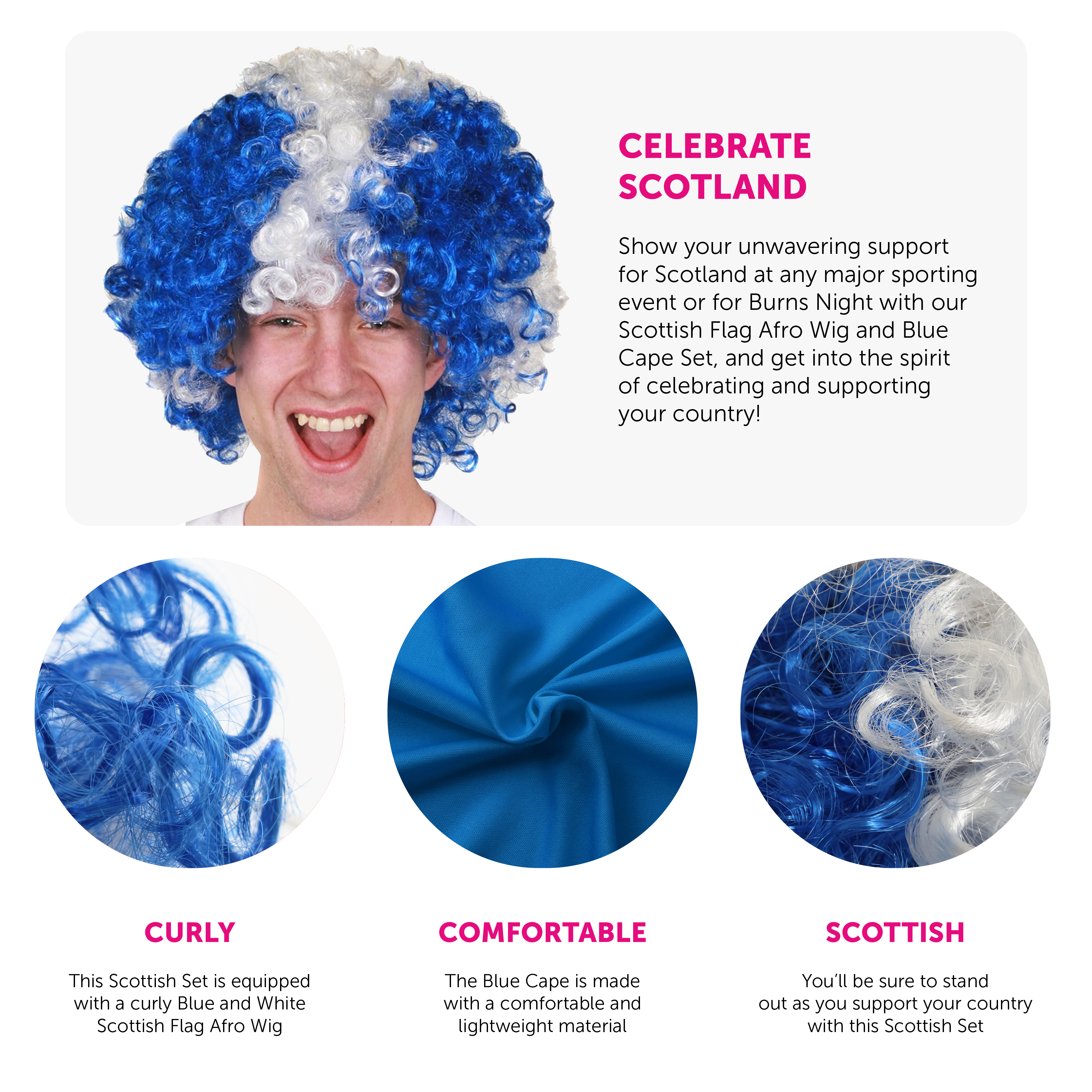 SCOTTISH AFRO WIG & BLUE CAPE: Show your unwavering support for Scotland at any major sporting event or for Burns Night with our Scottish Flag Afro Wig and Blue Cape Set, and get into the spirit of celebrating and supporting your country!