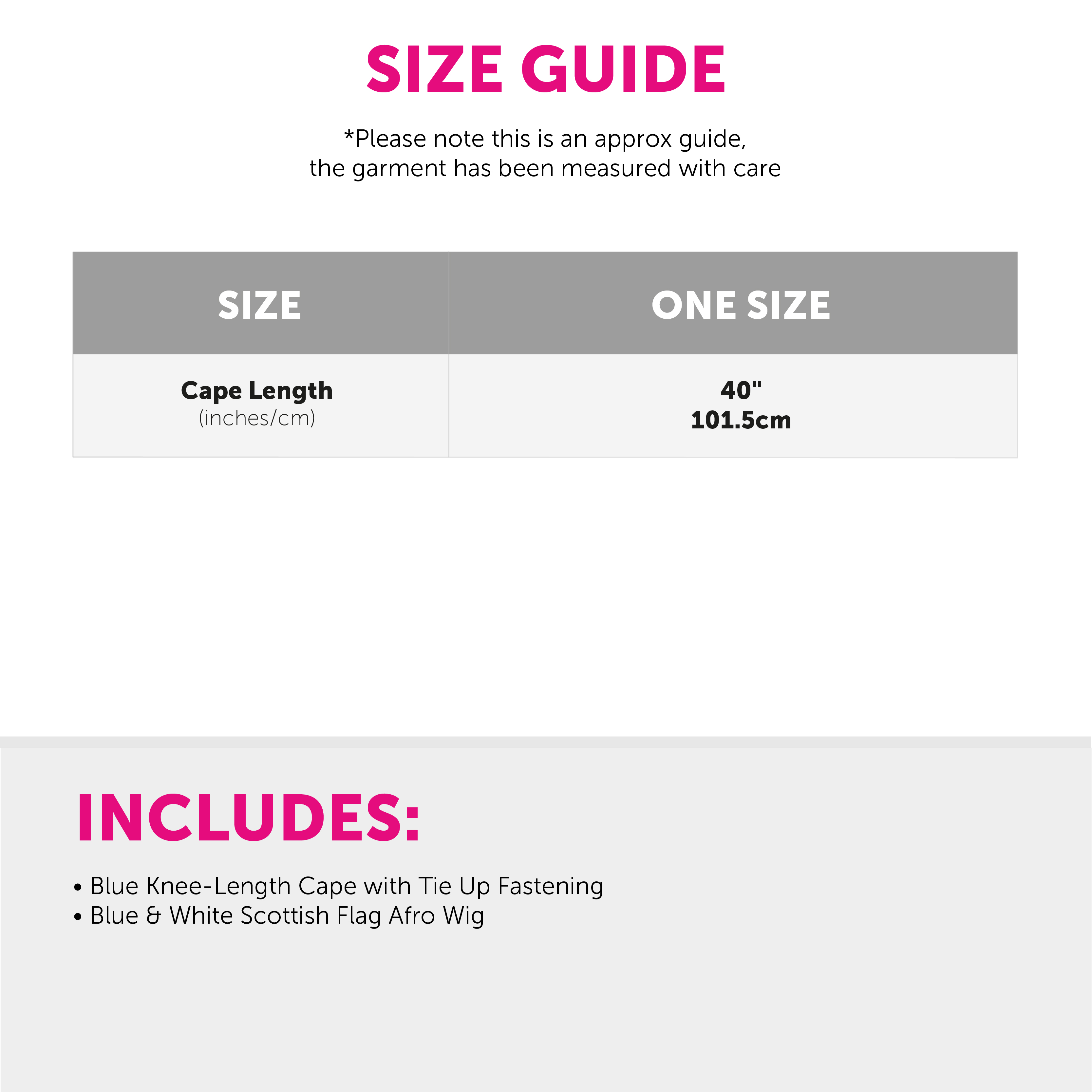 SCOTTISH SET INCLUDES: This Scottish Set includes a Blue and White Scottish Flag Afro Wig, and a Blue, knee-length Cape with a tie up front for a comfortable fit, the perfect look for all Scottish events!