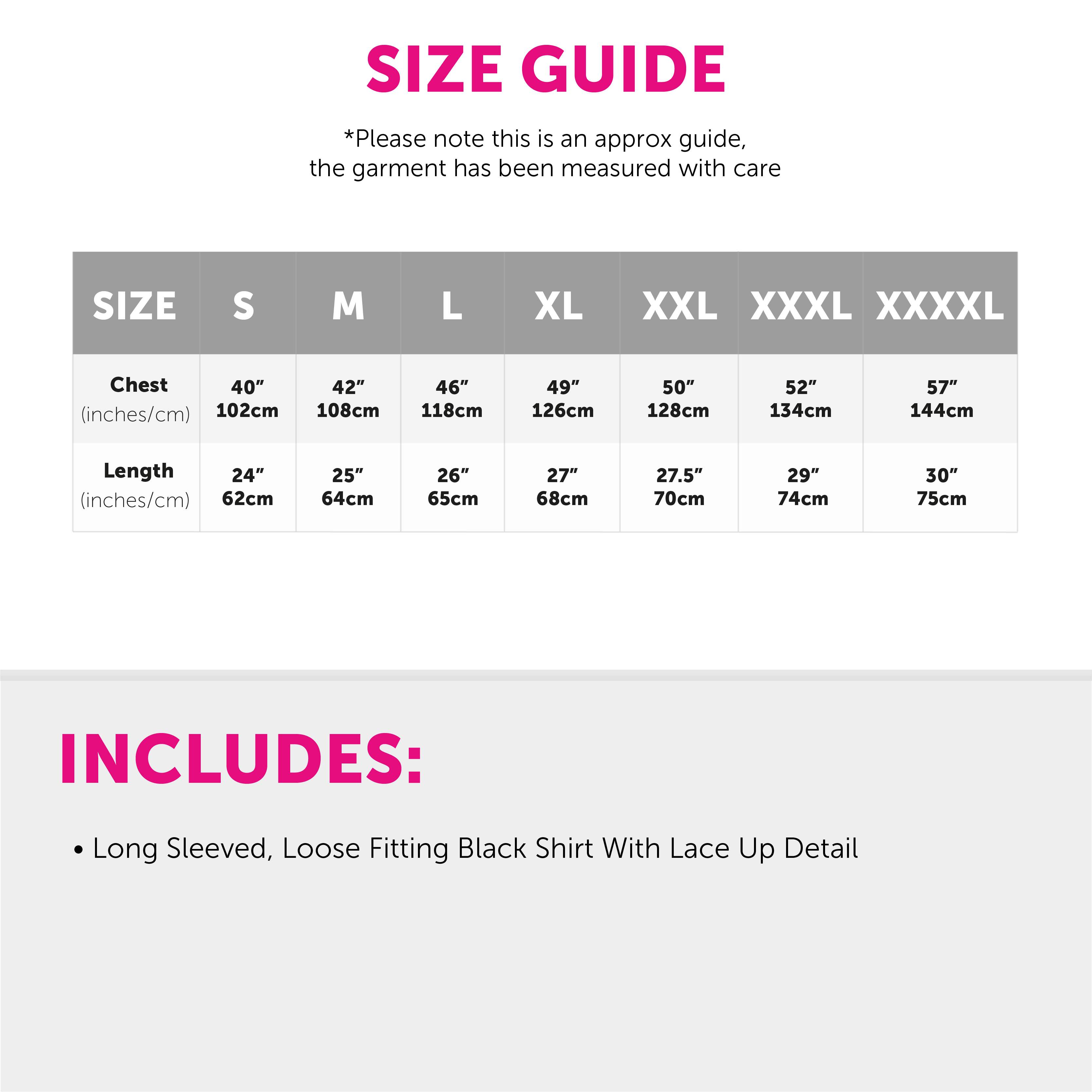 AVAILABLE IN MULTIPLE SIZES: Your Adults Black Gothic Shirts are available in multiple sizes from Small to XXXX-Large: Small - Chest: 40" (102cm), Length: 24" (62cm) | Medium - Chest: 42" (108cm), Length: 25" (64cm) | Large - Chest: 46" (118cm), Length: 26" (65cm) | X-Large - Chest: 49" (126cm), Length: 27" (68cm) | XX-Large - Chest: 50" (128cm), Length: 27.5" (70cm) | XXX-Large - Chest: 52" (134cm), Length: 29" (74cm) | XXXX-Large - Chest: 57" (144cm), Length: 30" (75cm)