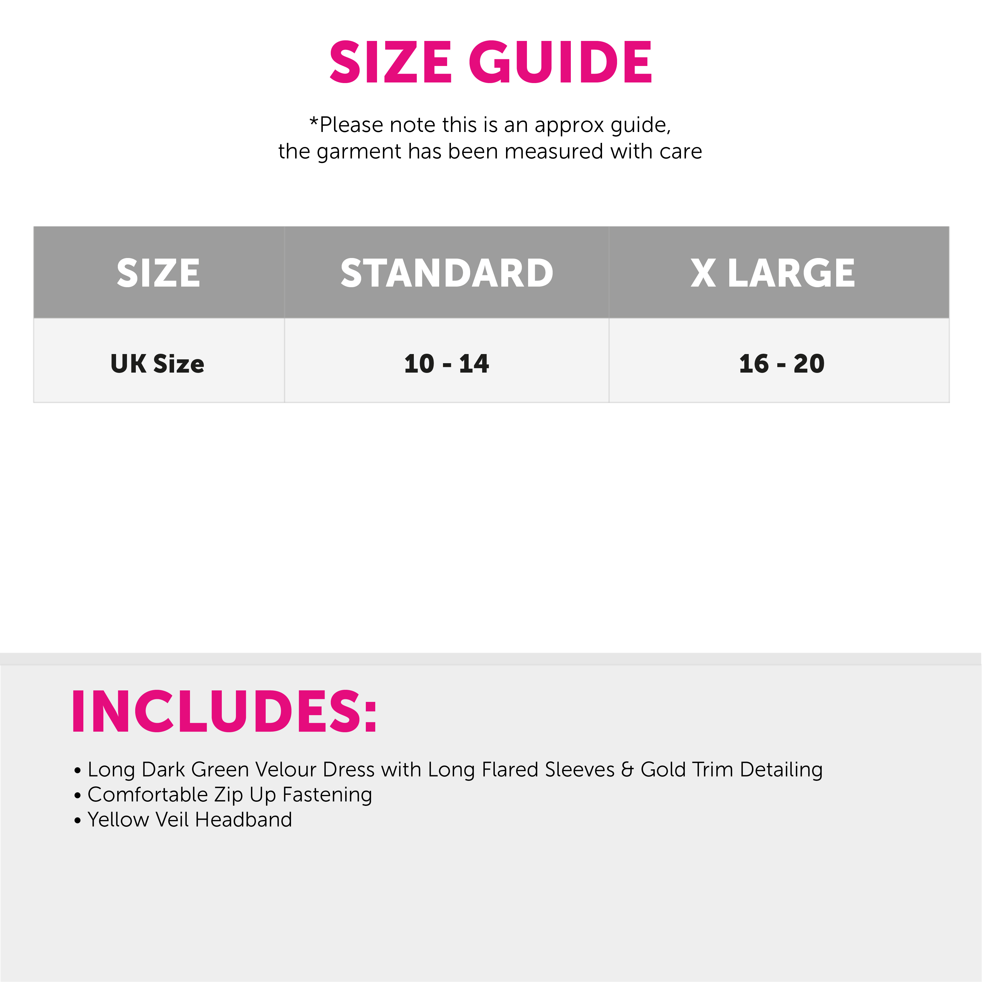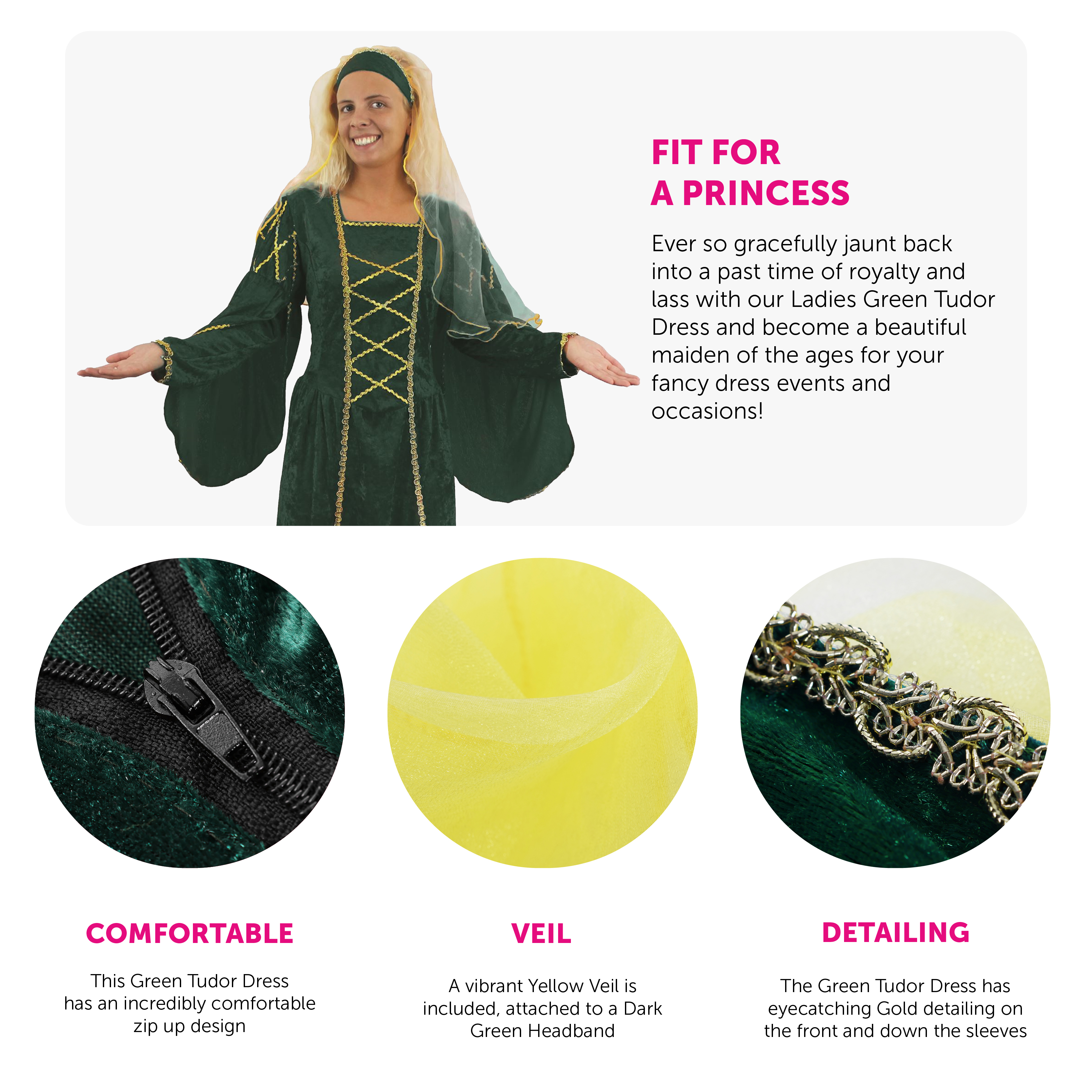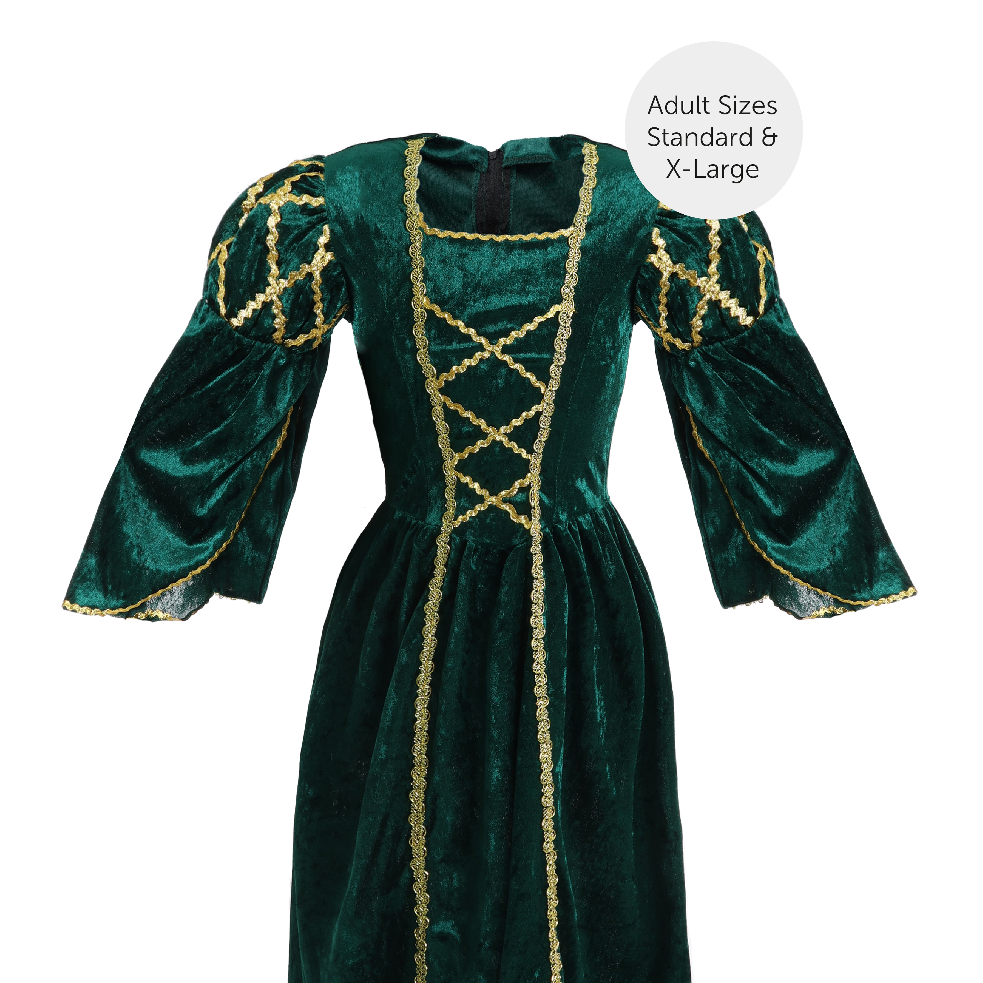 AVAILABLE IN TWO SIZES: Your Ladies Green Tudor Dress is available in two sizes from Standard to X-Large: Standard - UK 10 - 14 | X-Large - UK 16 - 20
