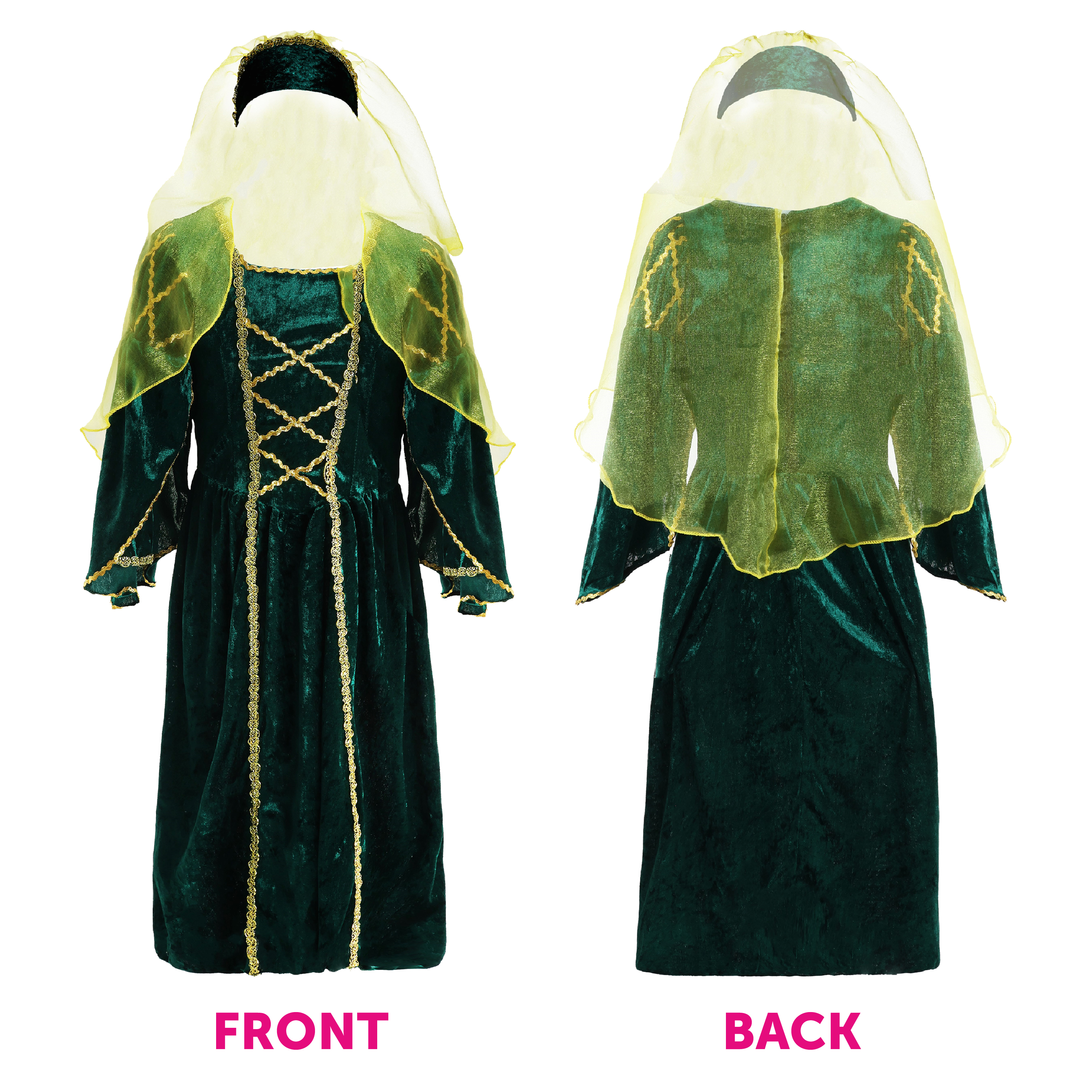 COSTUME INCLUDES: This Ladies Tudor Dress is a floor length, Long-Sleeved Green Velour Dress with a Gold Braiding Detail, and a matching Netted Headpiece to complete the costume perfectly!