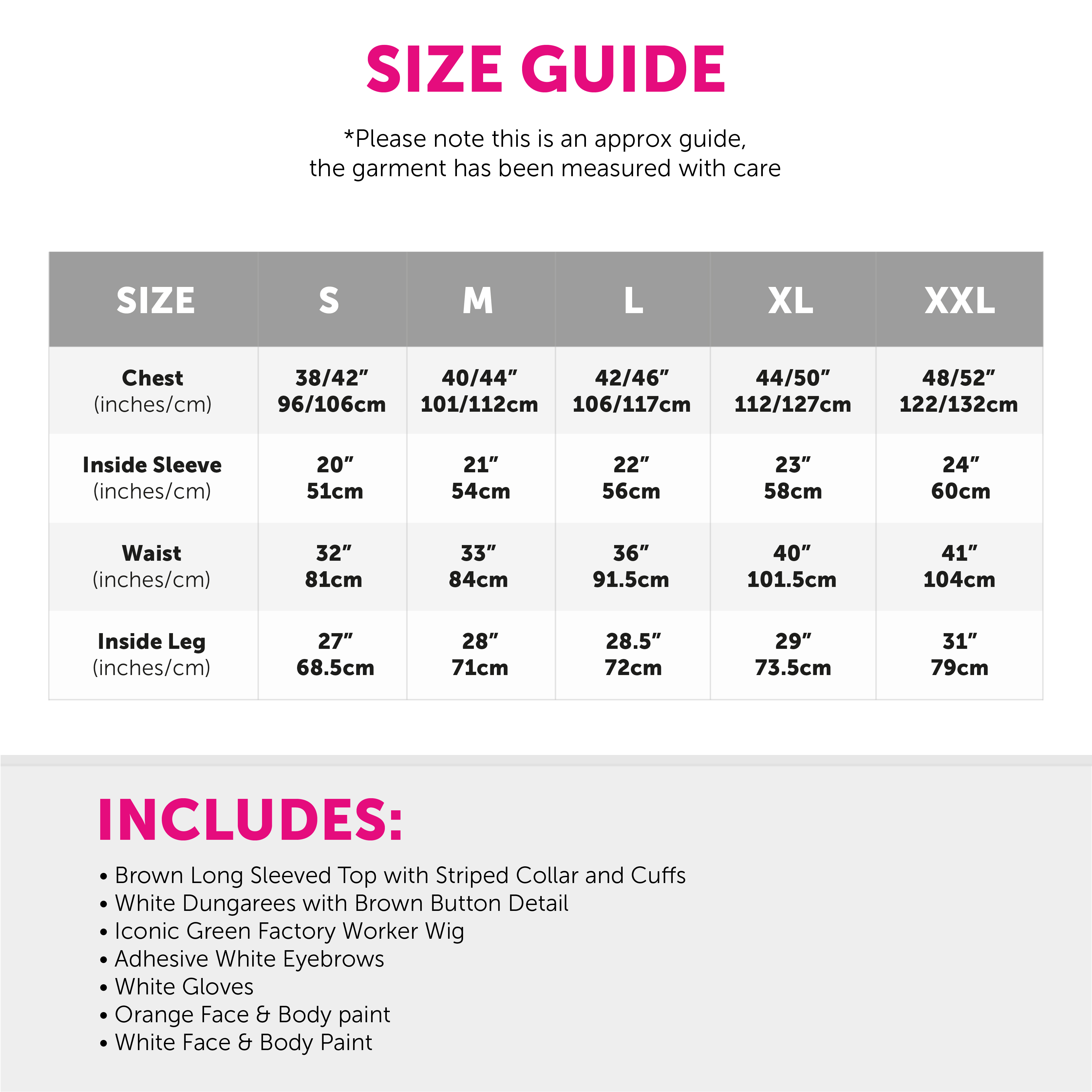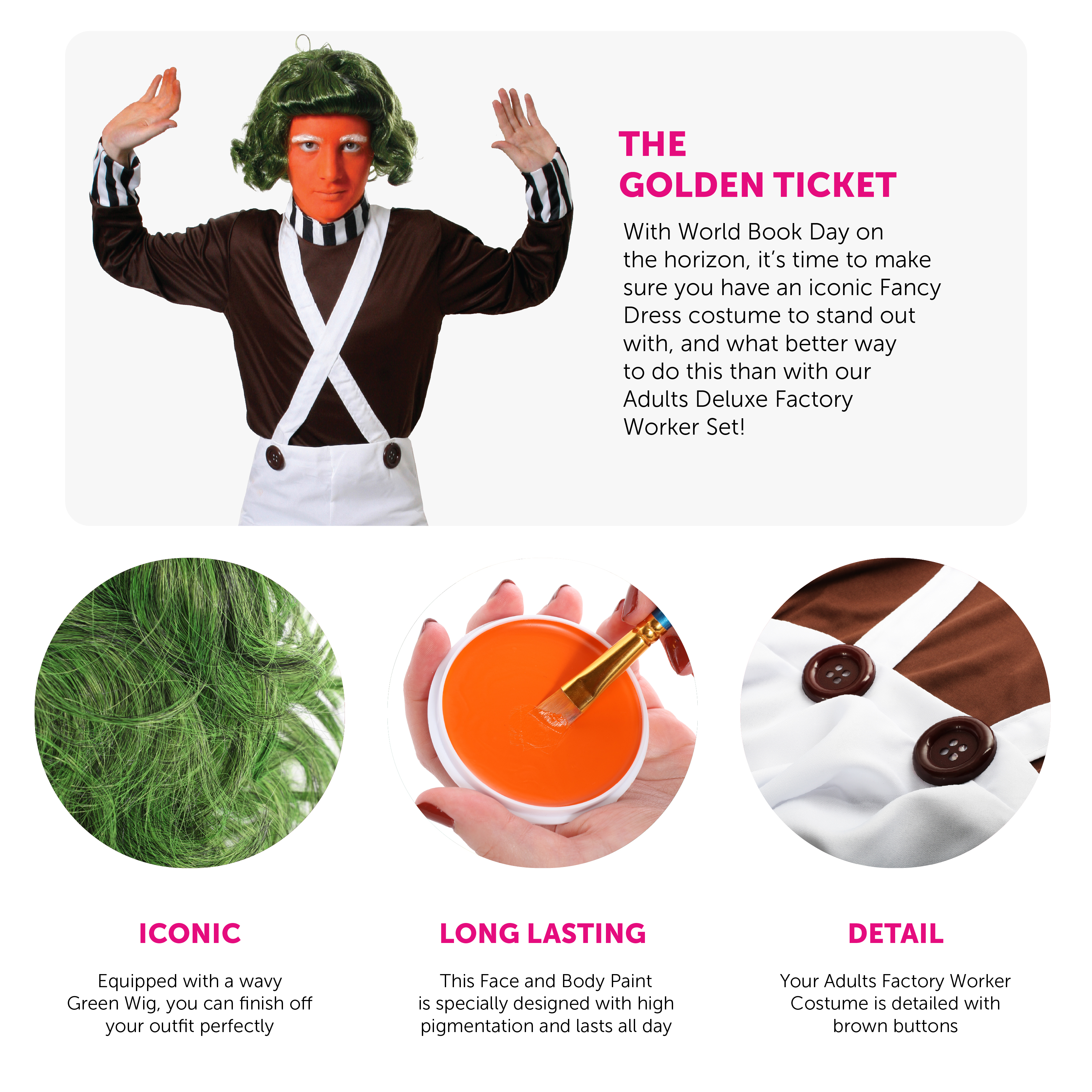 COSTUME DETAILS: This Adults Deluxe Factory Worker Costume includes a Brown Long-Sleeved Top with Striped Collar and Cuffs, White Dungarees with Crossed Straps, an iconic Green Wig, Adhesive White Eyebrows, White Gloves, a palette of Orange Face and Body Paint, and a palette of White Face and Body Paint, the perfect Costume for World Book Day and other events!