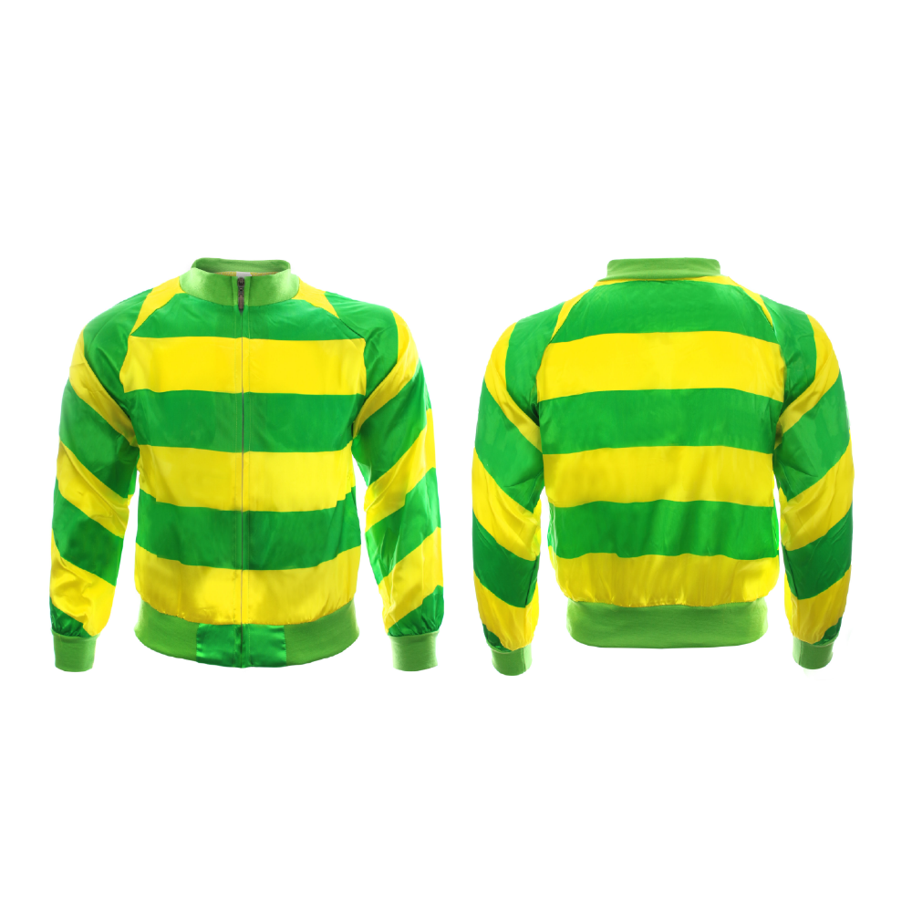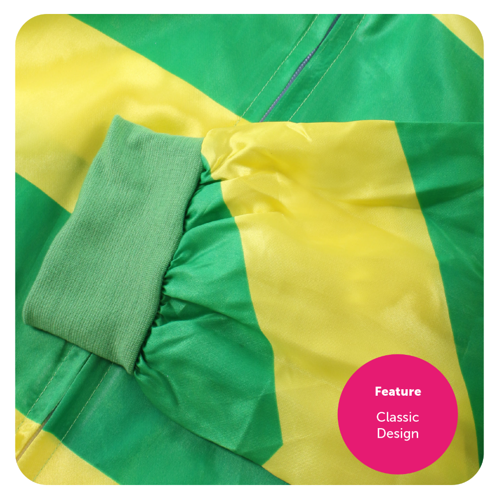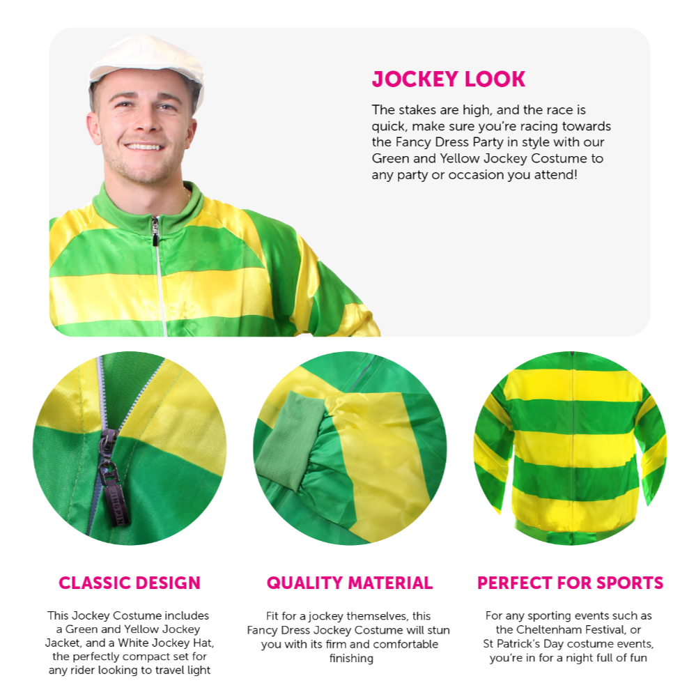COSTUME INCLUDES: This Adults Jockey Costume includes a Yellow and Green Striped Jockey Jacket, and a White Jockey Hat, the perfectly compact set for any rider looking to travel light!