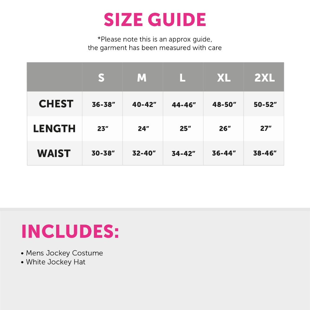 AVAILABLE IN MULTIPLE SIZES: Our Adults Jockey Costume is available in multiple sizes from Small – XX-Large: SMALL - CHEST: 40" (102cm), LENGTH: 23" (58cm) | MEDIUM - CHEST: 42" (107cm), LENGTH: 24" (61cm) | LARGE - CHEST: 46” (117cm), LENGTH: 25” (63.5cm) | X-LARGE - CHEST: 50” (127cm), LENGTH: 26” (66cm) | XX-LARGE - CHEST: 52” (132cm), LENGTH: 27” (68.5)