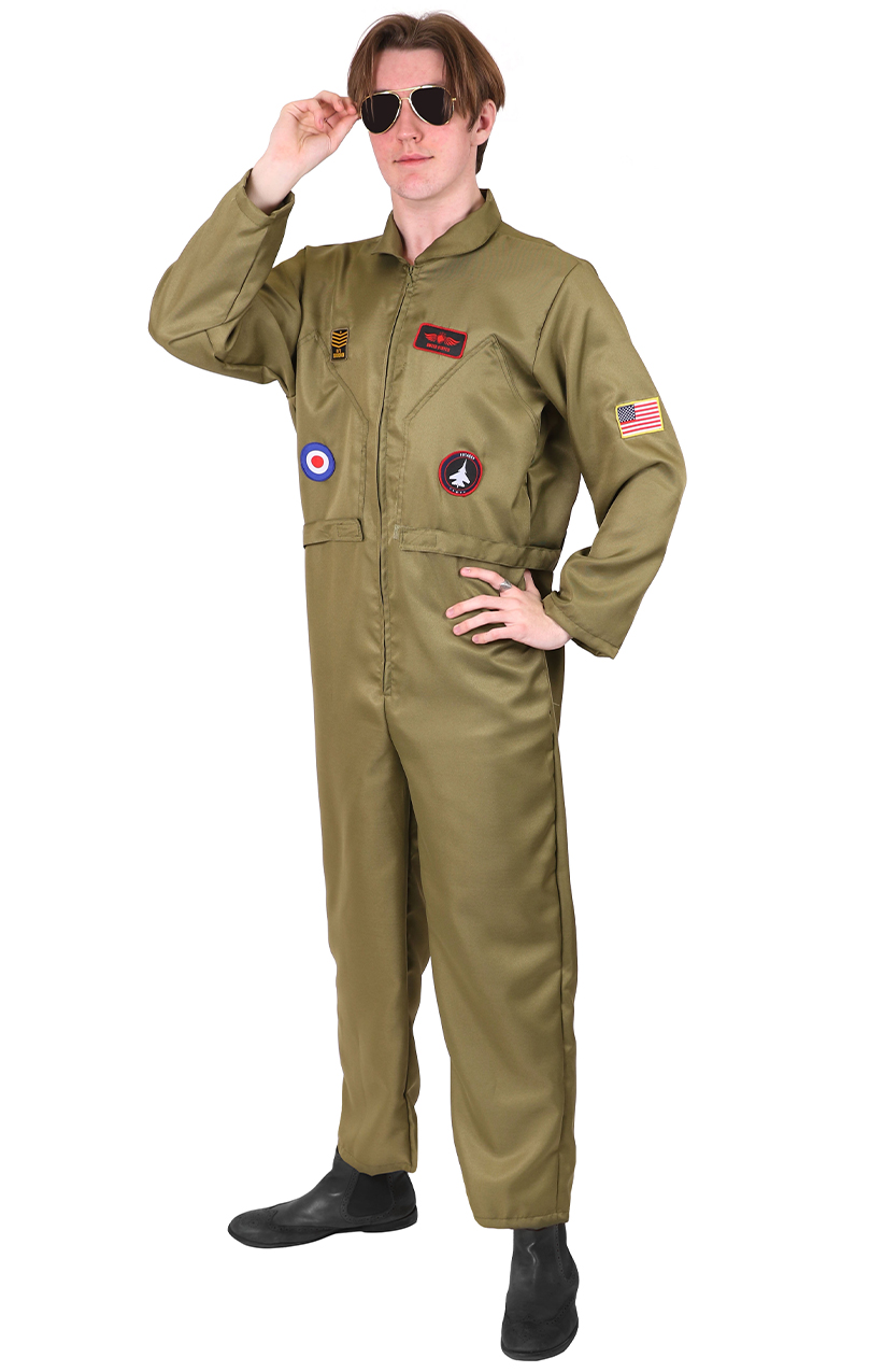 COSTUME DETAILS: The Adults Fighter Pilot Costume is a Khaki Green, Long Sleeved Boiler Suit with an easy zip-up design, and detailed with embroidered Aviation Badges, the perfect look for any fancy dress occasion!