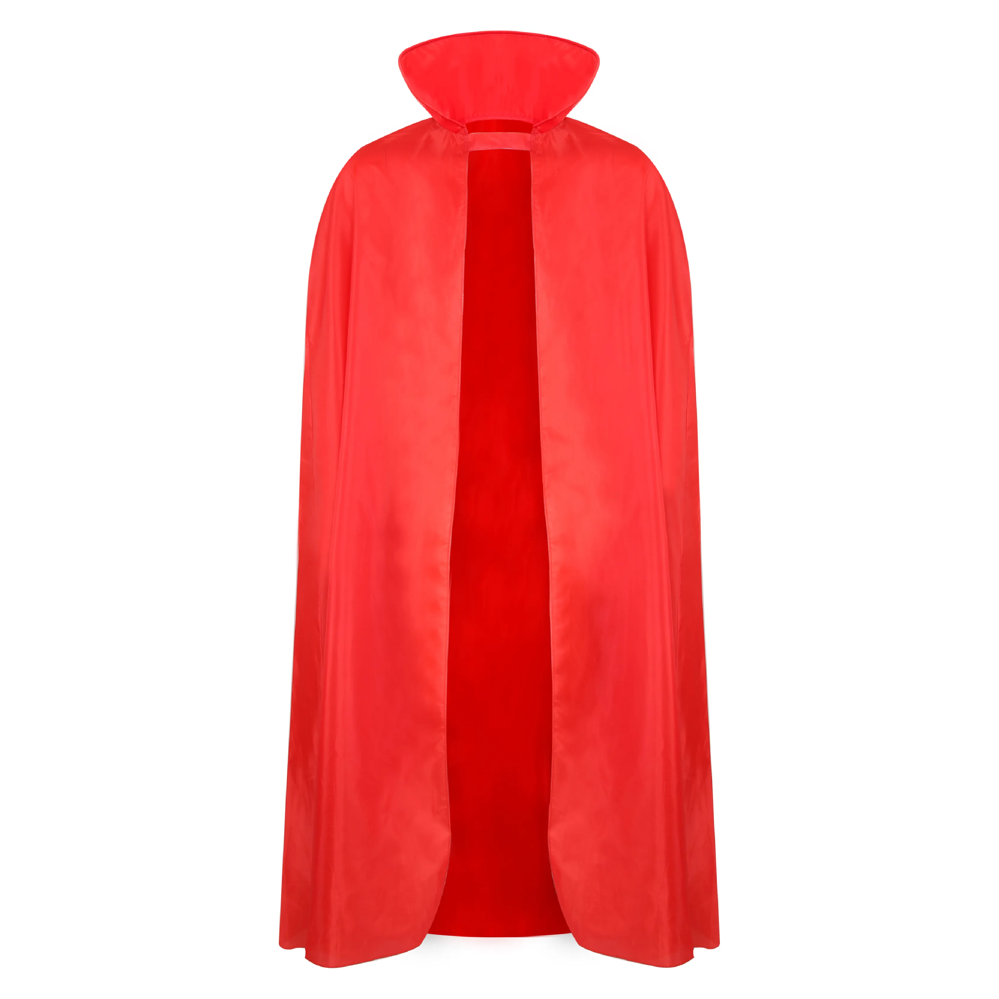 Command attention in this striking long red cape, complete with an attached hook-and-loop neck tie and a tall stand-up collar for that classic devilish, vampire, or witch look.