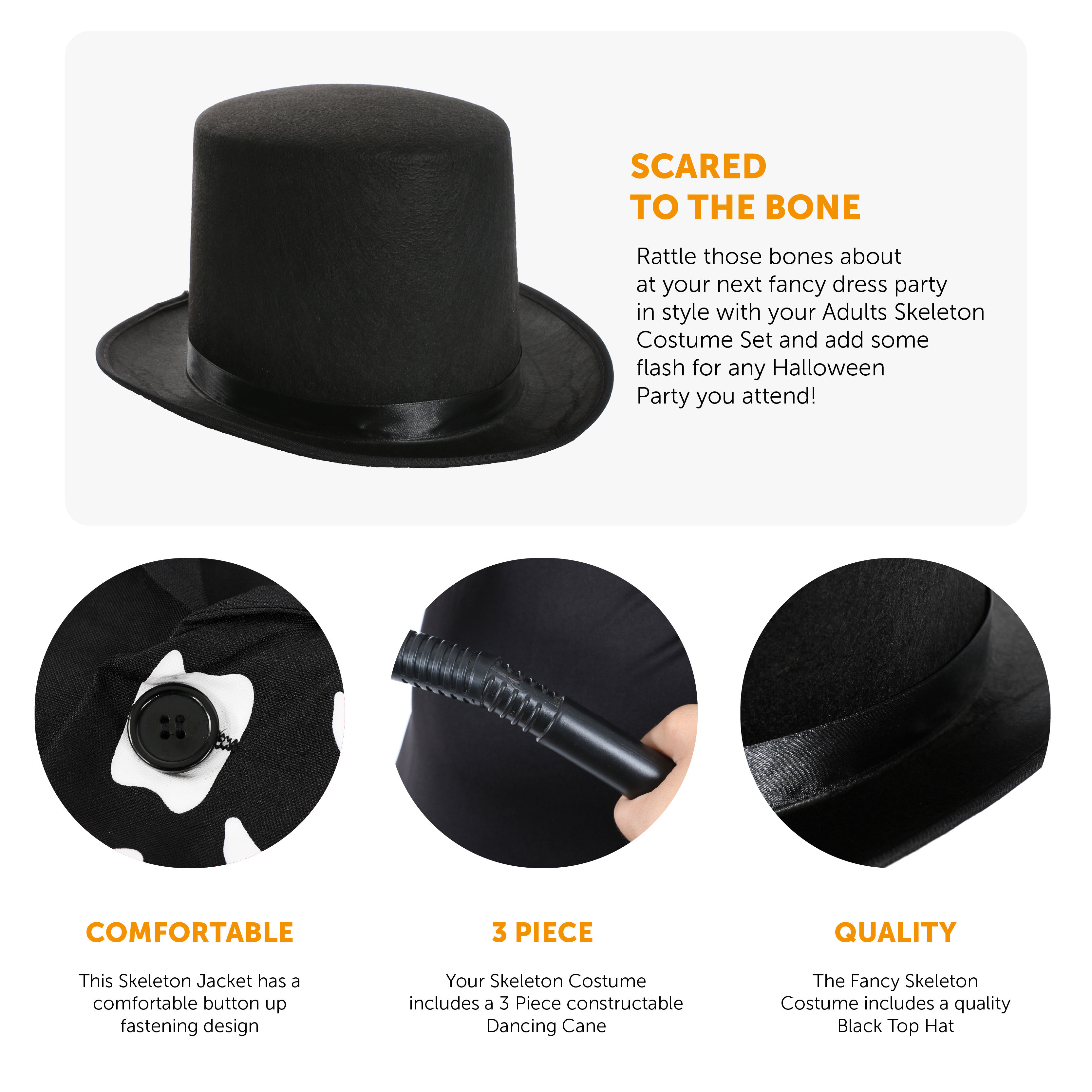 COSTUME INCLUDES: Your Adults Skeleton Costume includes a Long Black Jacket with a Skeleton Print on the front, a Black Tie with a Skeleton Bone design, a Plastic White Skull Mask with an elastic strap, a 3 Piece Dancing Cane, and a Black Top Hat, the perfect Halloween Costume!