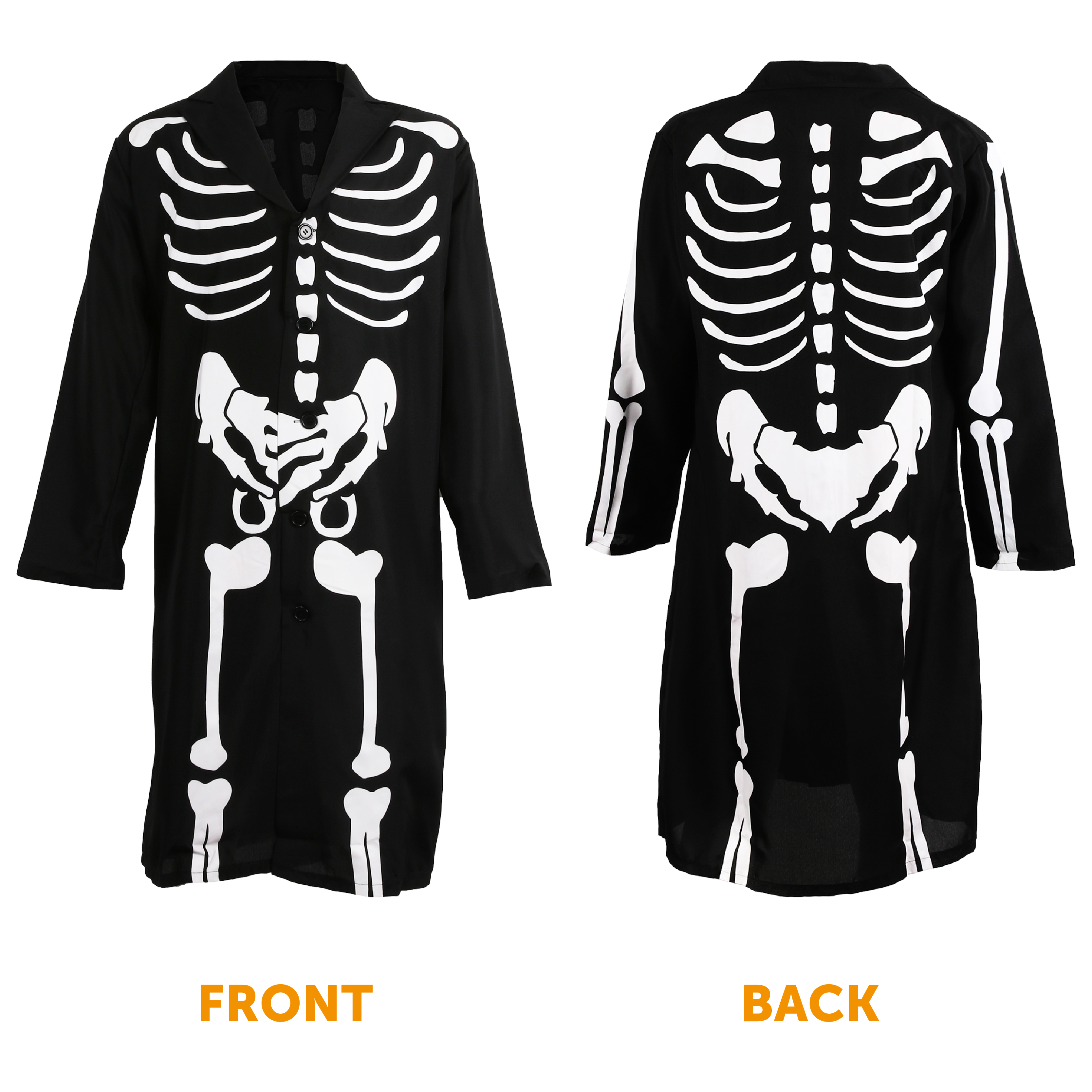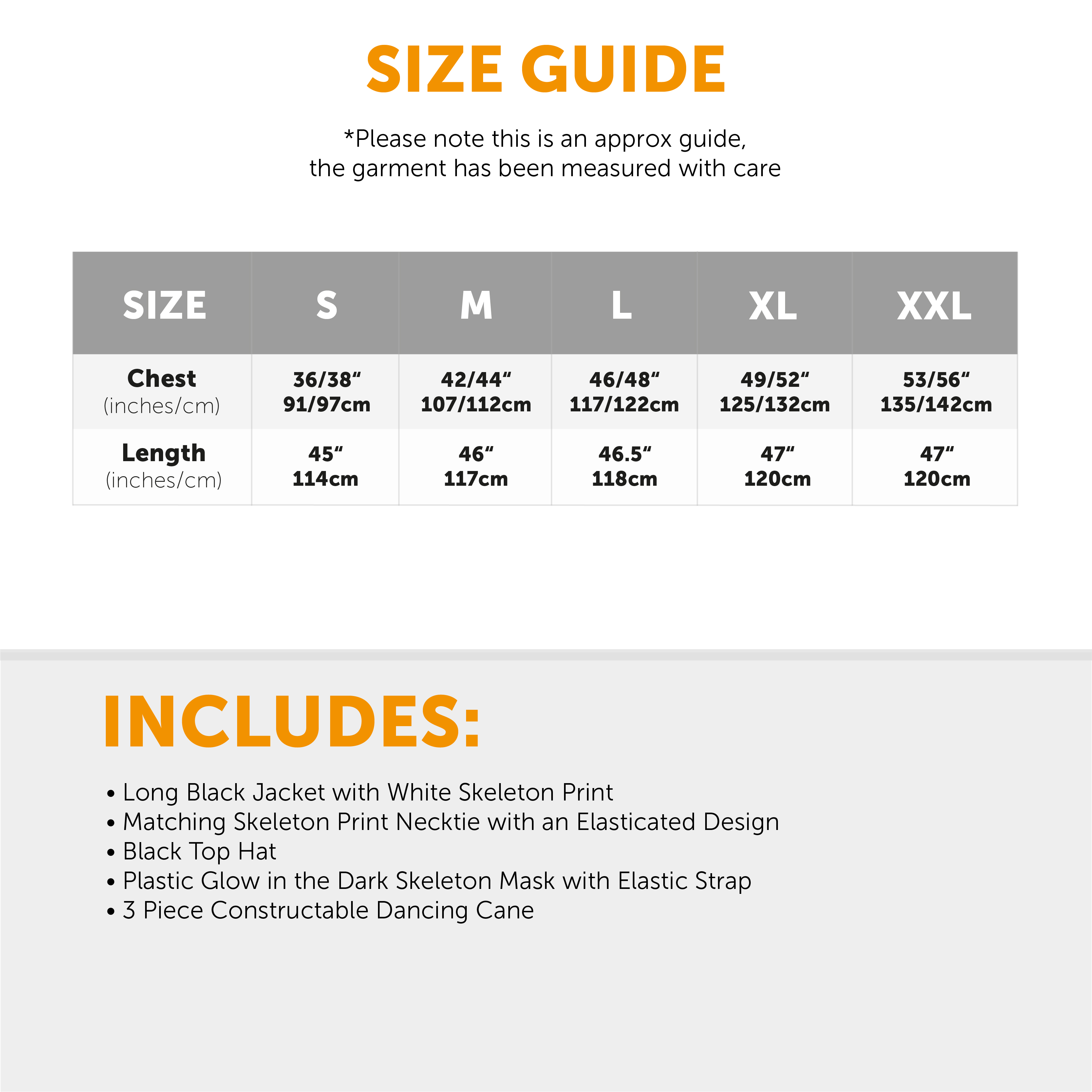 AVAILABLE IN MULTIPLE SIZES: Your Adults Skeleton Jacket is available in multiple sizes, from Small to XX-Large: Small - Chest: 36/38" (91/97cm), Length: 45" (114cm) | Medium: Chest: 42/44” (107/112cm), Length: 46” (117cm) | Large: Chest: 46/48” (117/122cm), Length: 46.5” (118cm) | X-Large: Chest: 49/52” (125/132cm), Length: 47” (120cm) | XX-Large: Chest: 53/56” (135/142cm), Length: 47” (120cm)