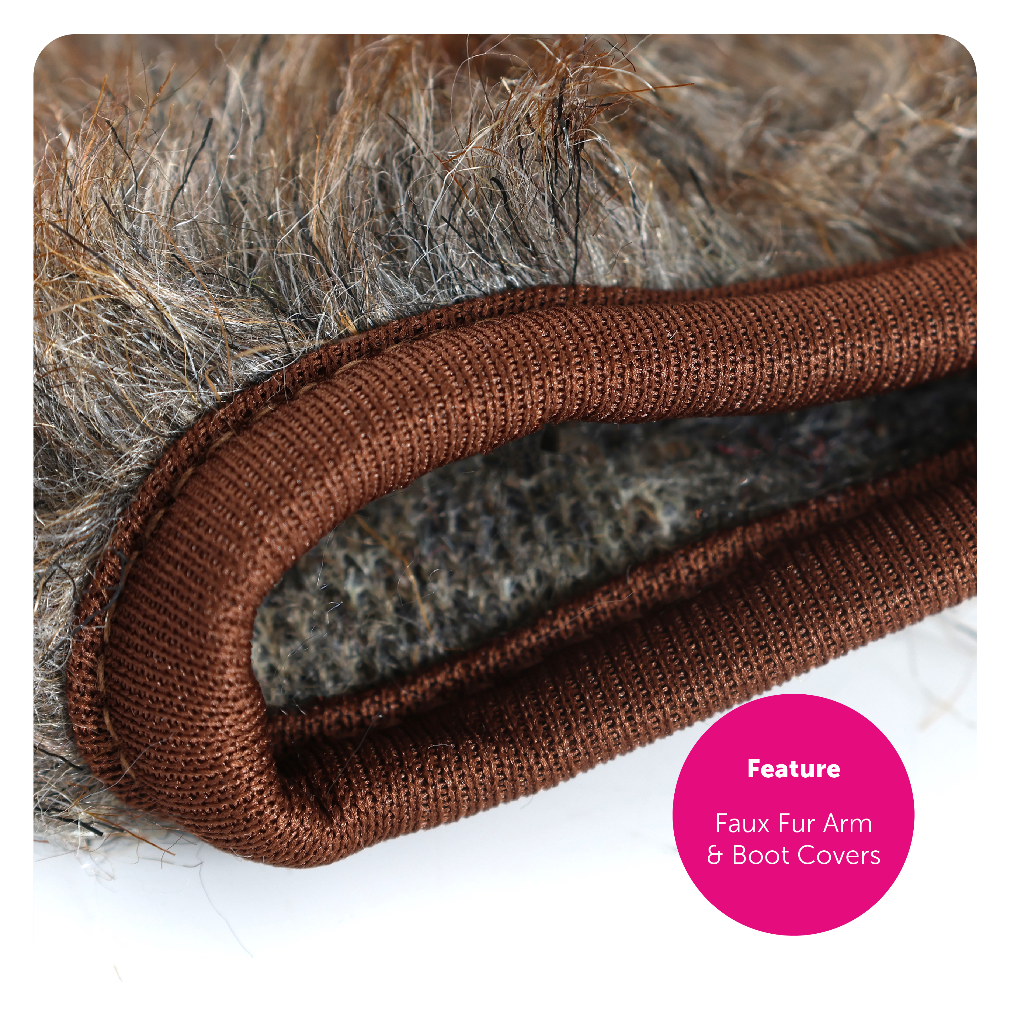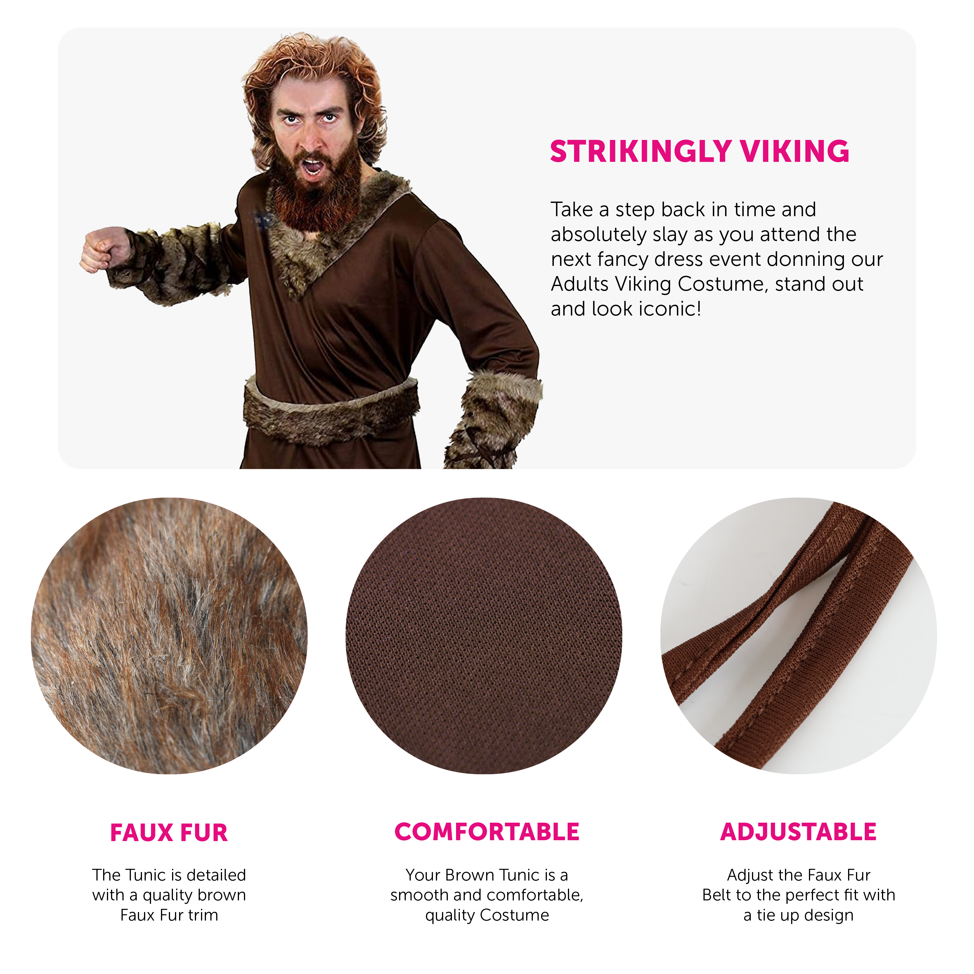 COSTUME DETAILS: Your Adults Viking Costume includes a Brown Tunic with a Faux Fur Trim, matching Faux Fur Belt, and matching Faux Fur Arm and Boot Covers, the perfect outfit for a Viking themed party!