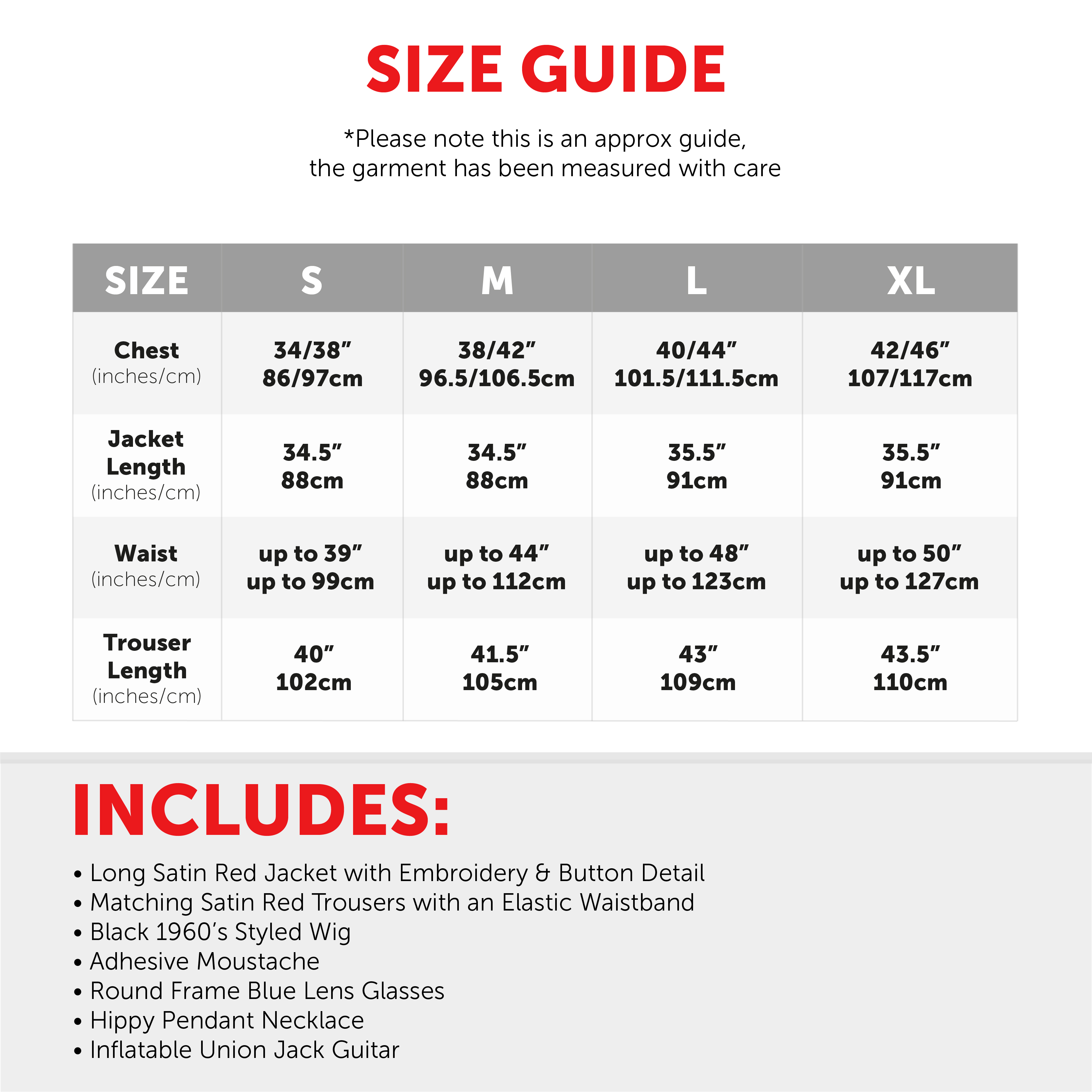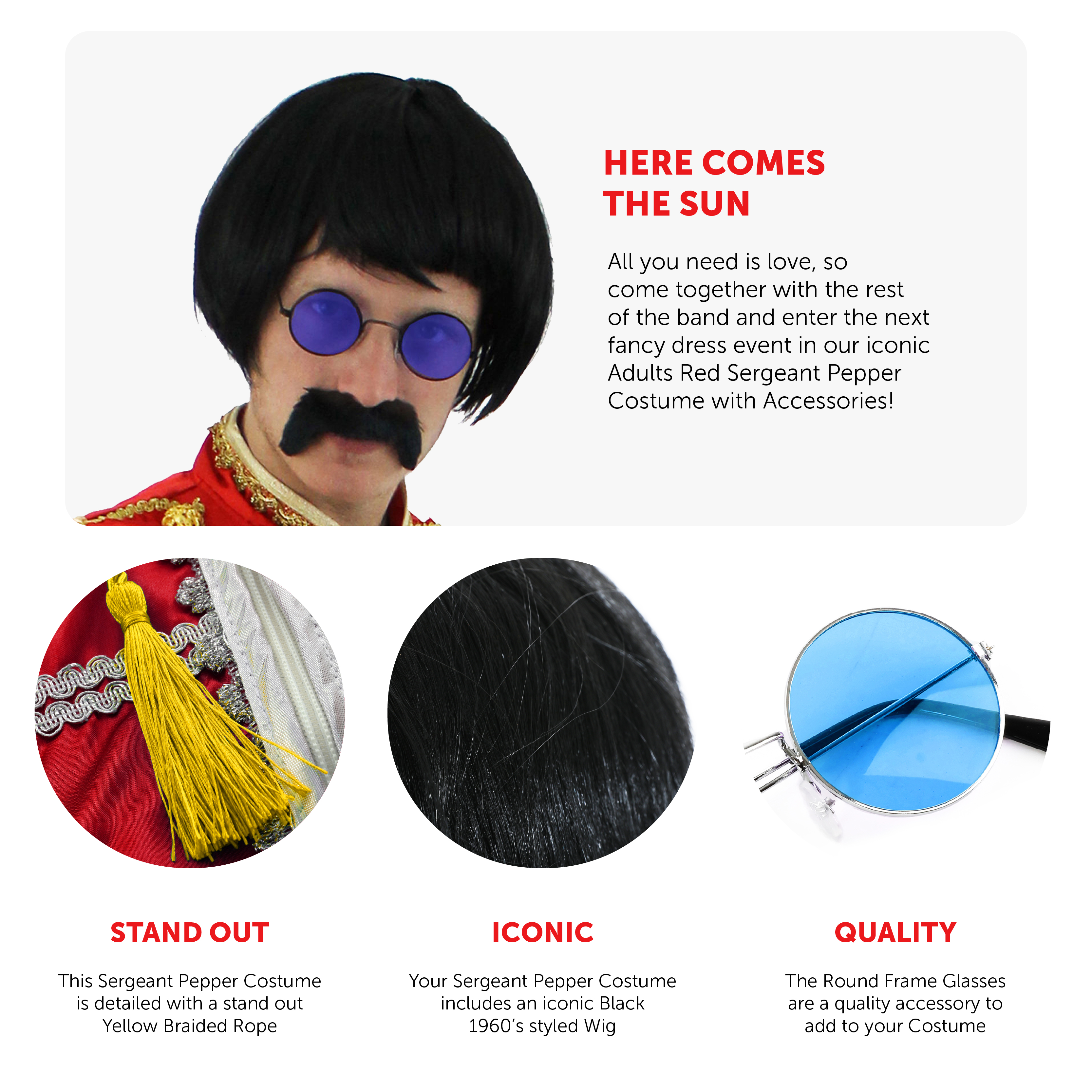 COSTUME INCLUDES: Your Adults Sergeant Pepper Costume includes a Long Satin vibrant Red coloured Jacket with Braiding and Button details, matching Red Trousers with an elasticated waistband, Blue Lens Glasses, an Adhesive Moustache, a Black 1960's styled Men's Wig, a Hippy Pendant Necklace, and an Inflatable Guitar with the Union Jack print, the perfect Costume for music themed fancy dress events!