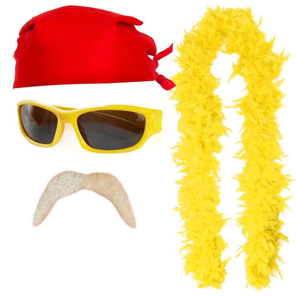 WHAT'S INCLUDED: This set includes a red bandana, yellow sunglasses, a blonde moustache, and a yellow feather boa, providing you with the key elements to embody the look of a legendary wrestling icon.