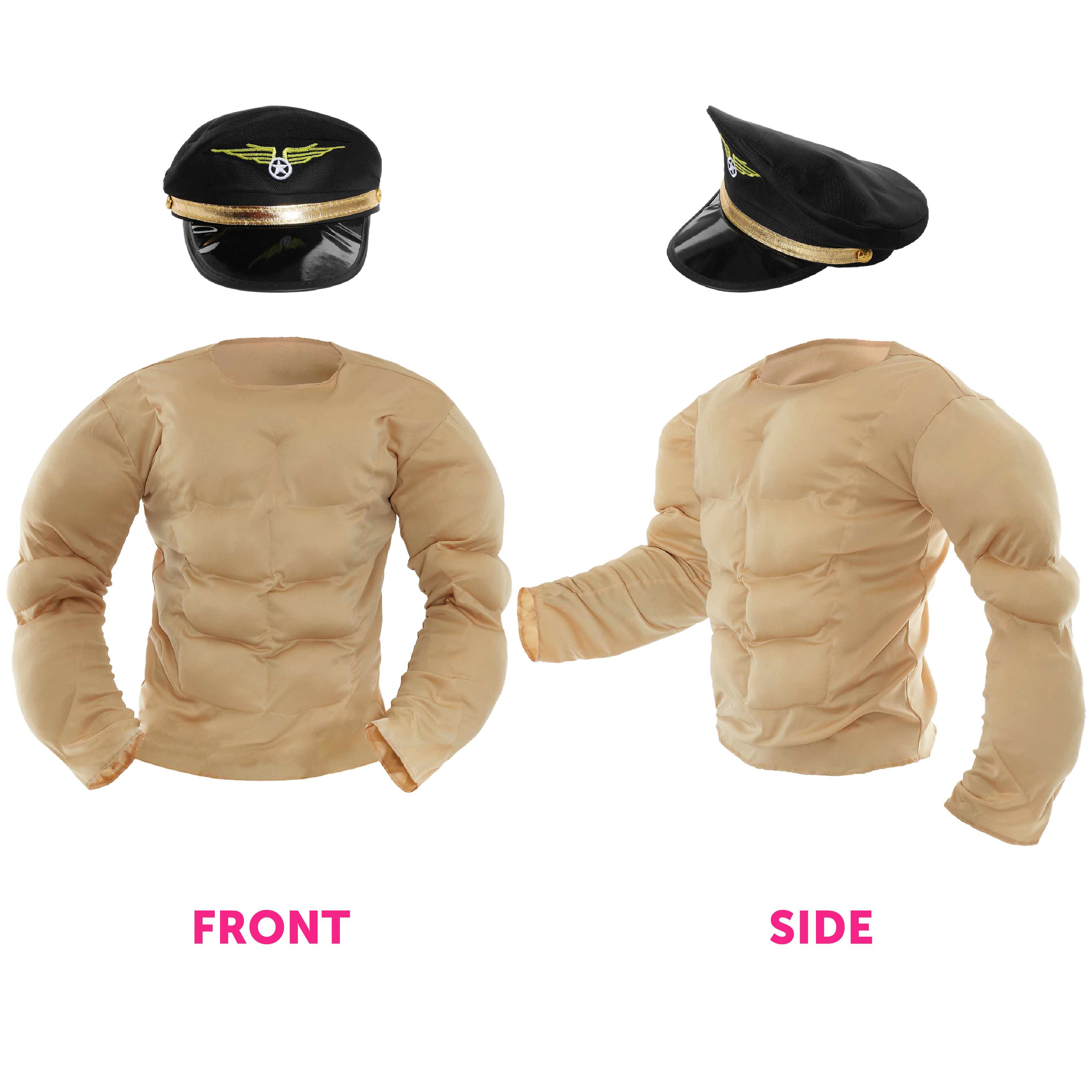 COSTUME INCLUDES: Your Adults Pilot Stripper Costume includes a long sleeved Beige Muscle Chest Top with defined Arm and Torso Muscles, Mirrored Aviator Glasses, Plain Black Tie, and a Black Pilot Hat with a Gold Band and Aviation Badge detailed on the front!