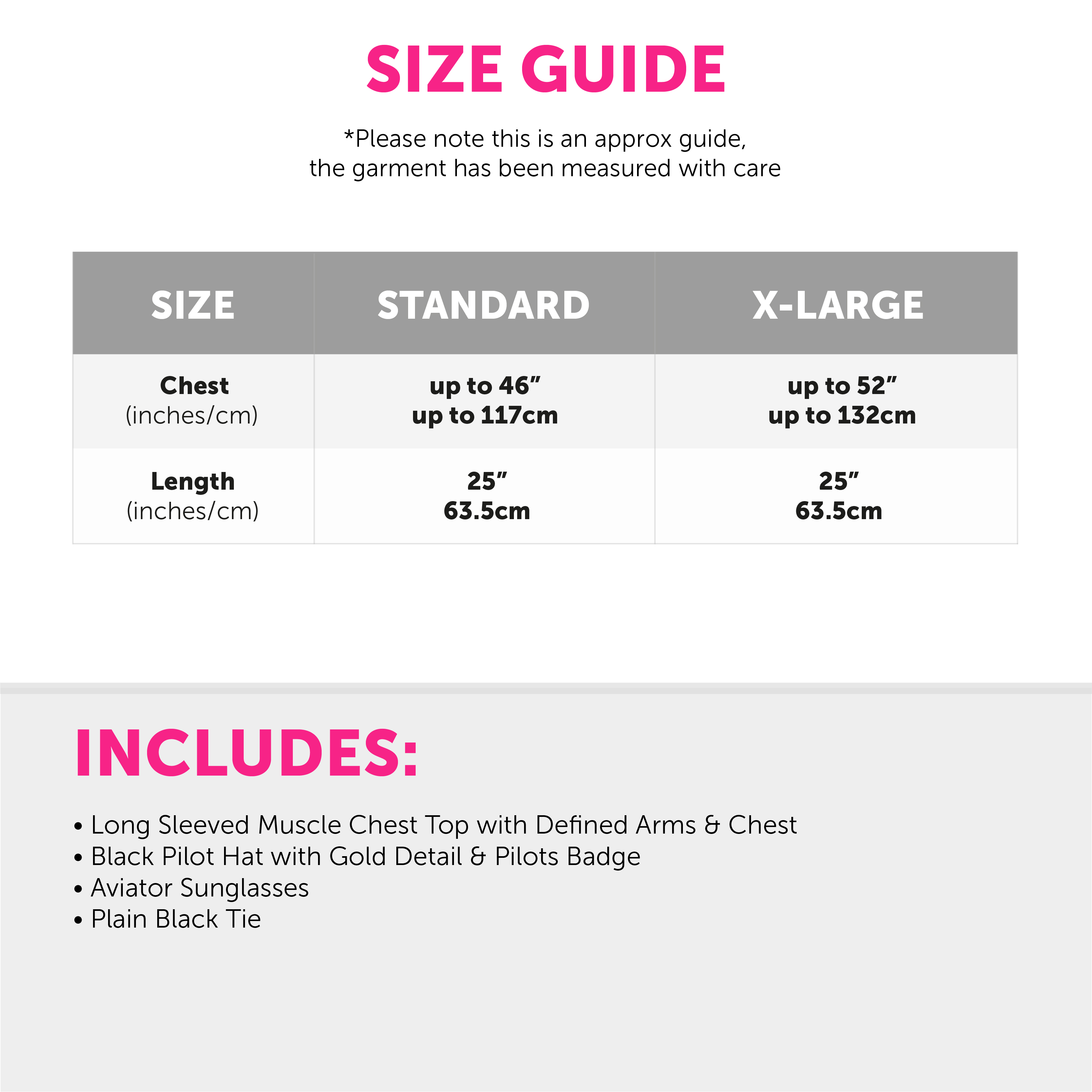 AVAILABLE IN MULTIPLE SIZES: Your Adults Pilot Stripper Costume is available in two sizes, Standard and X-Large: Standard - Chest Up To 46" (117cm), Length 25" (63.5cm) | X-Large - Chest Up To 52" (132cm), Length 25" (63.5cm)