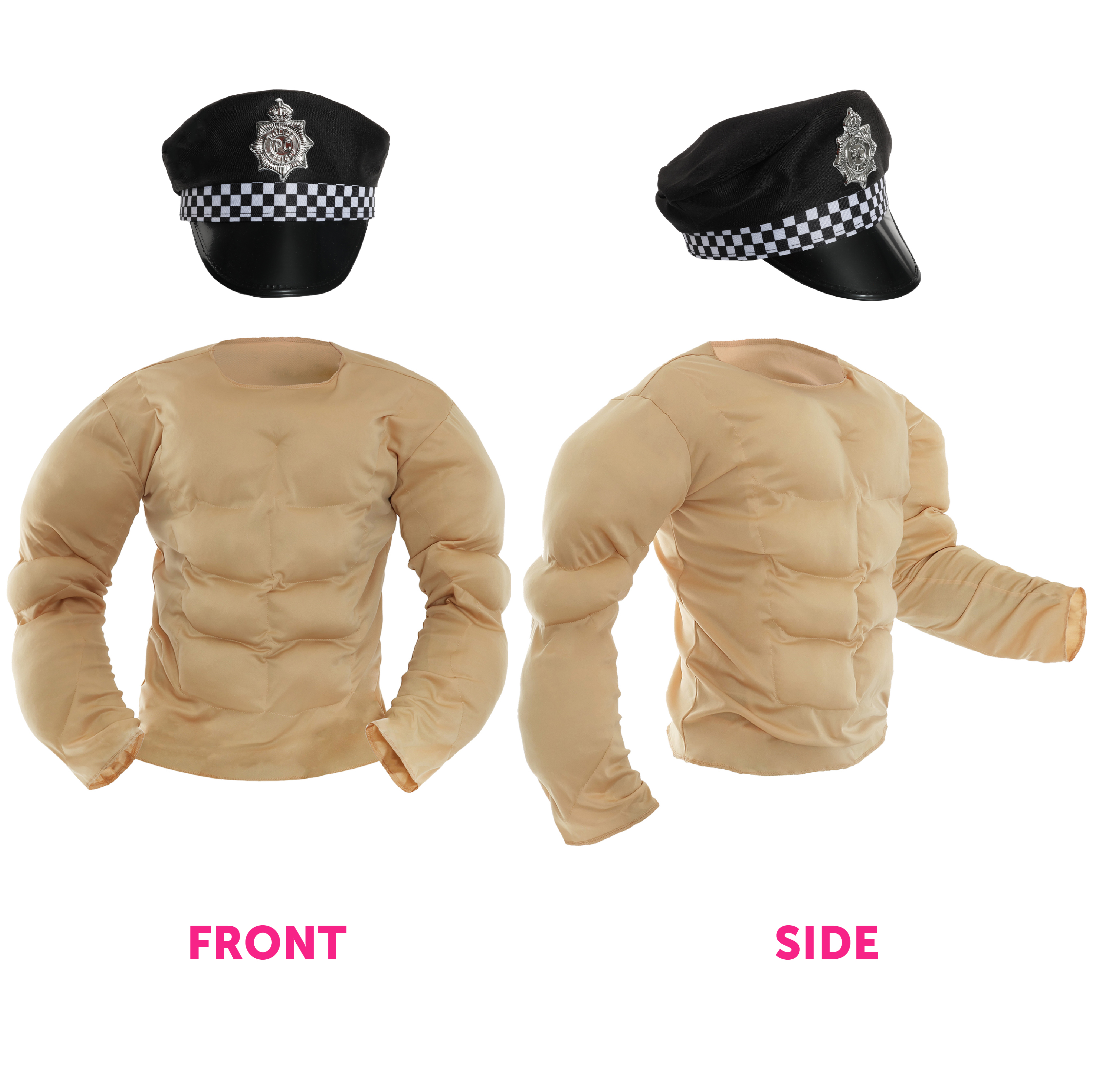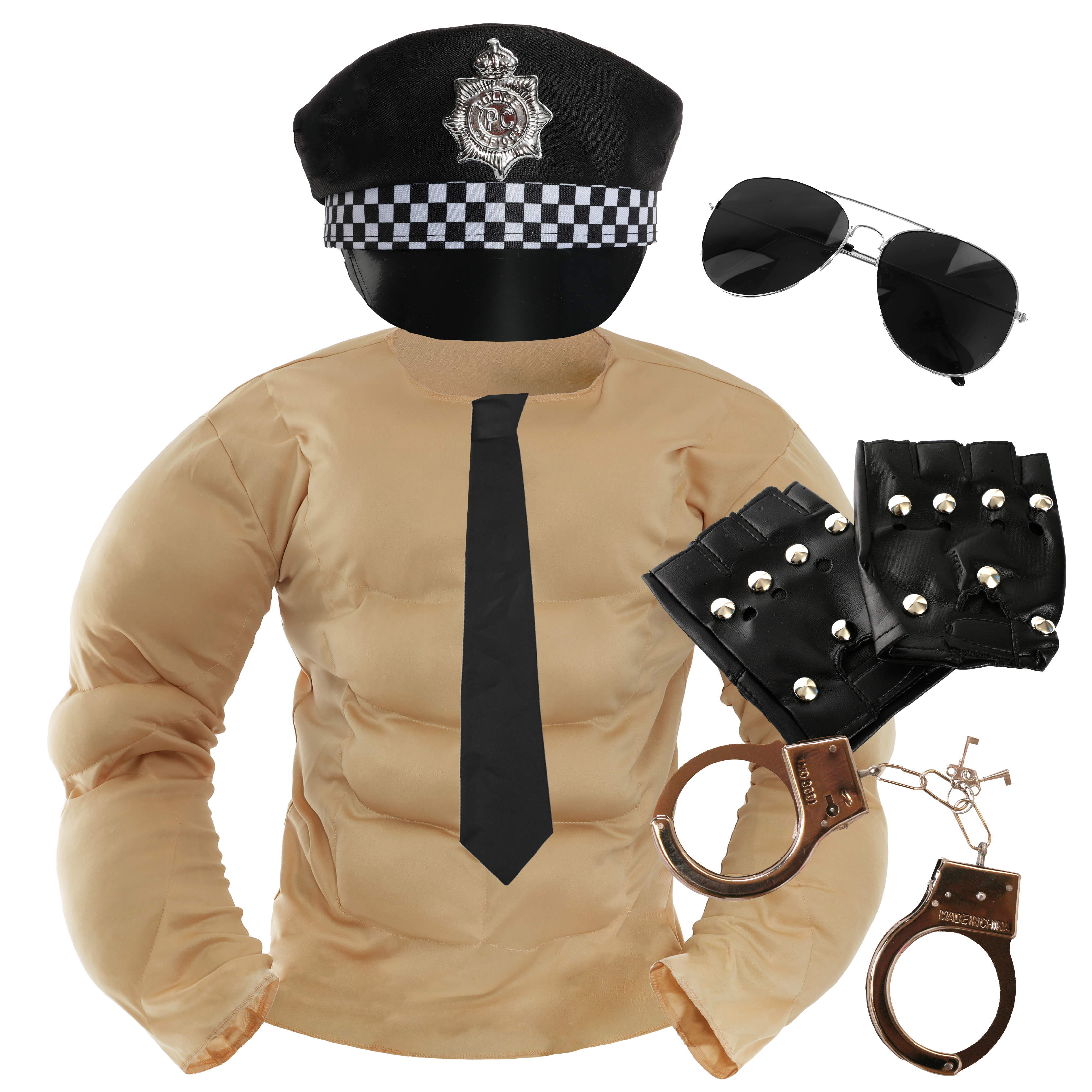 COSTUME INCLUDES: Your Adults Police Stripper Costume includes a long sleeved Beige Muscle Chest Top with defined Arm and Torso Muscles, Mirrored Aviator Glasses, Plain Black Tie, Black Police Hat with a Silver Badge on the front and checkered pattern band, a pair of faux leather fingerless Studded Gloves and Silver Metal Handcuffs with a key!