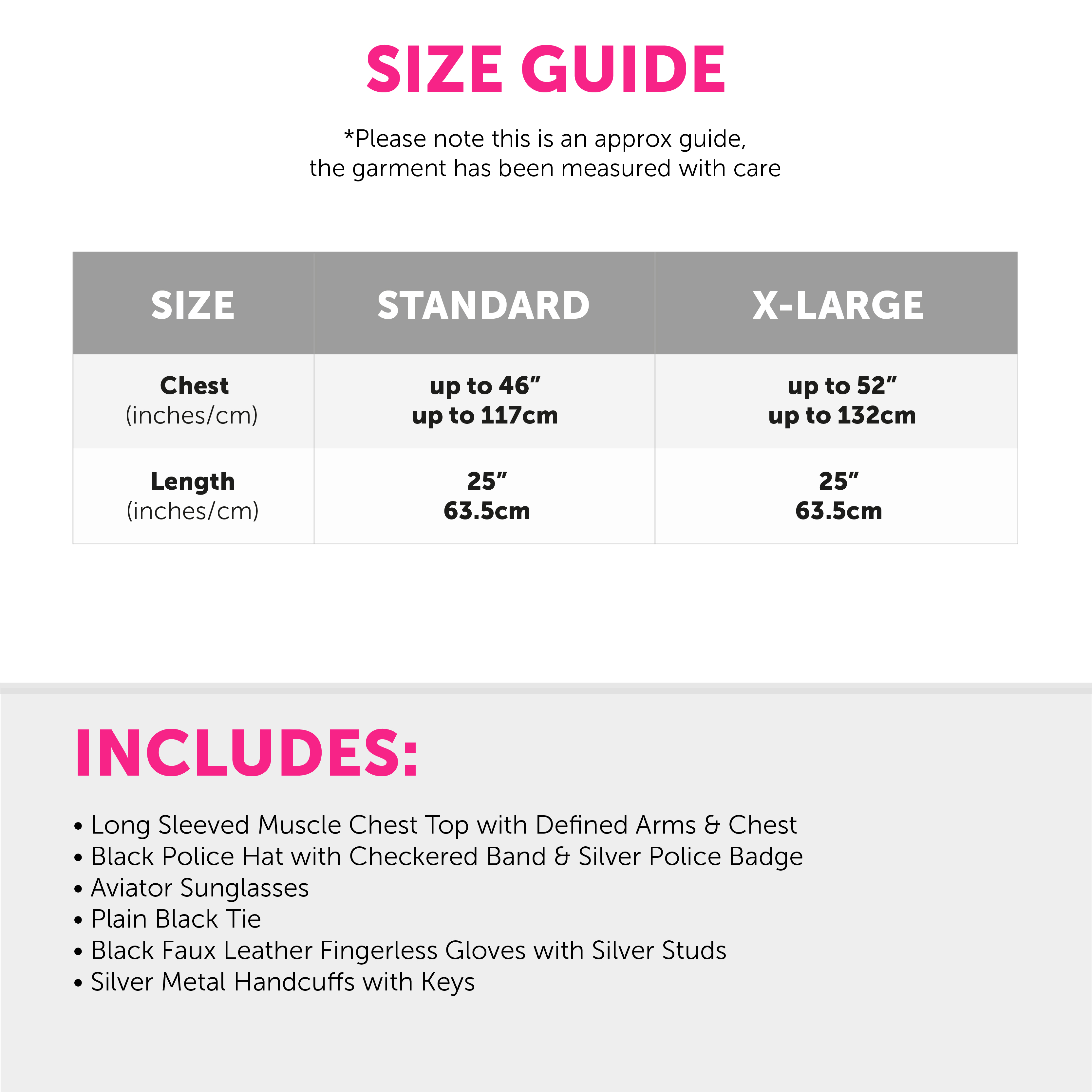 AVAILABLE IN MULTIPLE SIZES: Your Adults Police Stripper Costume is available in two sizes, Standard and X-Large: Standard - Chest Up To 46" (117cm), Length 25" (63.5cm) | X-Large - Chest Up To 52" (132cm), Length 25" (63.5cm)