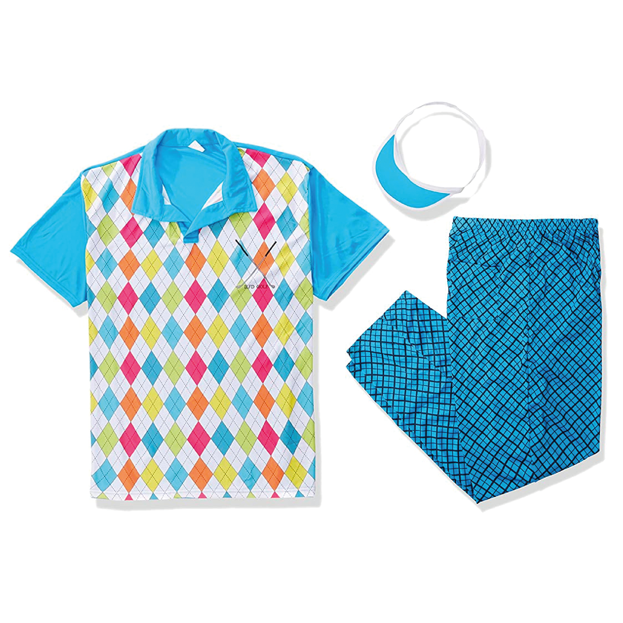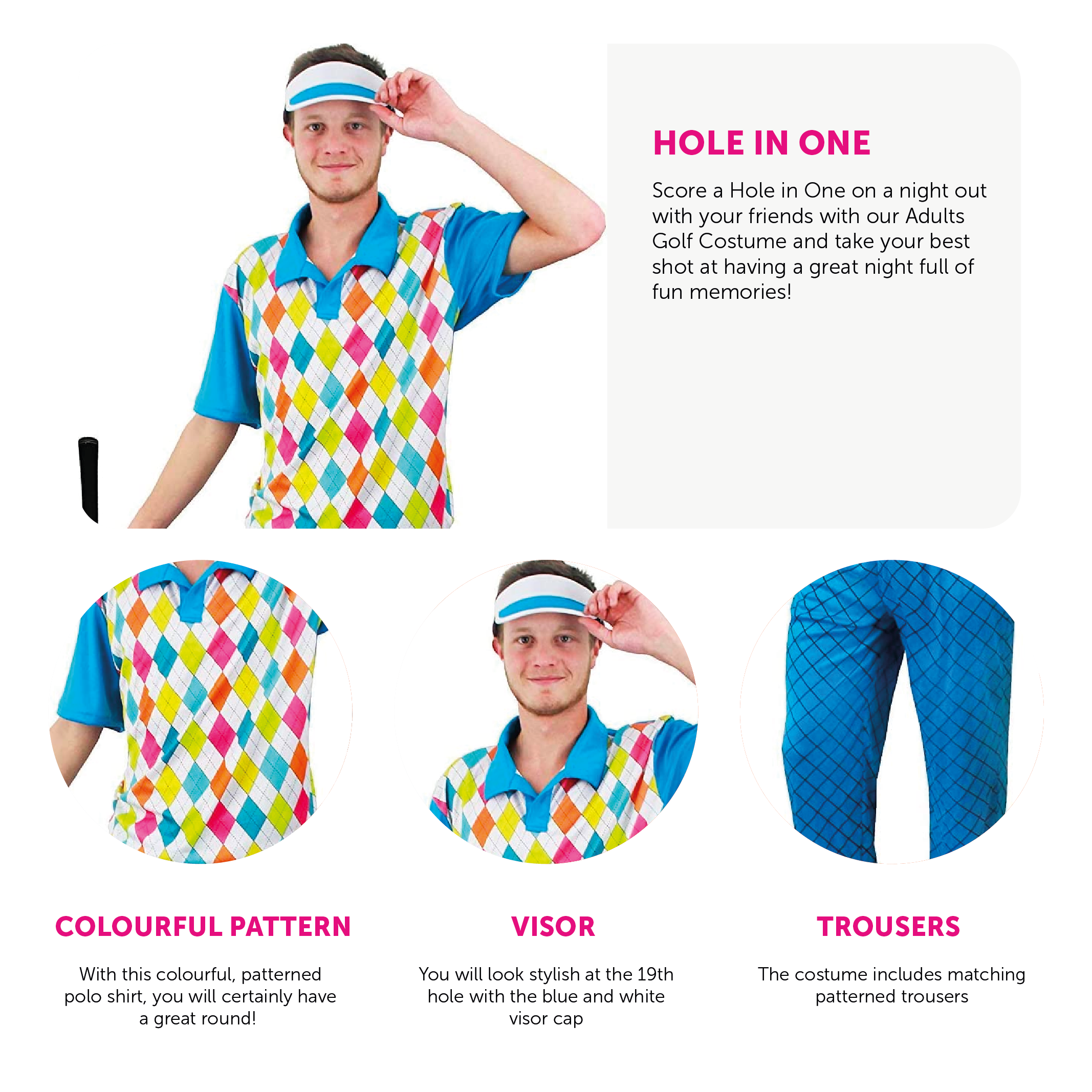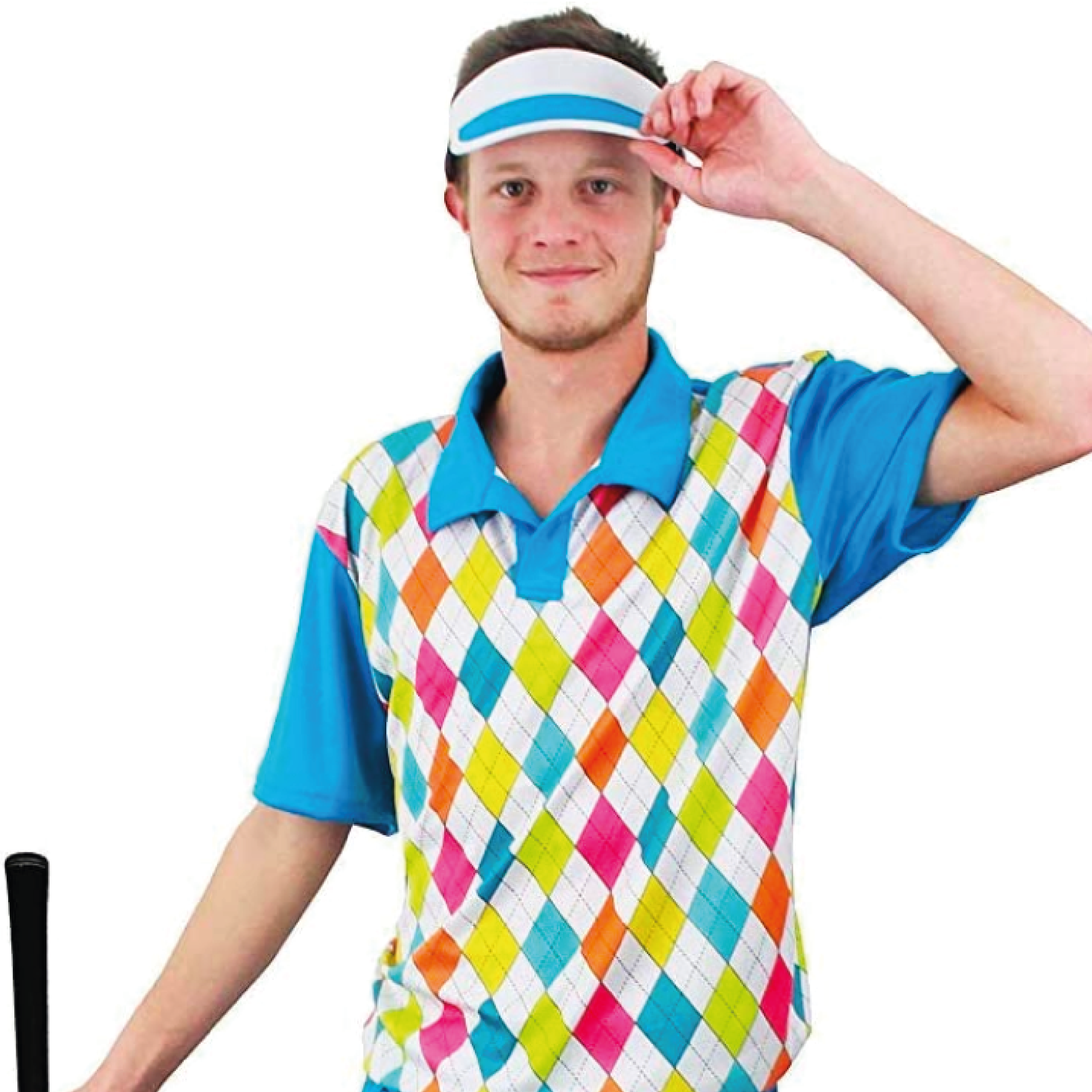 COSTUME INCLUDES: Your Adults Golf Costume includes a Blue and Bright Argyle Patterned Top, Blue Trousers with an Elasticated waist and Diamond Pattern, and a Blue Visor Golf Hat to complete your look!