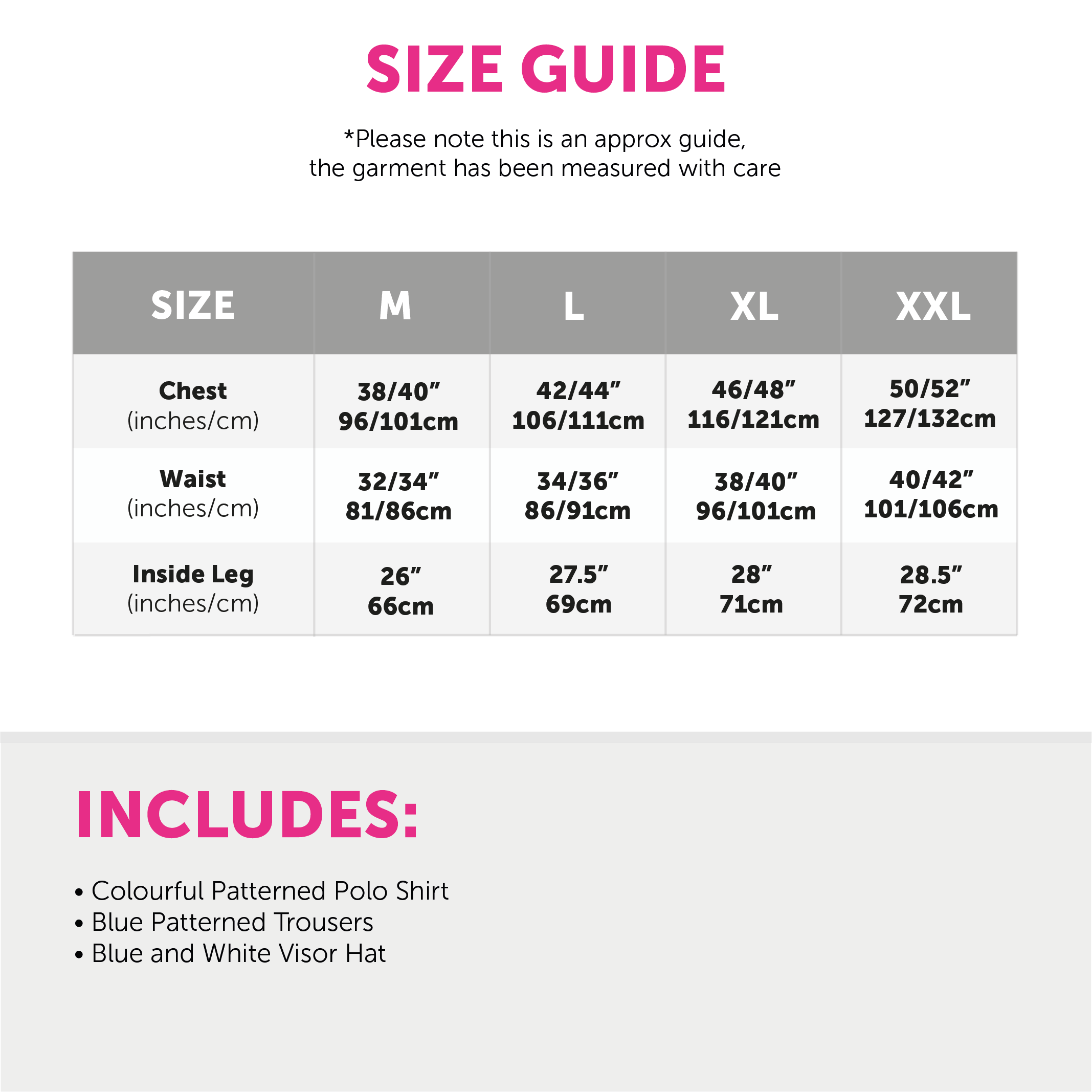 AVAILABLE IN MULTIPLE SIZES: Your Adults Golf Costume is available in multiple sizes from Medium to XX-Large: Medium - Chest 38/40" (96.5/101.5cm), Top Length 26" (66cm), Waist 32/34" (81/86cm) | Large - Chest 42/44" (106.5/111.5cm), Top Length 27.5" (69.5cm), Waist 34/36" (86.5/91.5cm) | X-Large - Chest 46/48" (117/122cm), Top Length 28" (71cm), Waist 38/40" (96.5/101.5cm) | XX-Large - Chest 50/52" (127/132cm), Top Length 28.5" (72cm), Waist 40/42" (101.5/106.5cm)