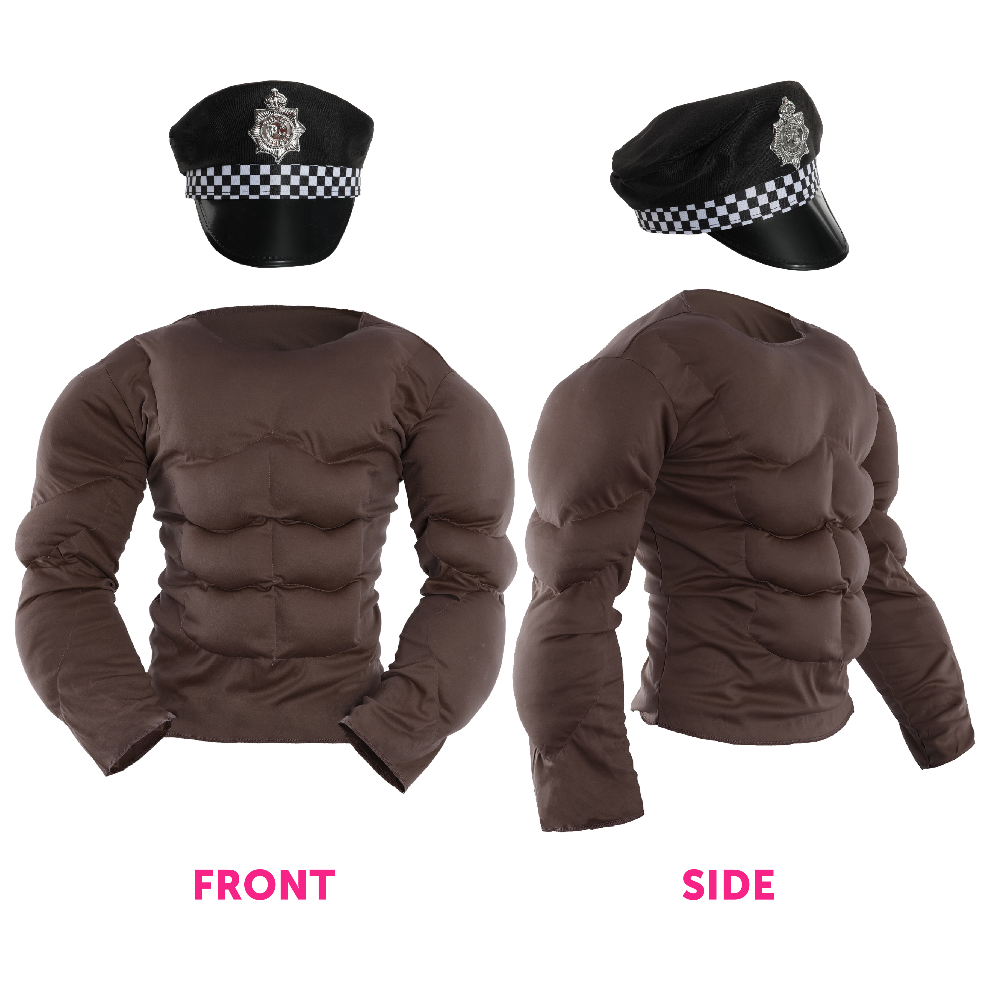 COSTUME INCLUDES: Your Adults Police Stripper Costume includes a long sleeved Brown Muscle Chest Top with defined Arm and Torso Muscles, Mirrored Aviator Glasses, Plain Black Tie, Black Police Hat with a Silver Badge on the front and checkered pattern band, a pair of faux leather fingerless Studded Gloves and Silver Metal Handcuffs with a key!