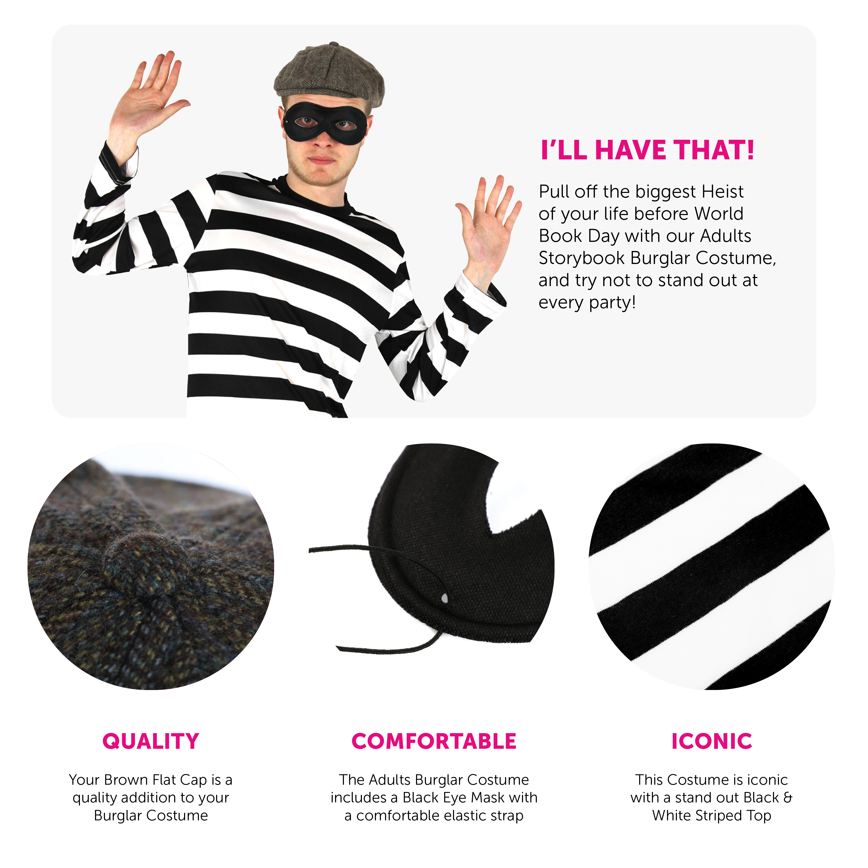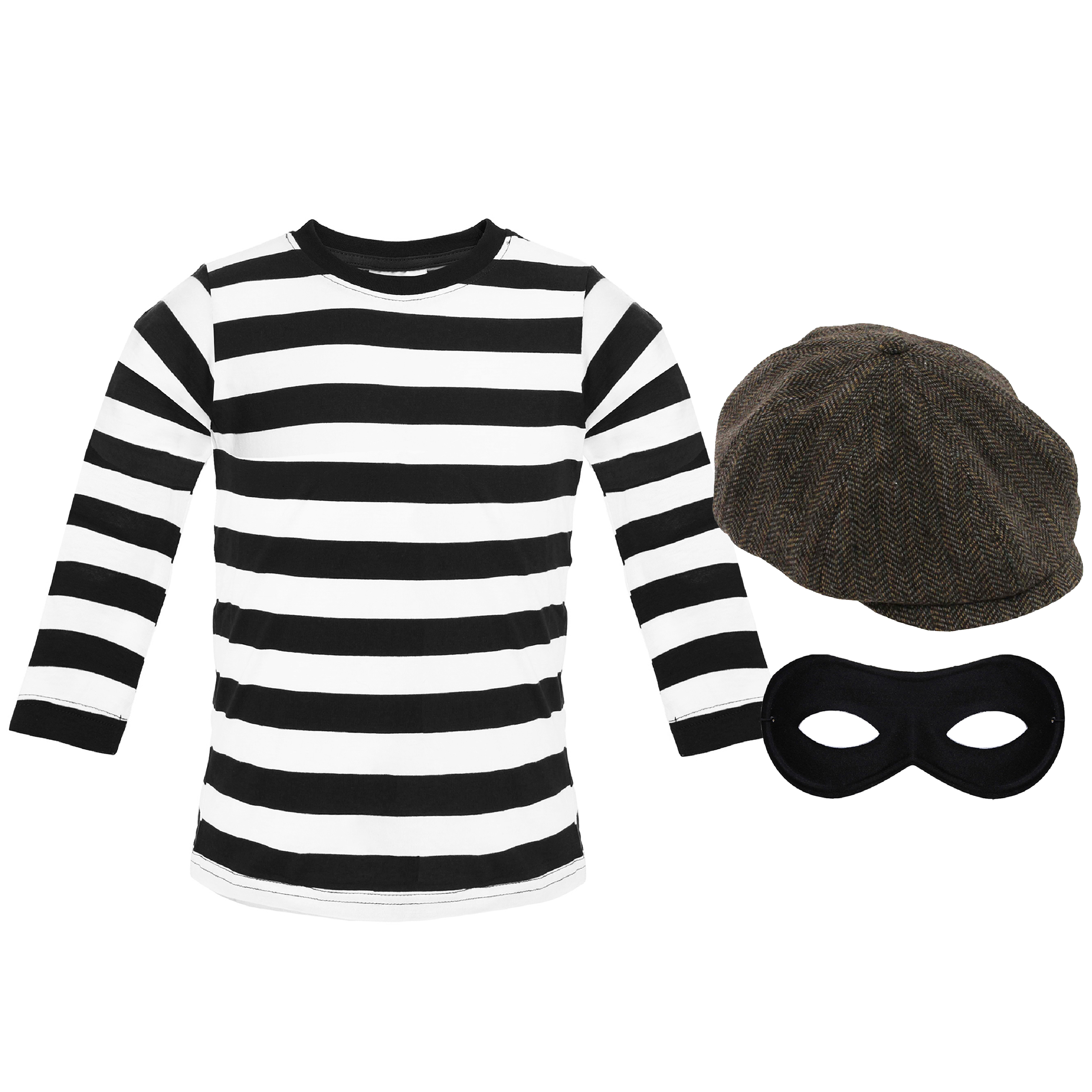 COSTUME SET INCLUDES: This Adults Storybook Burglar Costume includes a Long Sleeved Black and White Striped Top, a Black Eye Mask on a comfortable elasticated strap, and a Brown Flat Cap, the perfect look for you this World Book Day!