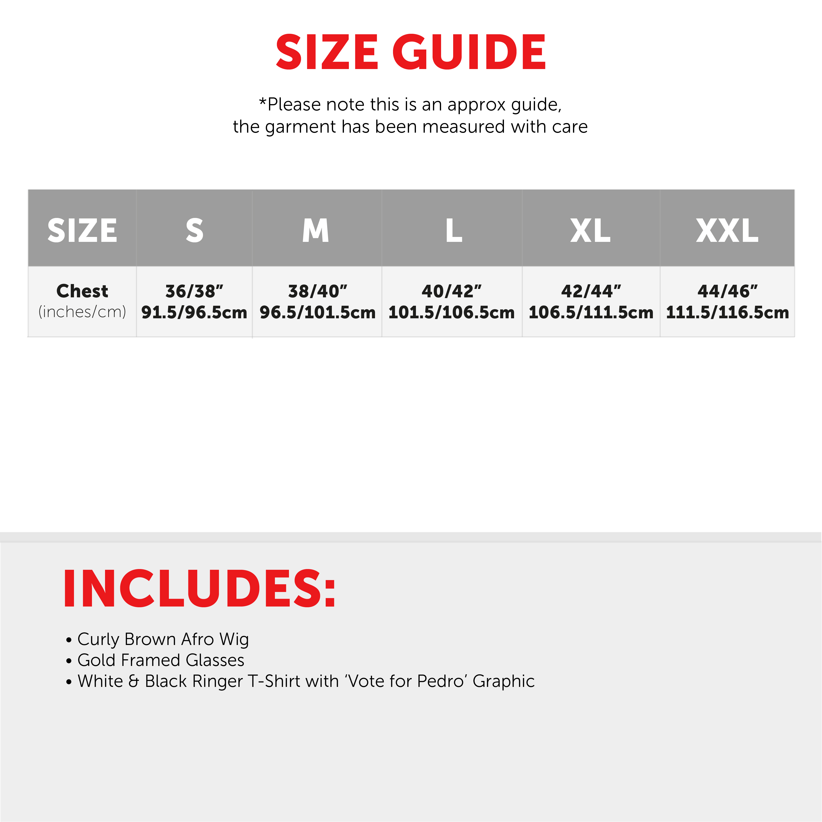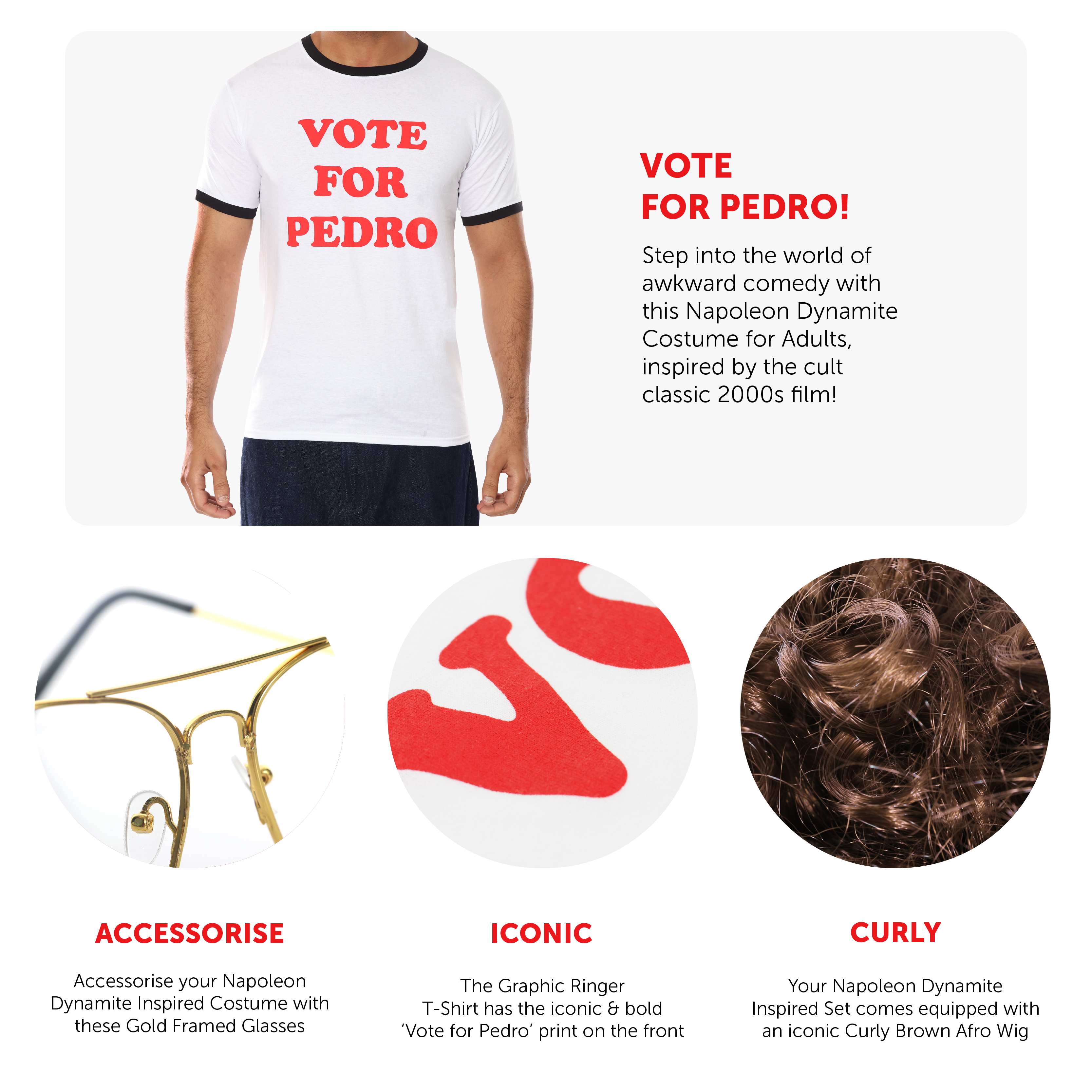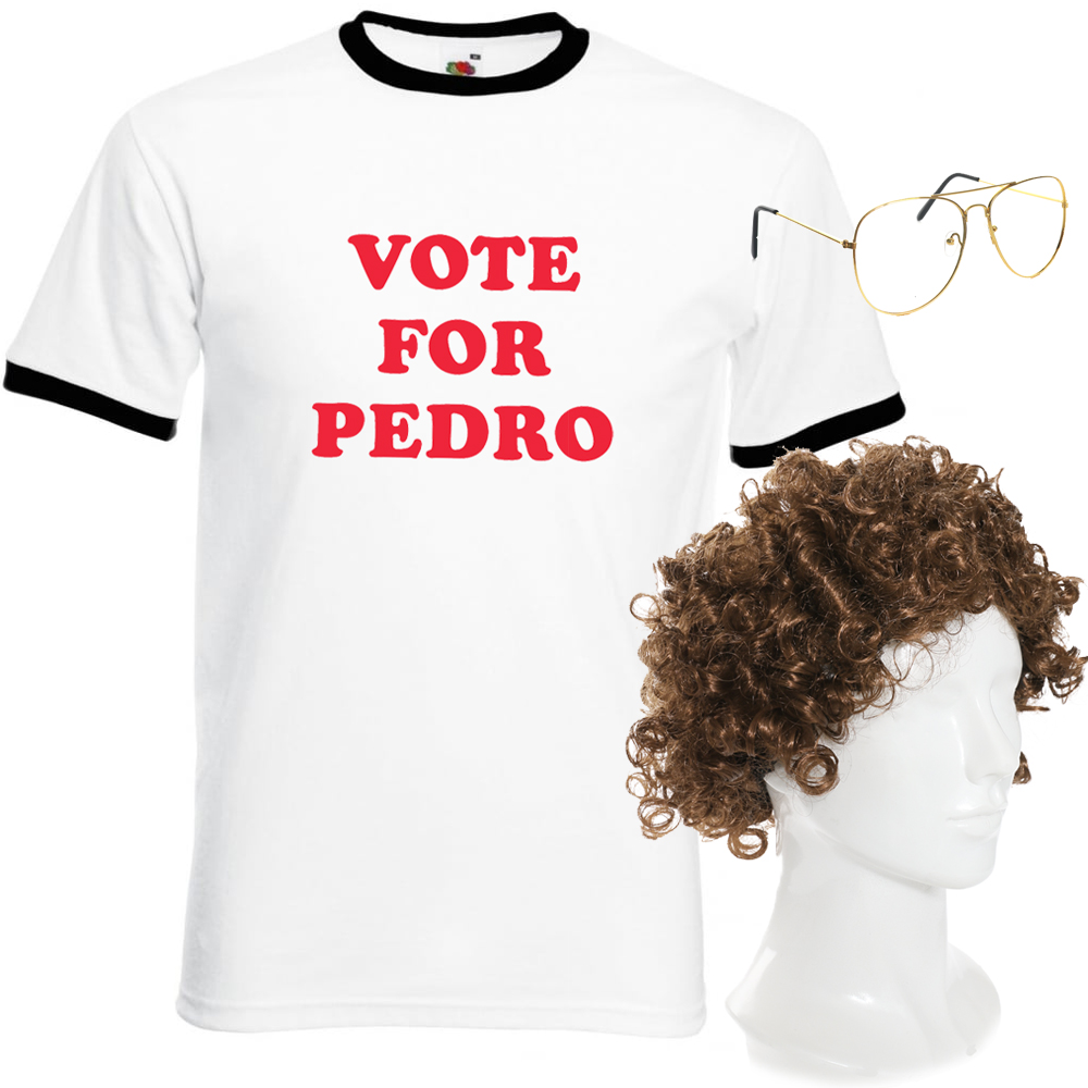 Step into the world of awkward comedy with this Napoleon Dynamite Costume for Adults, inspired by the cult classic 2000s film. This complete outfit includes a white Vote for Pedro T-Shirt with bold red lettering, a brown curly 80s-style wig, and retro-style glasses to complete Napoleon’s unmistakable look. Ideal for Halloween, fancy dress parties, cosplay, 2000s-themed events, or movie nights, this funny costume is sure to turn heads and get plenty of laughs. Available in Small to XXL with a comfortable unisex fit, this costume is perfect for fans of nostalgic comedy and retro pop culture. Just add some moon boots and your best dance moves!