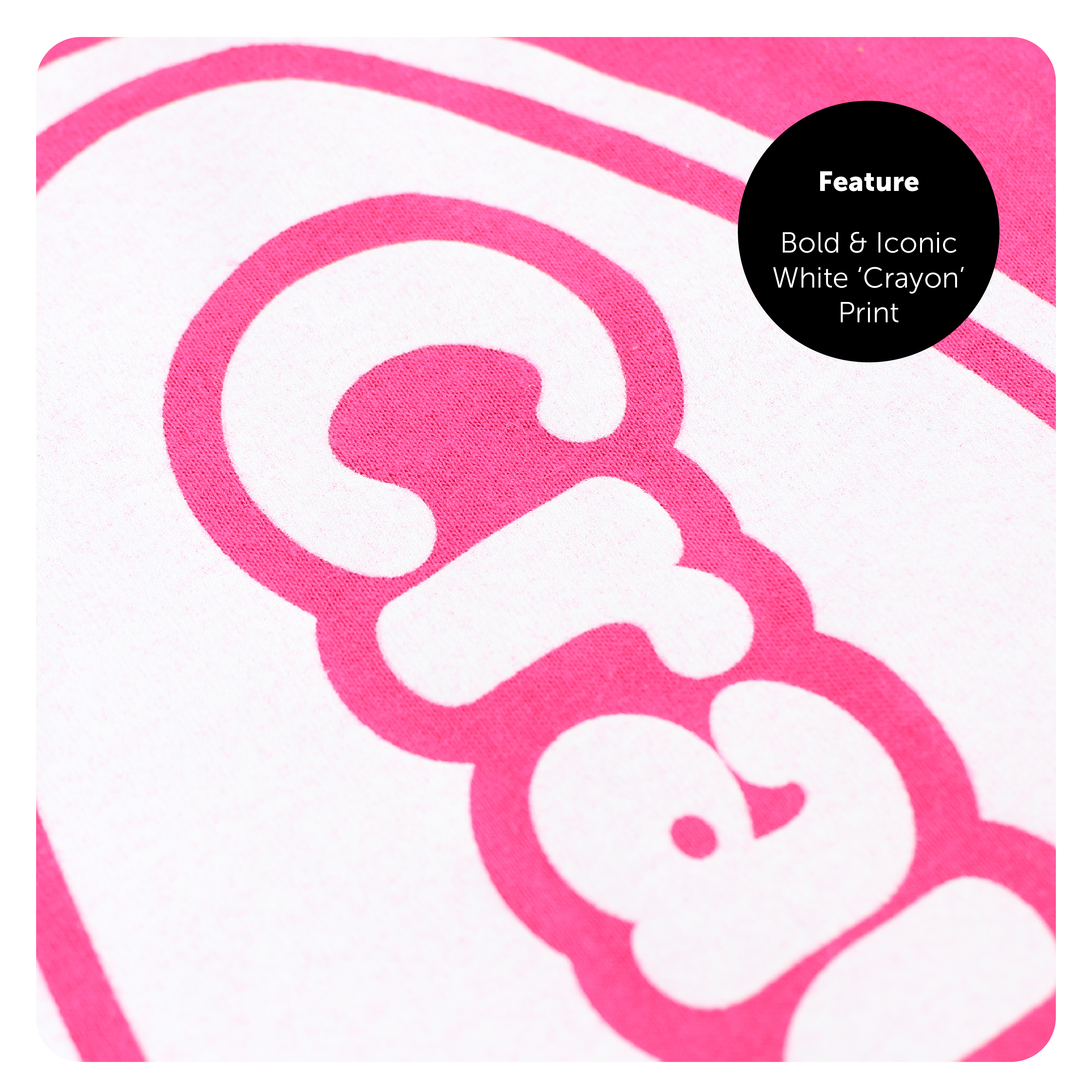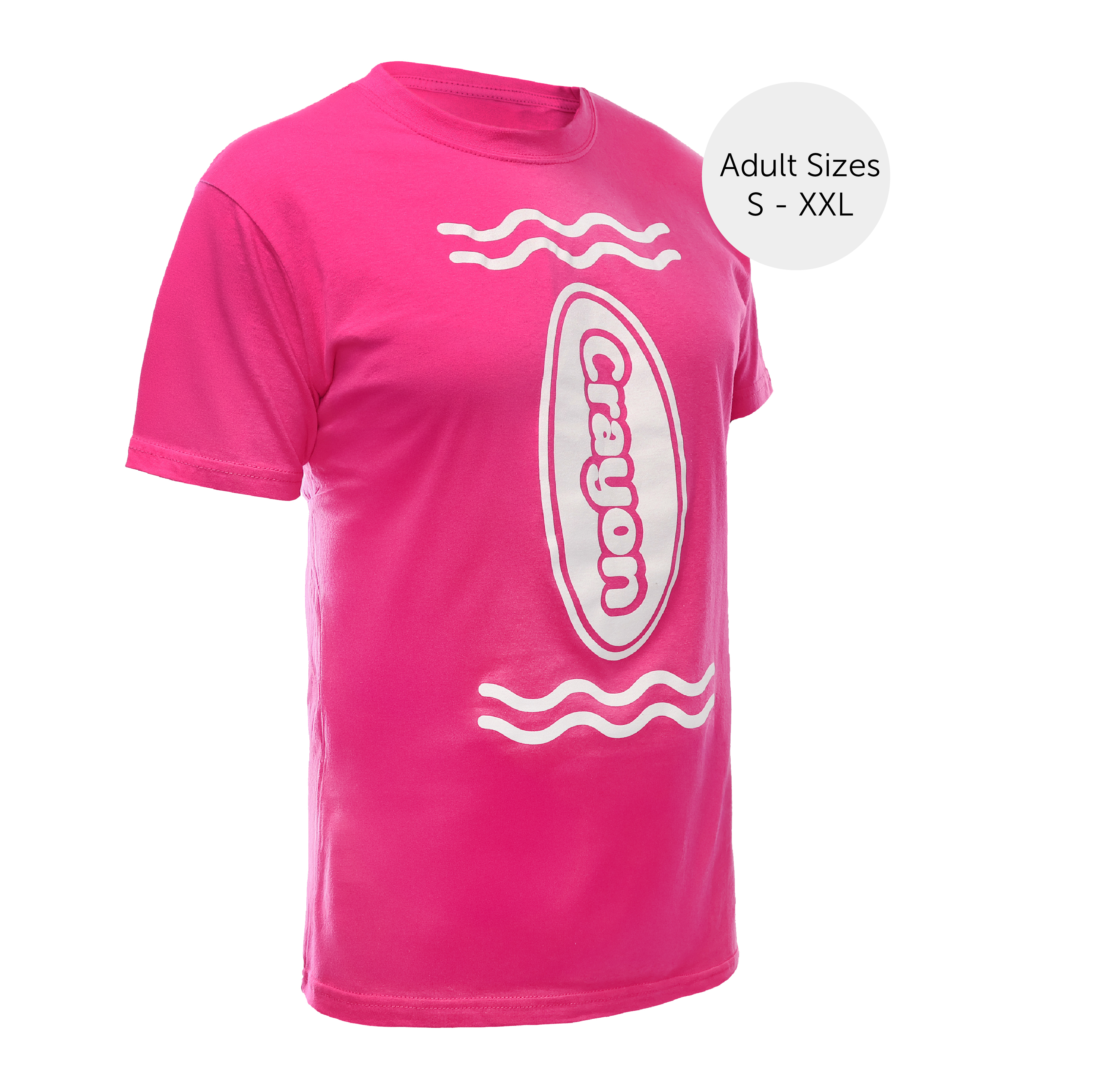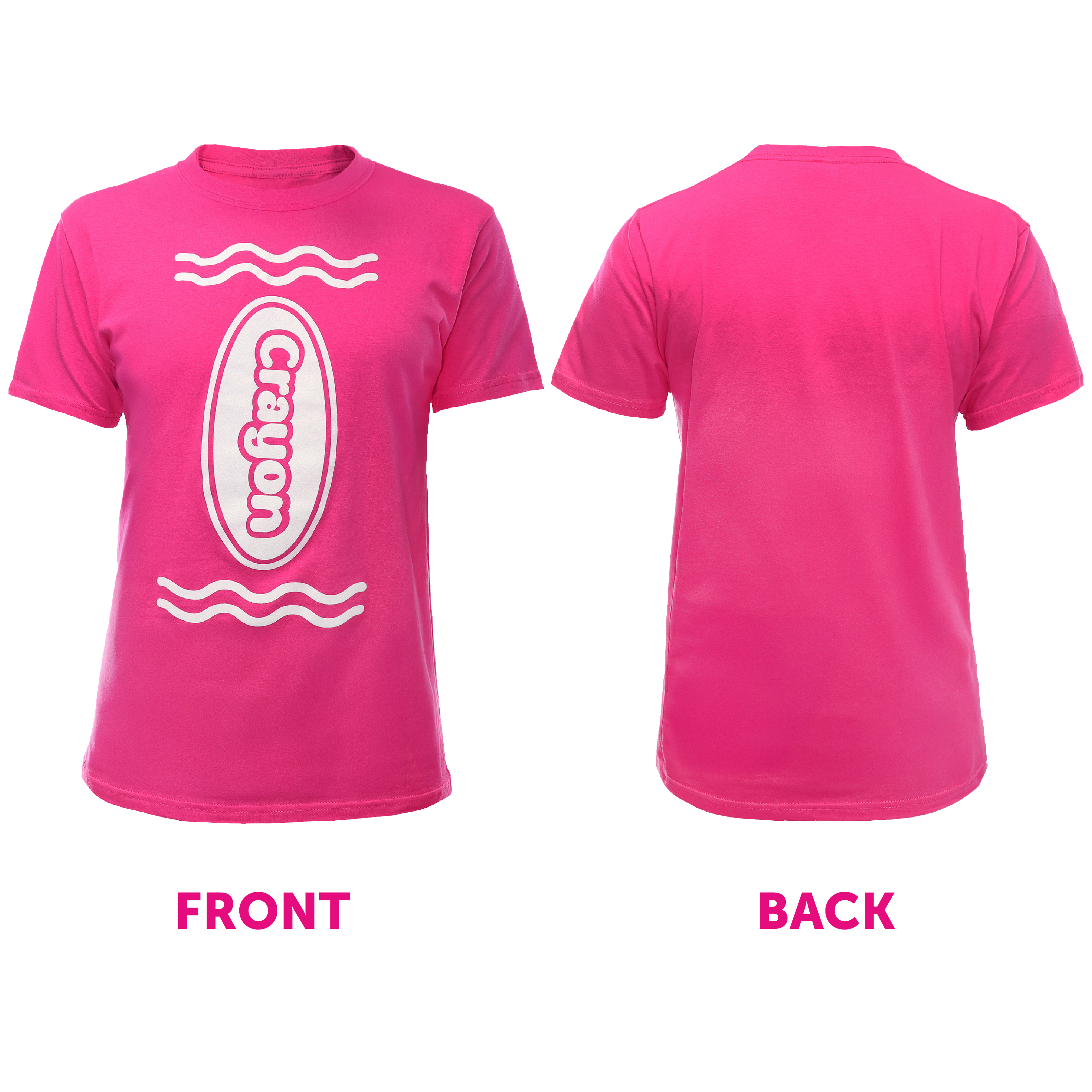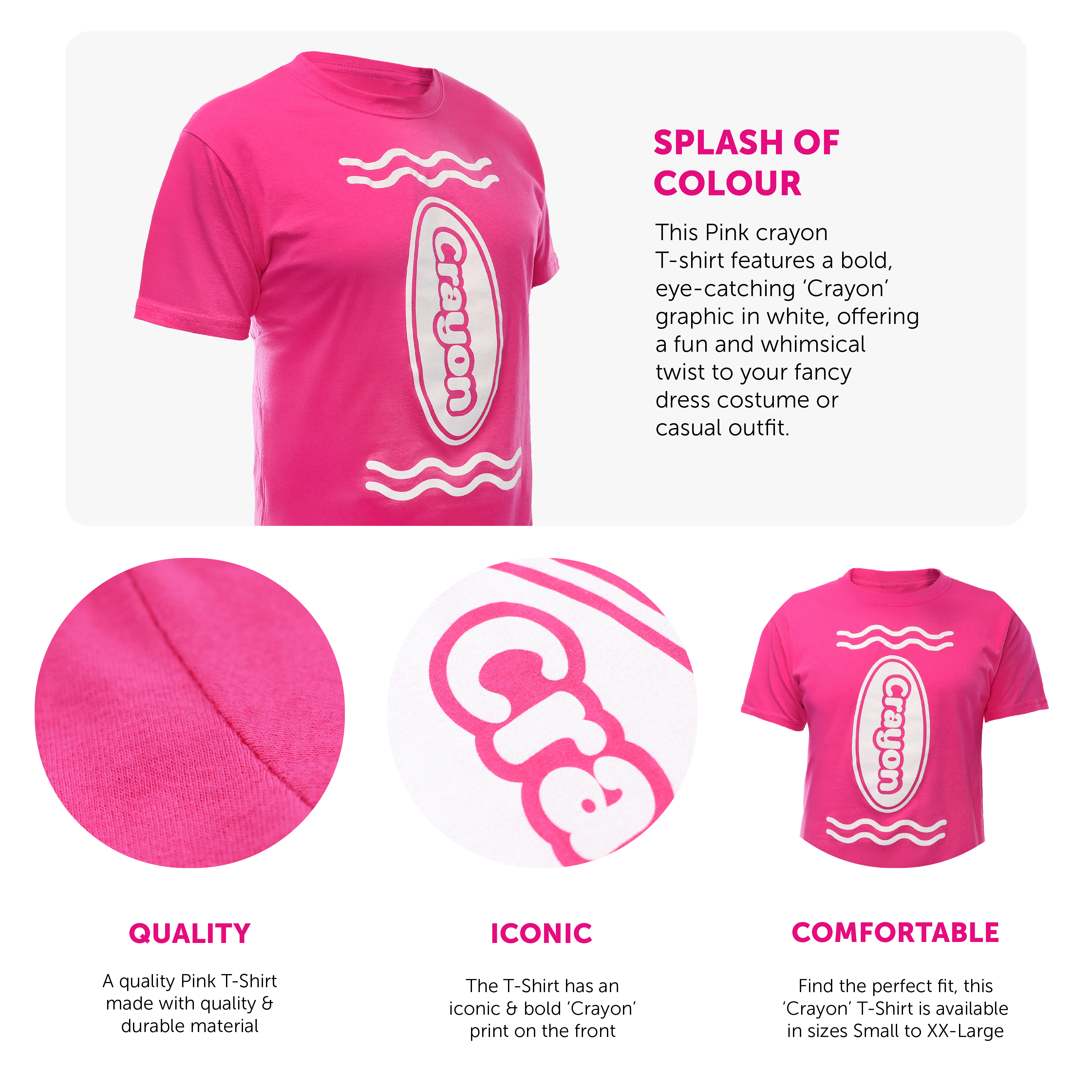 FUN AND CREATIVE DESIGN: This Pink crayon T-shirt features a bold, eye-catching "Crayon" graphic in white, offering a fun and whimsical twist to your fancy dress costume or casual outfit.