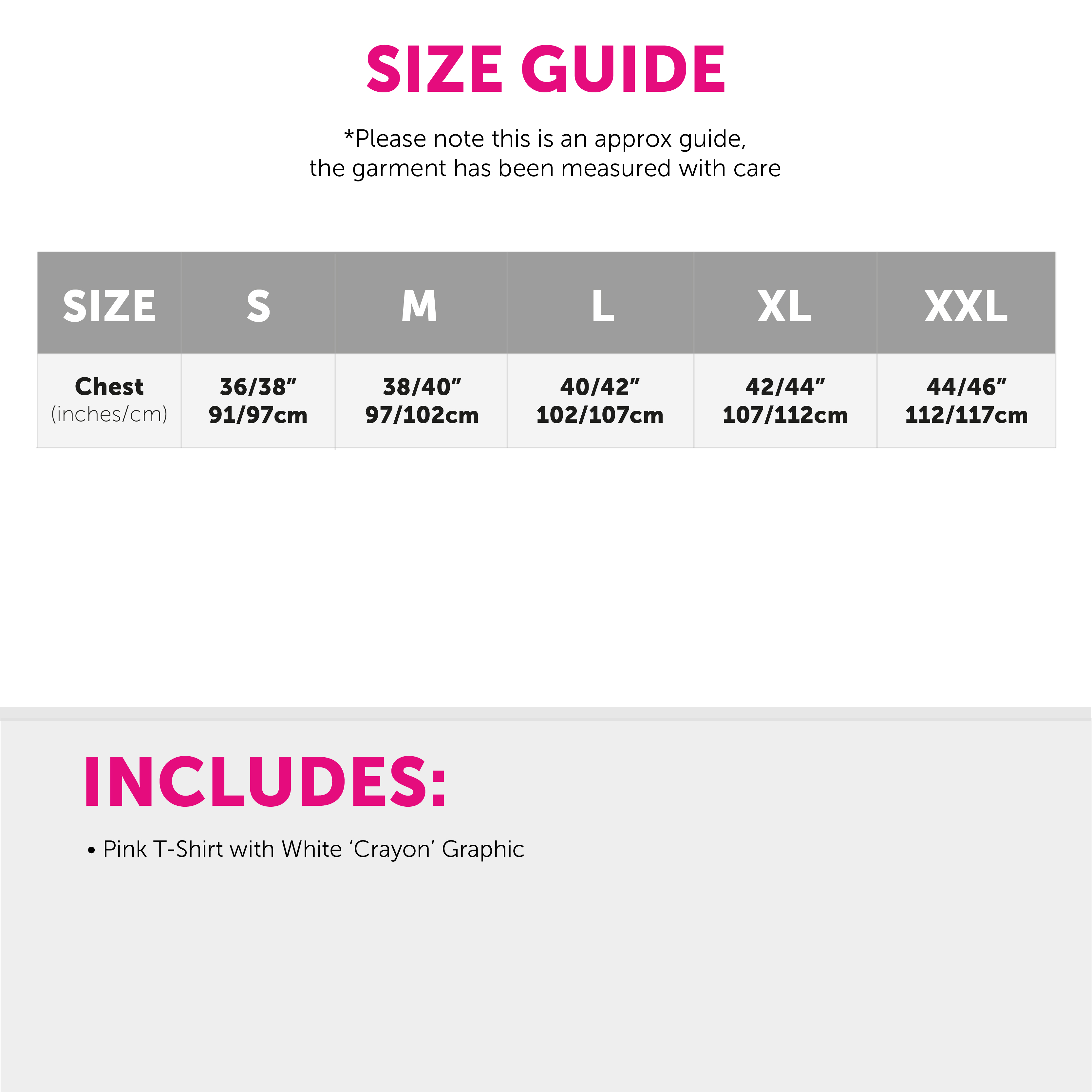 AVAILABLE IN MULTIPLE SIZES: This Adults Crayon T-Shirt is available in multiple sizes from Small to XX-Large: Small - Chest 36/38" (91/97cm) | Medium - Chest 38/40" (97/102cm) | Large - Chest 40/42" (102/107cm) | X-Large - Chest 42/44" (107/112cm) | XX-Large - Chest 44/46" (112/117cm)