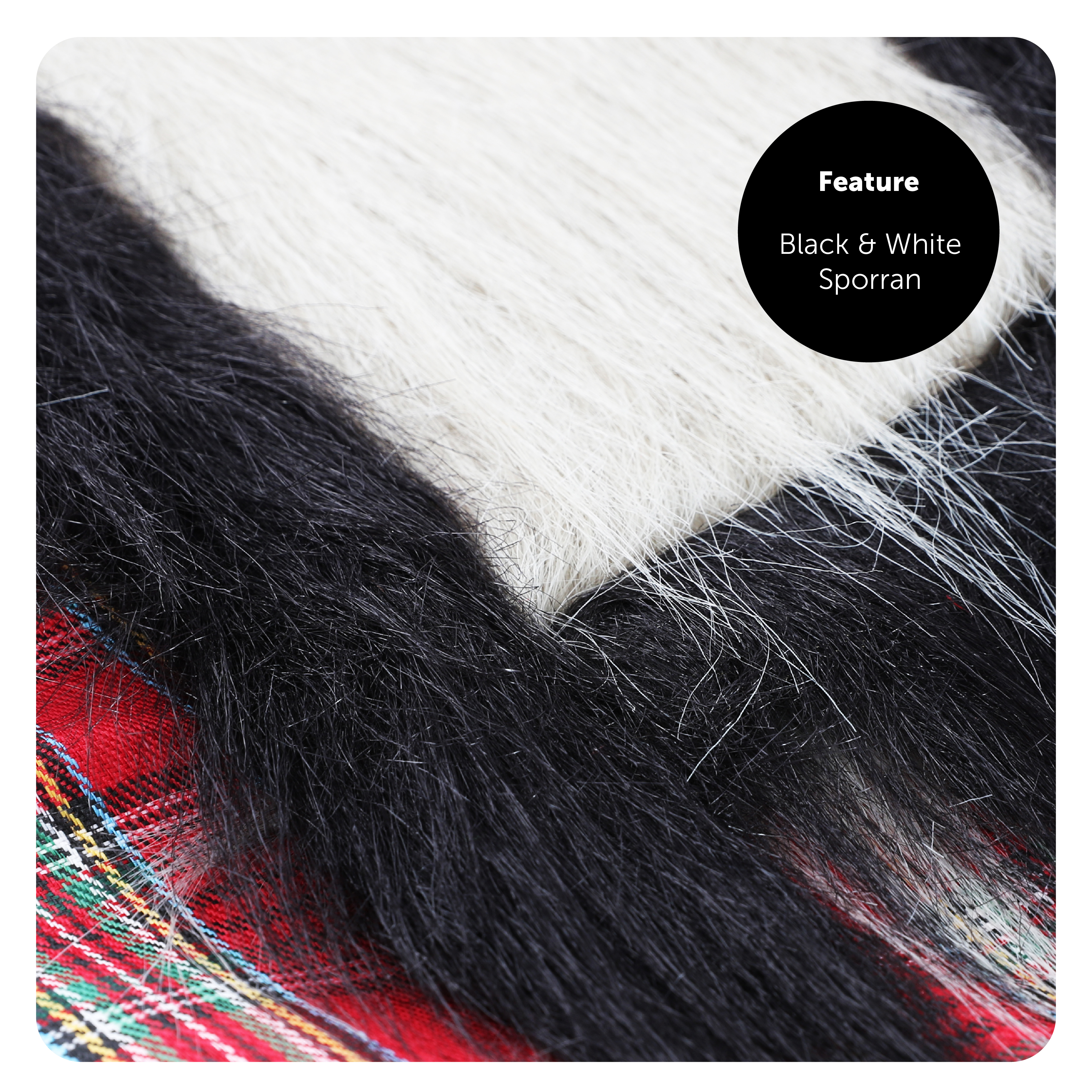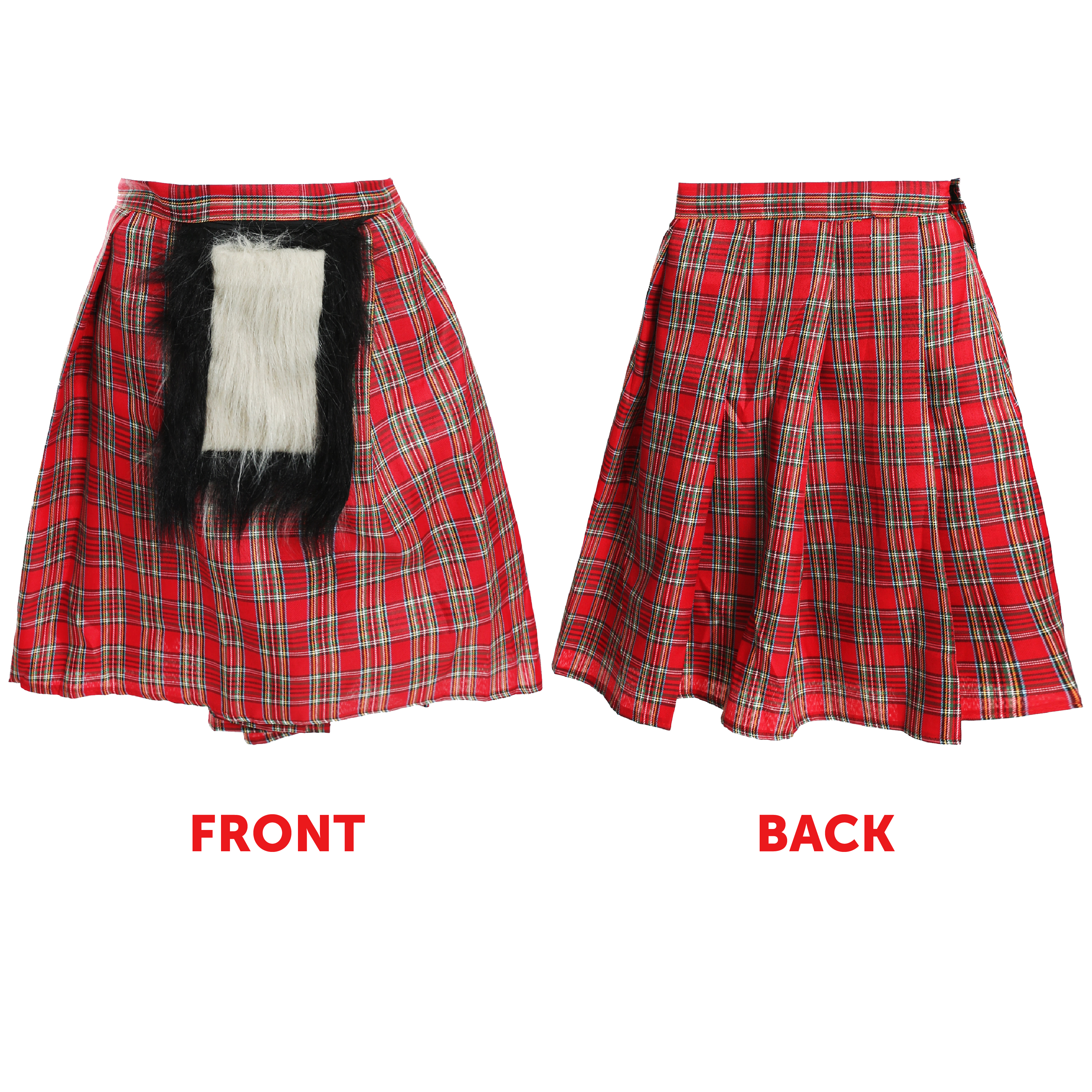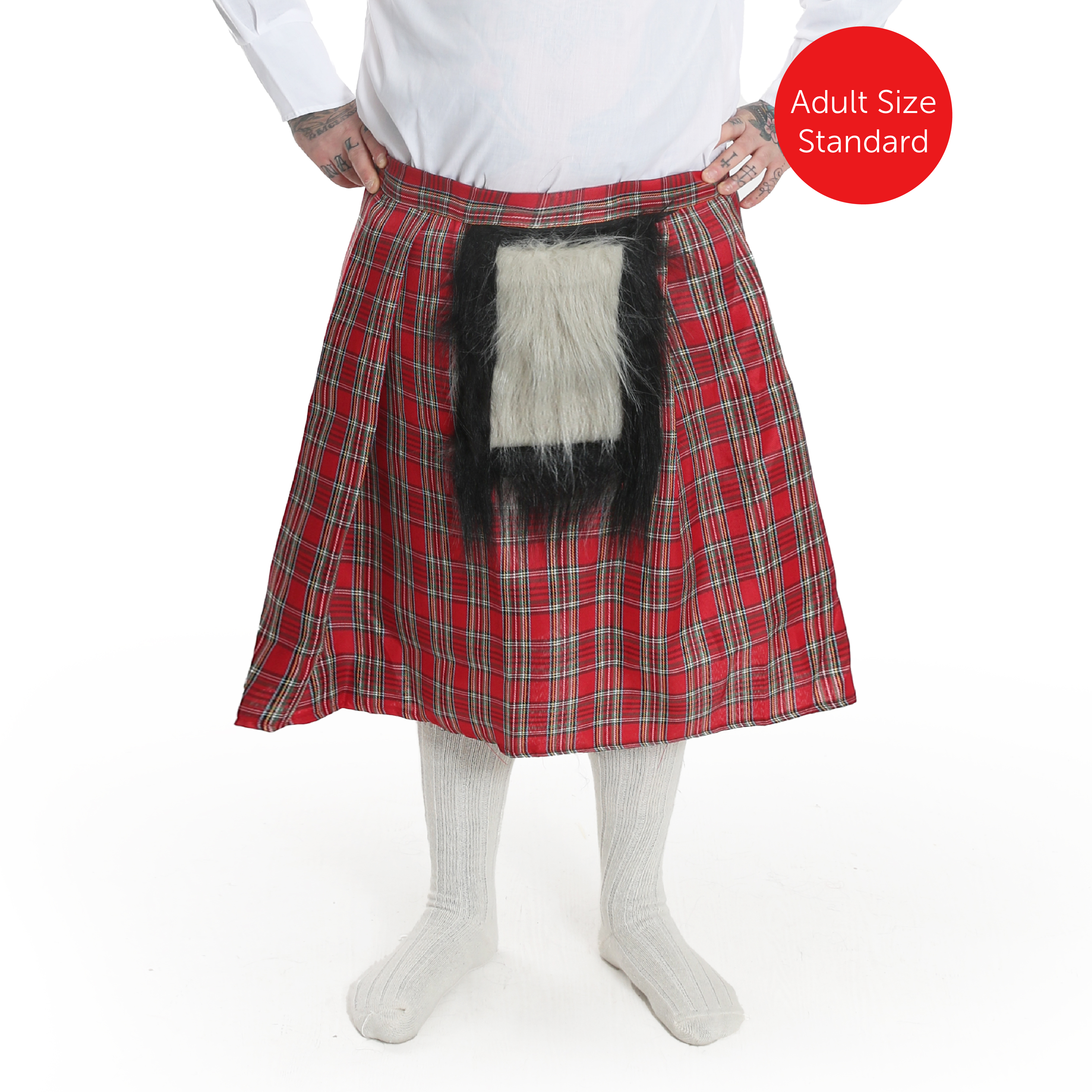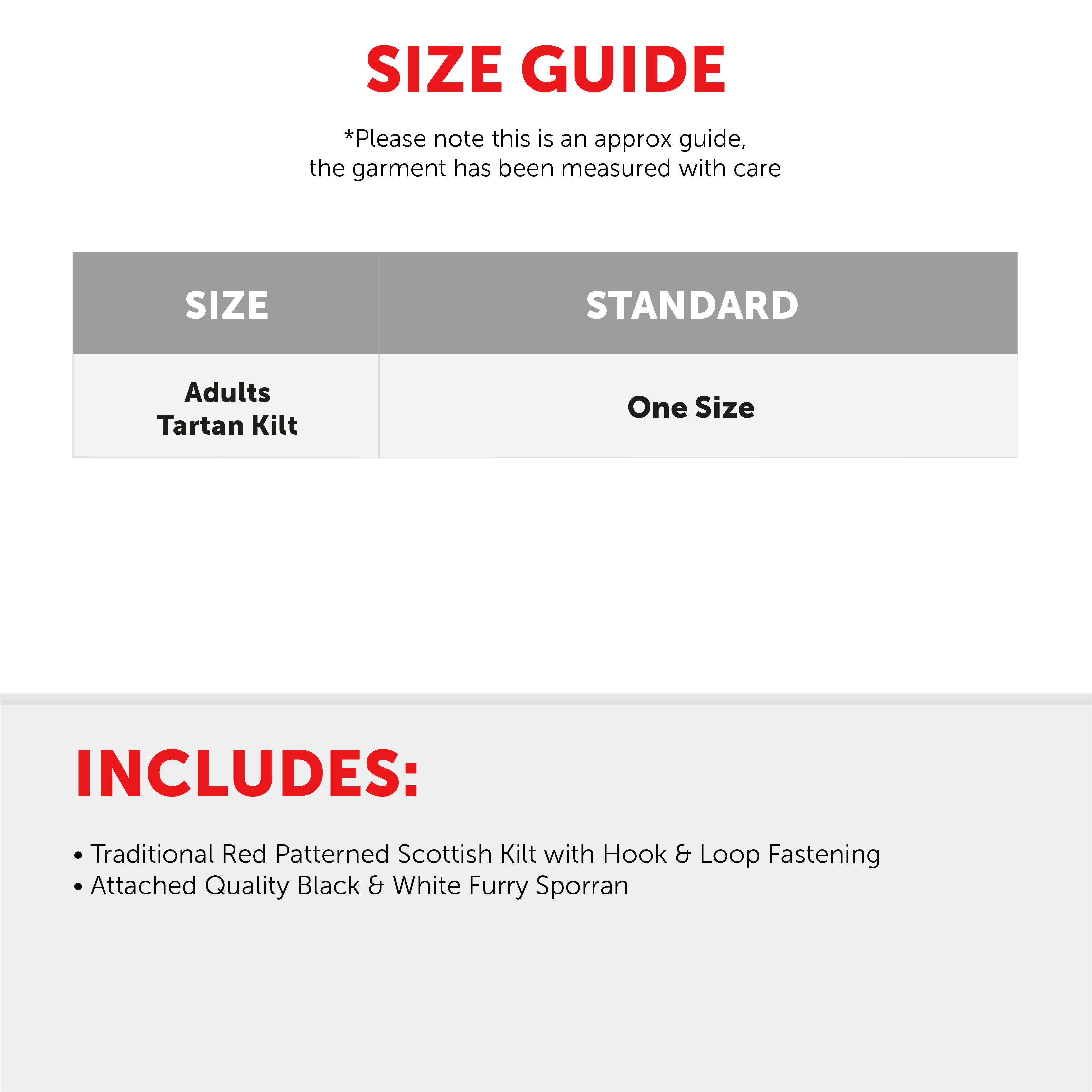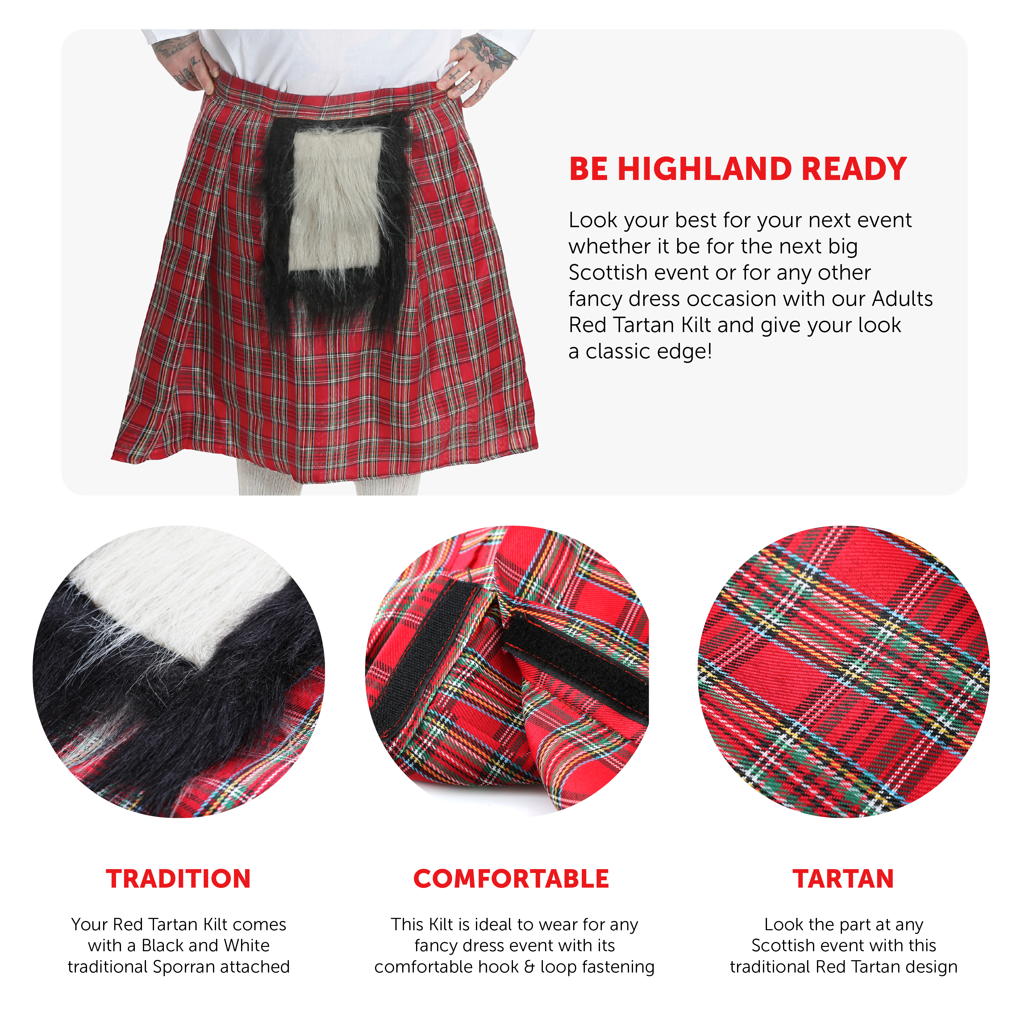 KILT DETAILS: The Adults Scottish Kilt is covered in a traditional styled Red Tartan pattern, with a soft Black and White Sporran attached to the front, and a comfortable hook and loop fastening design, you'll be sure to look bonny in this Scottish outfit!