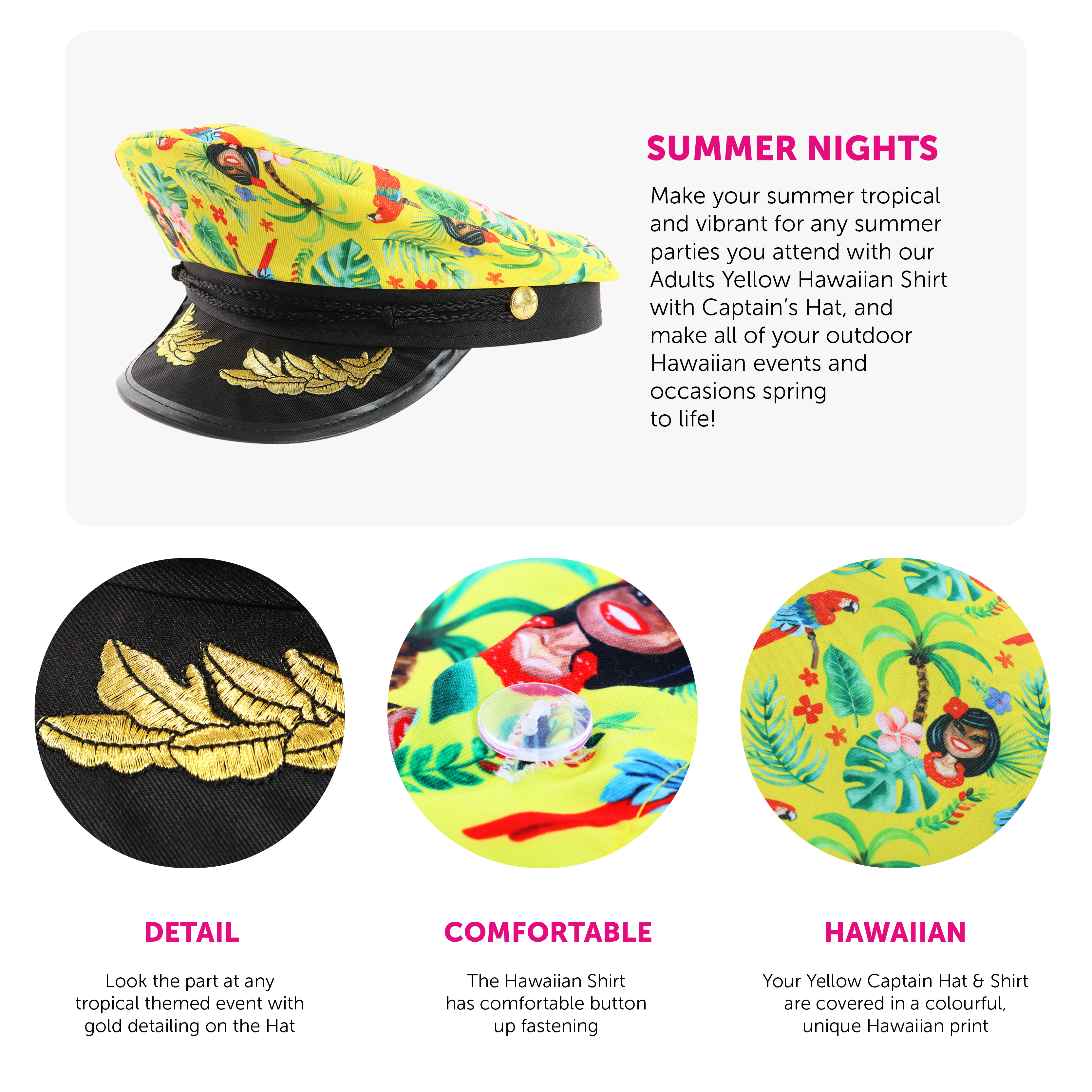 PERFECT FOR HAWAIIAN & SUMMER OCCASIONS: Whether you cook up a storm for a BBQ in the Summer, or attend a Hawaiian party, your Adults Yellow Hawaiian Shirt and Captain's Hat is sure to set the tone and raise everyone’s spirits high!
