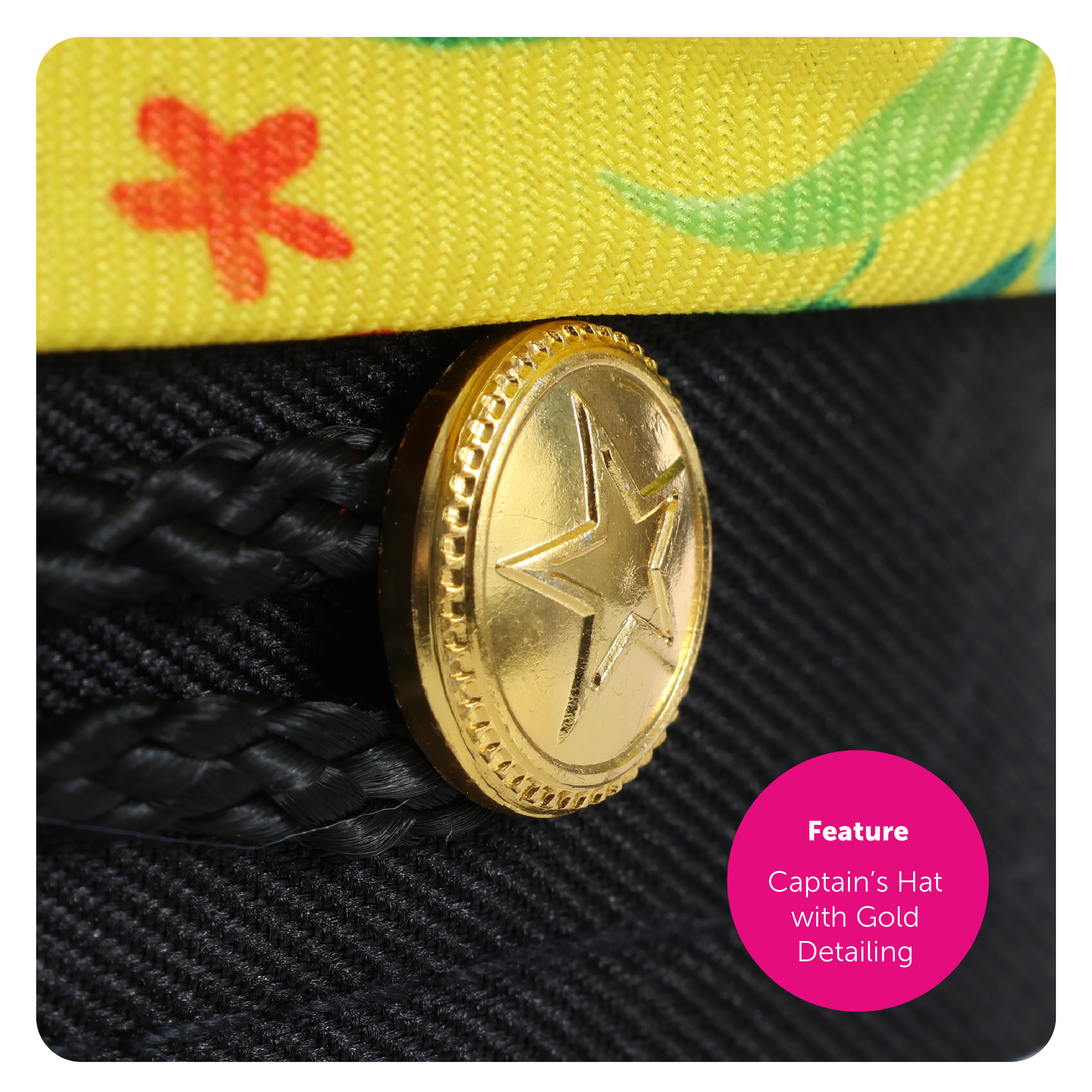 HAWAIIAN SET INCLUDES: Your Hawaiian Set includes a Short Sleeved Yellow Shirt detailed with a Hawaiian pattern, and a matching Yellow Captain's Hat with Gold detailing, the perfect look for any Summer event!