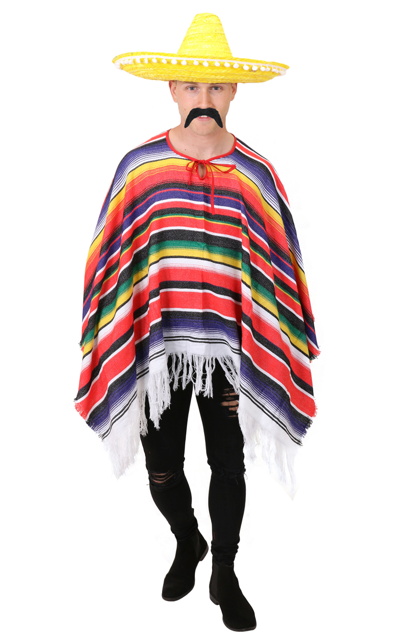 Hey Amigo! Turn into a Mexican the second you put on this Multicolour Mexican Poncho! With this Yellow Sombrero Hat and Mexican Tash, why not add a Mexican cigar to take this costume that extra mile!