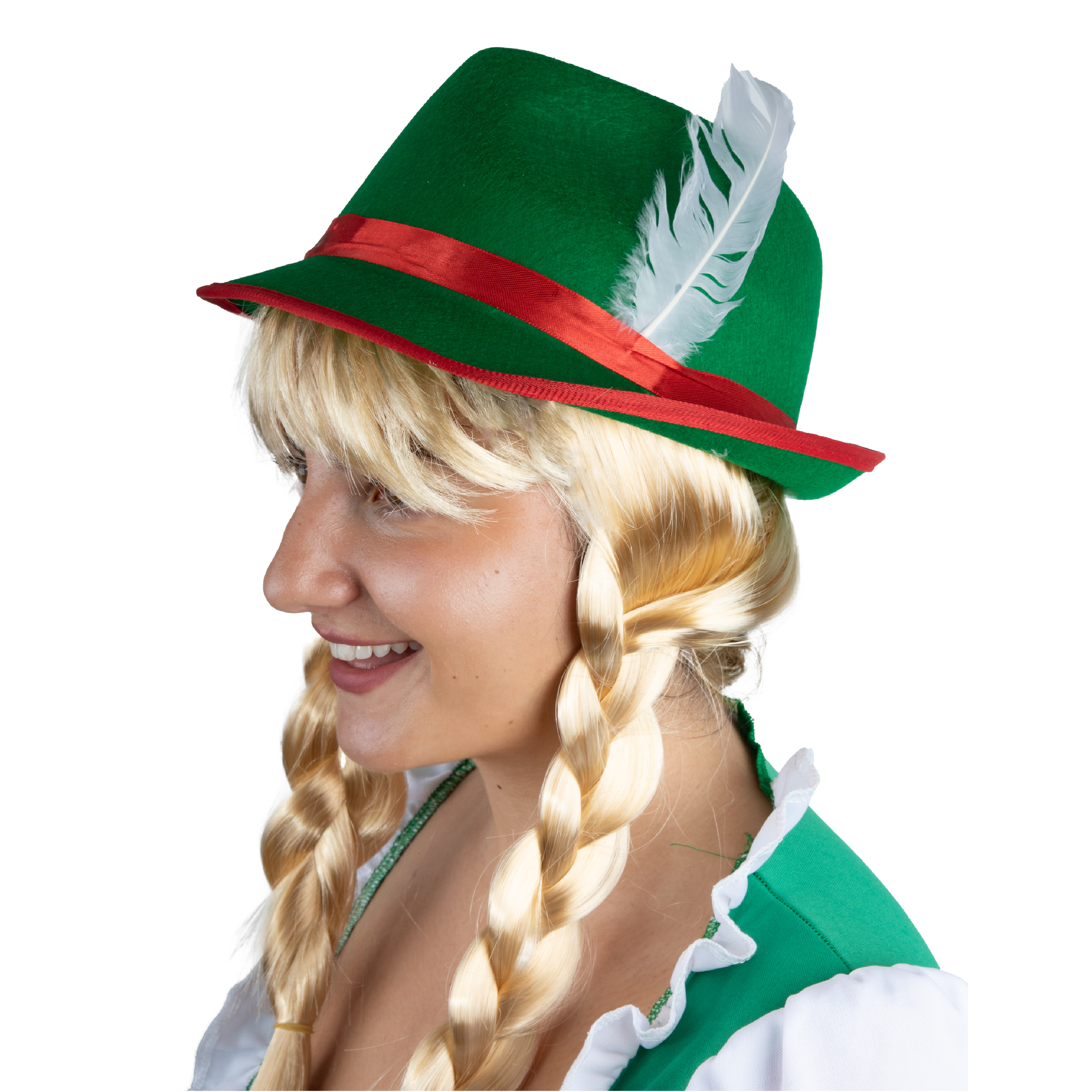 BAVARIAN SET INCLUDES: This Bavarian Set includes a Green Hat with a Red ribbon band and White Feather, and a Blonde Wig styled into long pigtail plaits, a great look for any event!