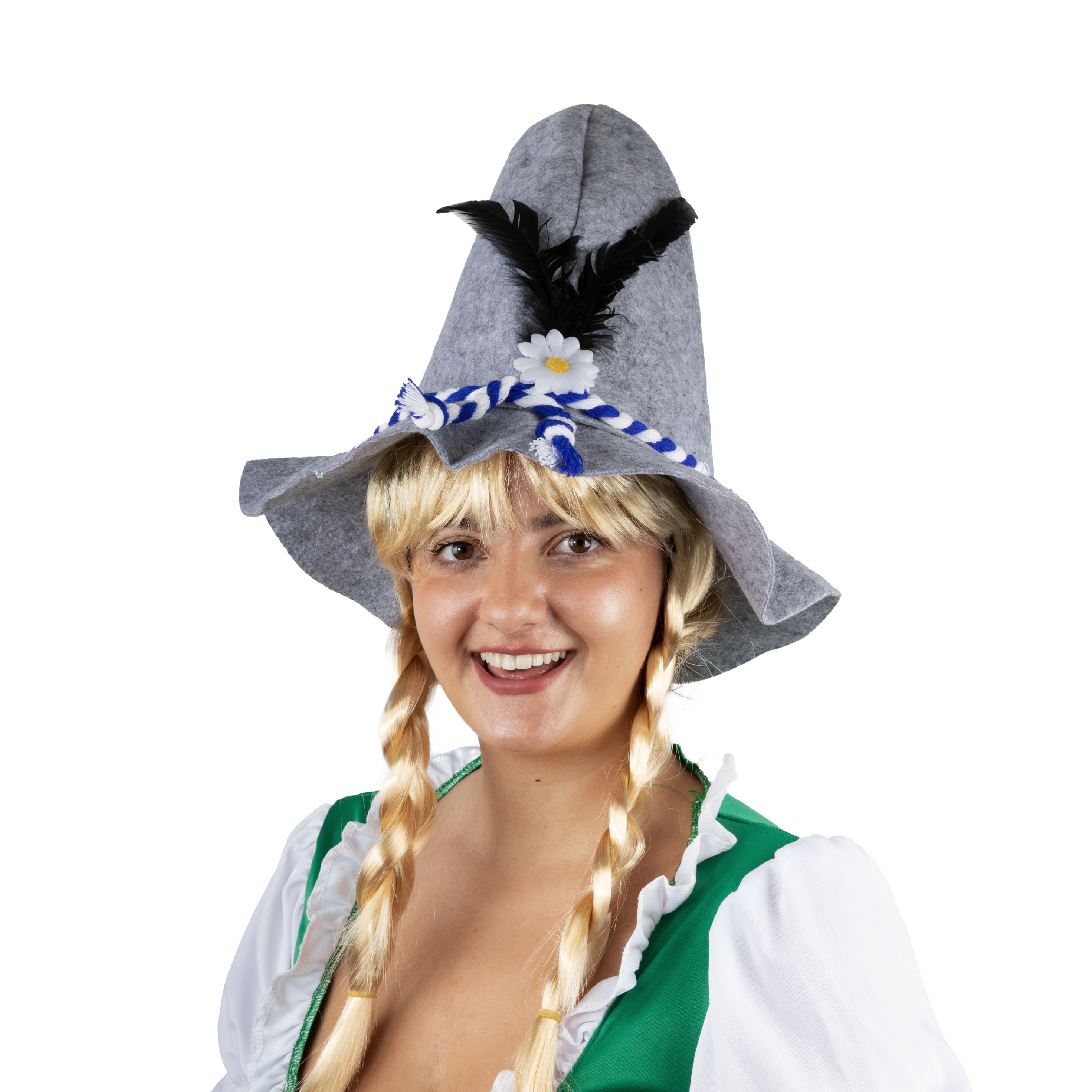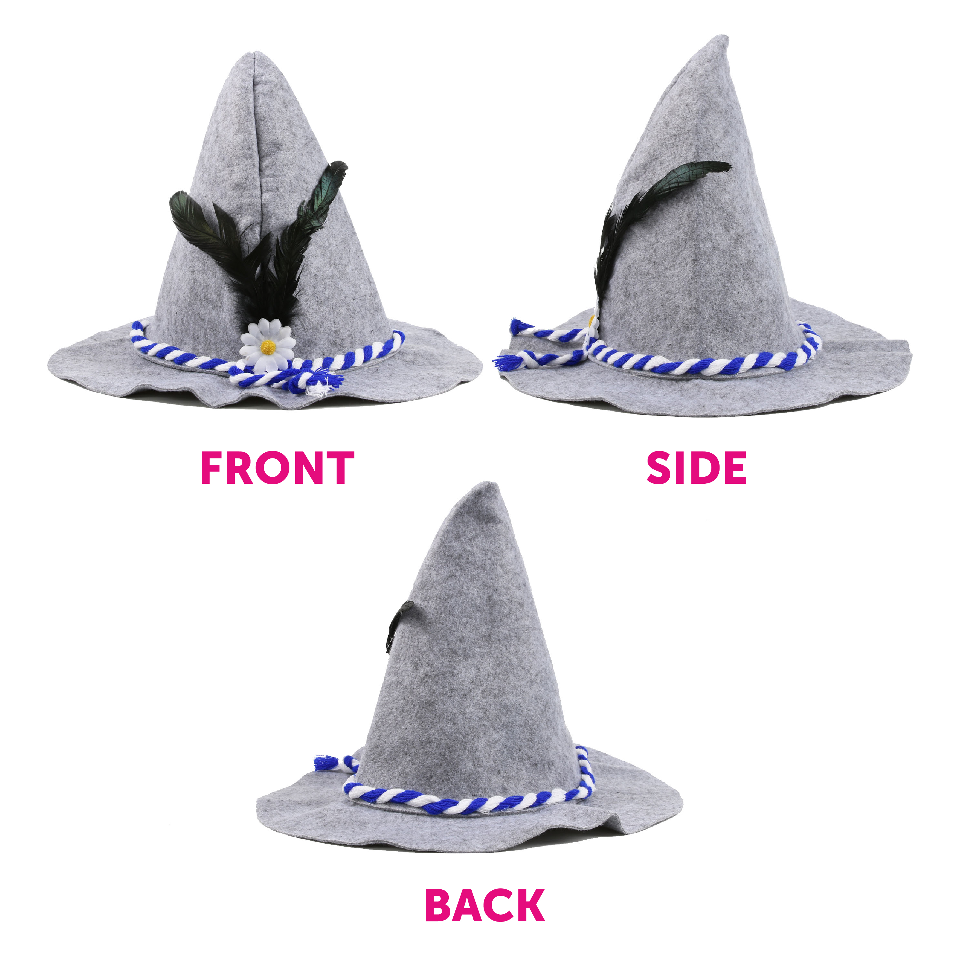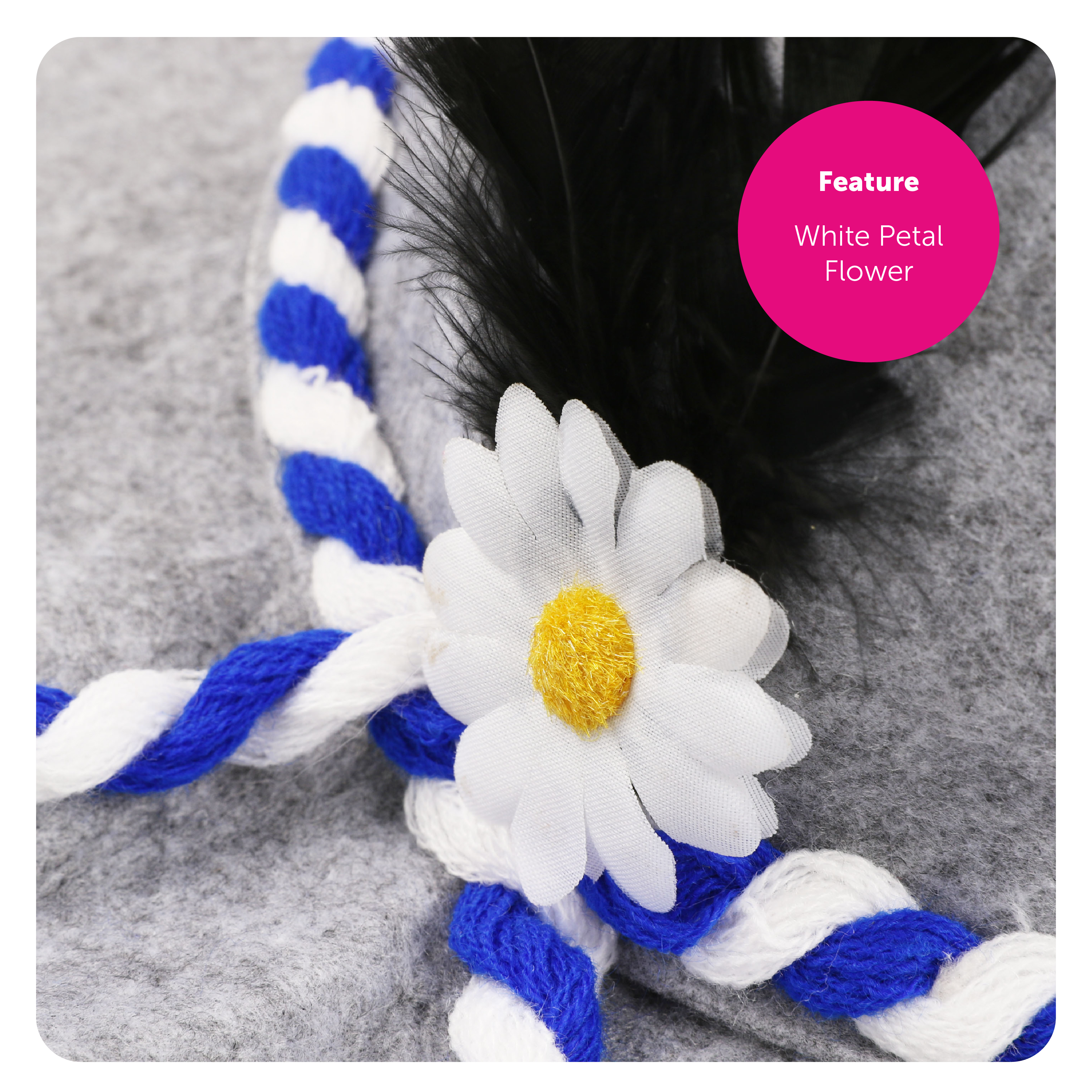 BAVARIAN HAT DETAILS: Your Seppel Bavarian Hat has is Grey Bavarian Cone Seppel Hat with a Black Feather and Band Detailing with a White Petal Flower on the side of the hat, with Blue and White rope around the crown of the hat!