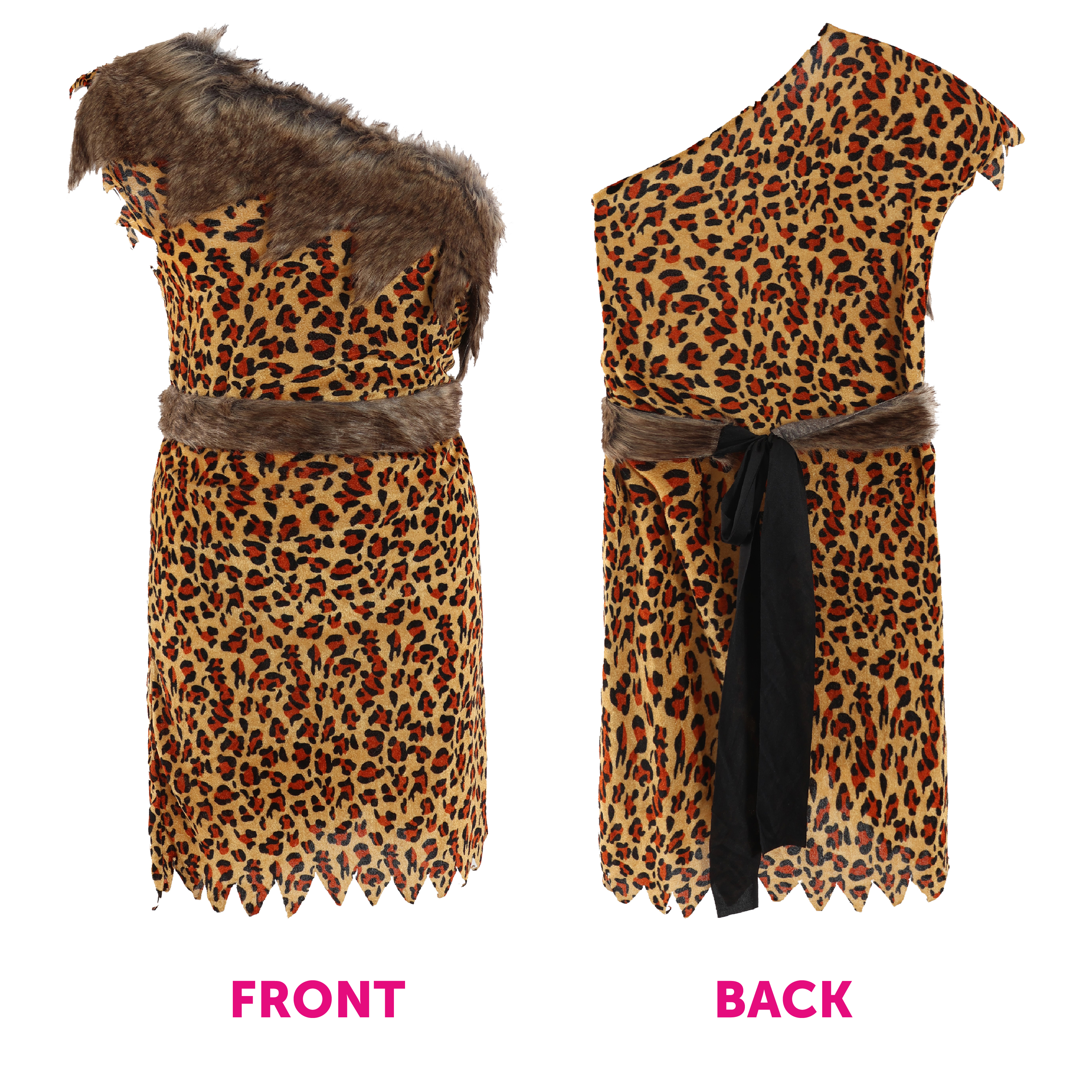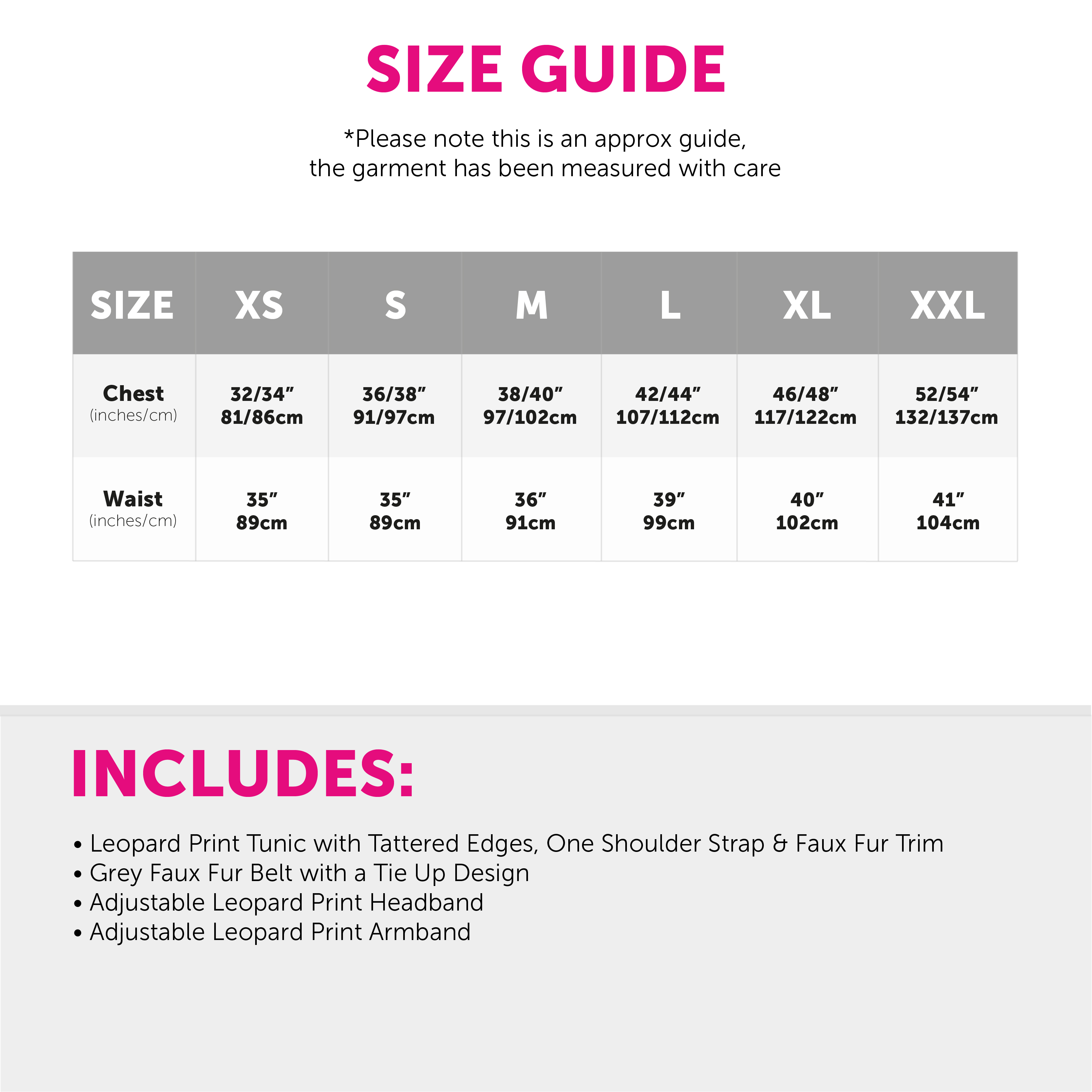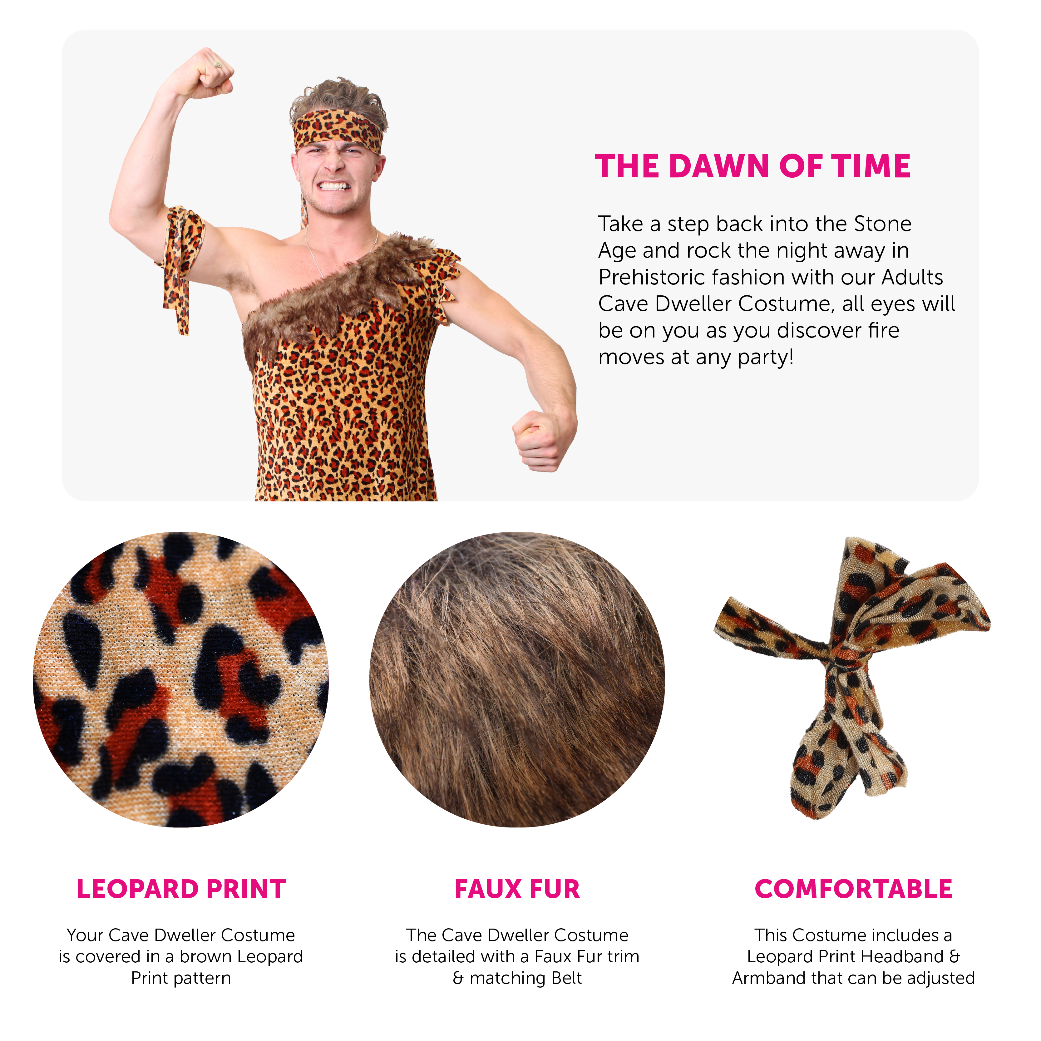 COSTUME DETAILS: This Adults Cave Dweller Costume is a tattered edge Leopard Print Tunic with one shoulder strap, Grey Faux Fur trim and a Belt, a matching Leopard Print Headband and matching Armband!