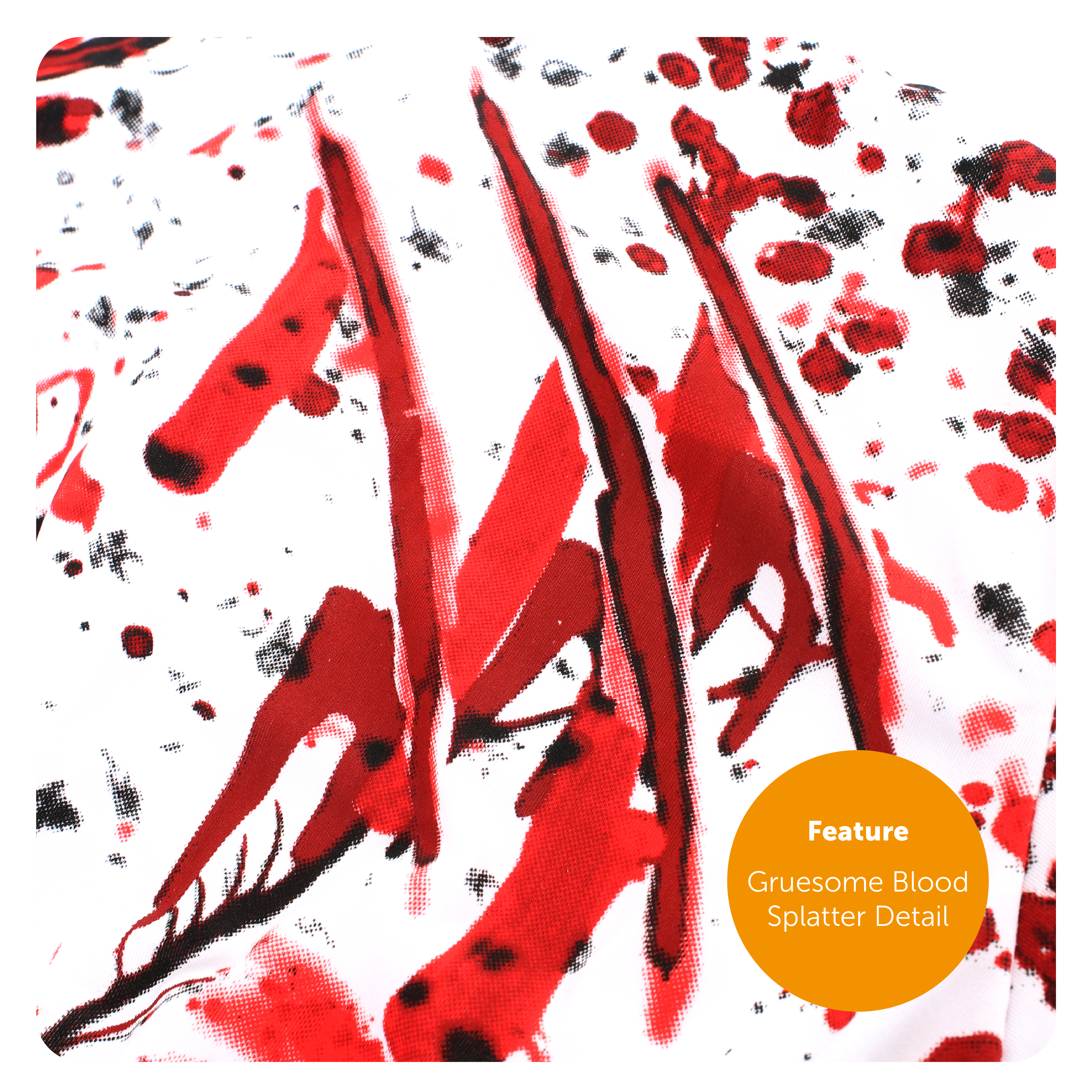 BLOODY SKINSUIT DETAILS: Your Adults Overkill Bloody Skinsuit is a costume with a gruesome Blood splattered design on the front and back, and a zipper on the back of the costume to allow for easy access to slip in and out comfortably!