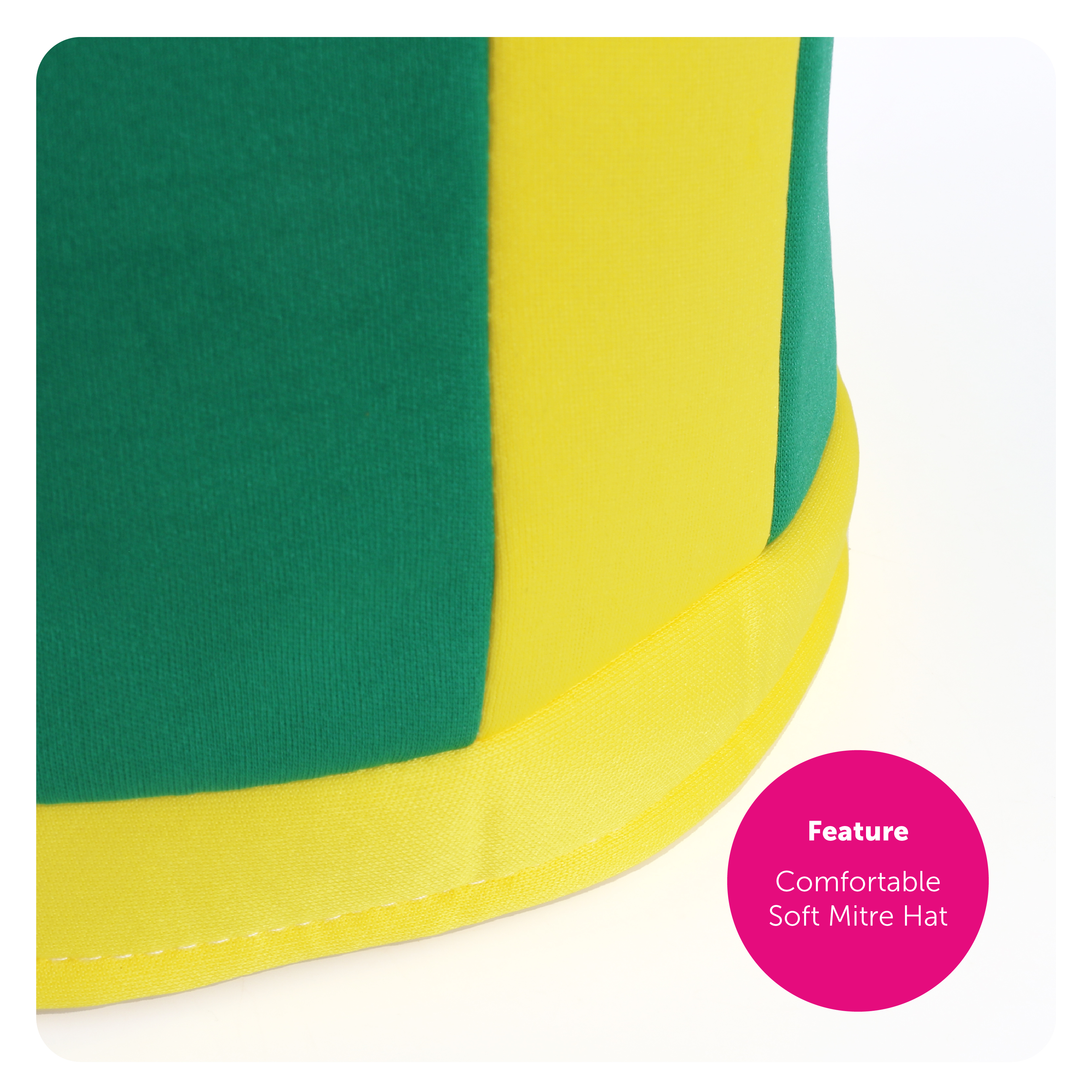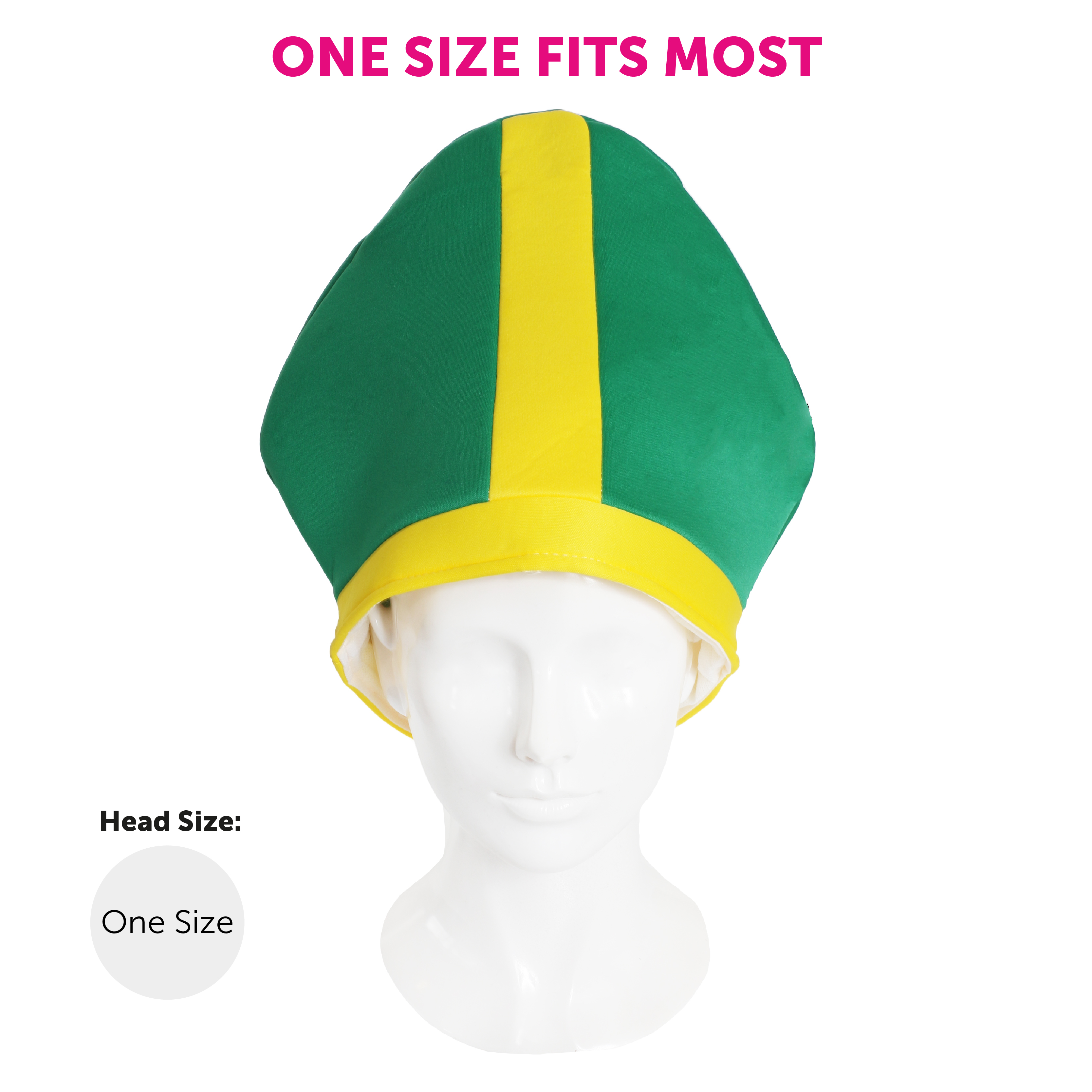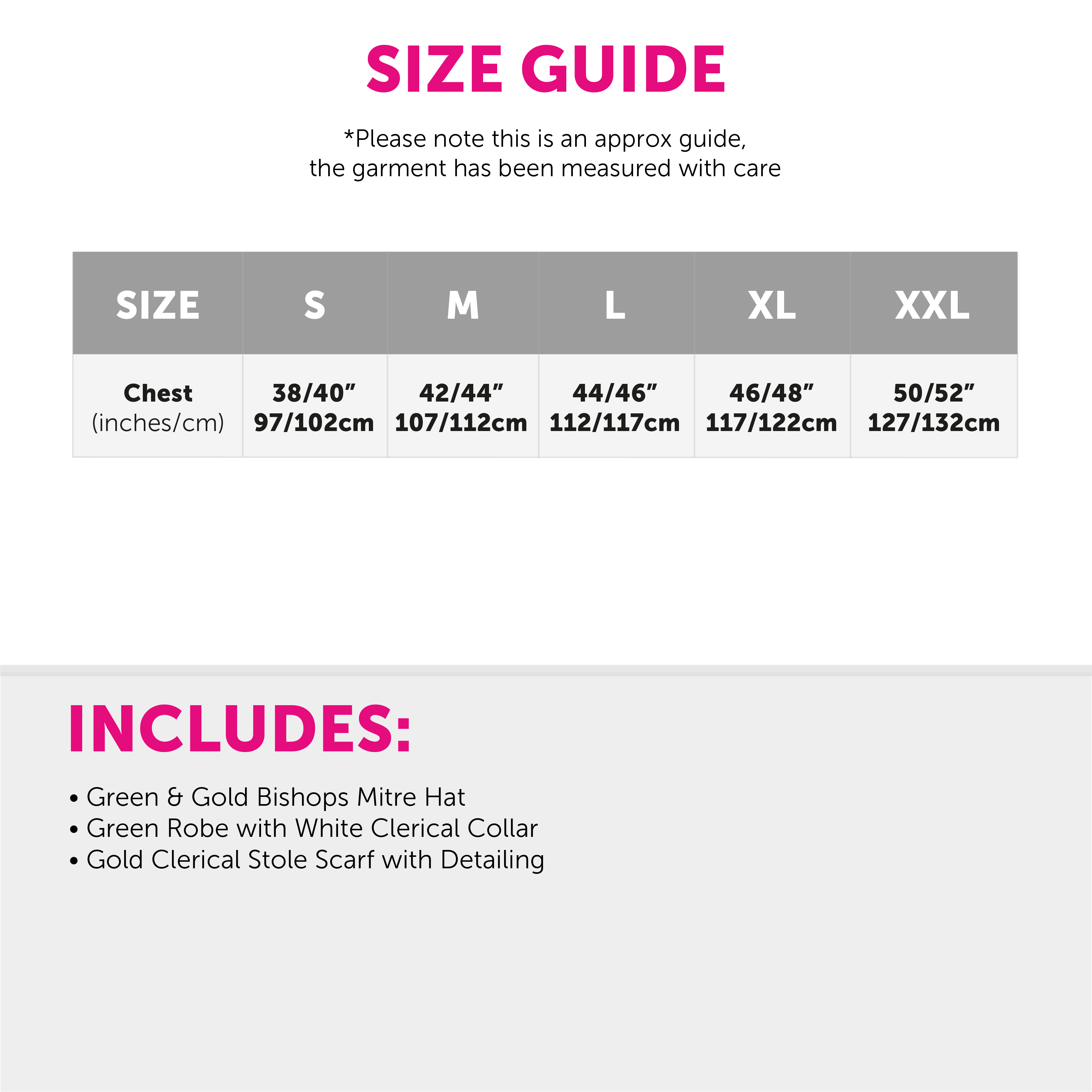 COSTUME INCLUDES: This Irish Priest costume includes an Irish Catholic Bishops Green & Gold Mitre Hat, Irish Bishops Green Cassock Robe with White Clerical Collar, Clerical Gold Stole Scarf with Fleur De Lis Detail, and a Bishops Pectoral Gold Cross