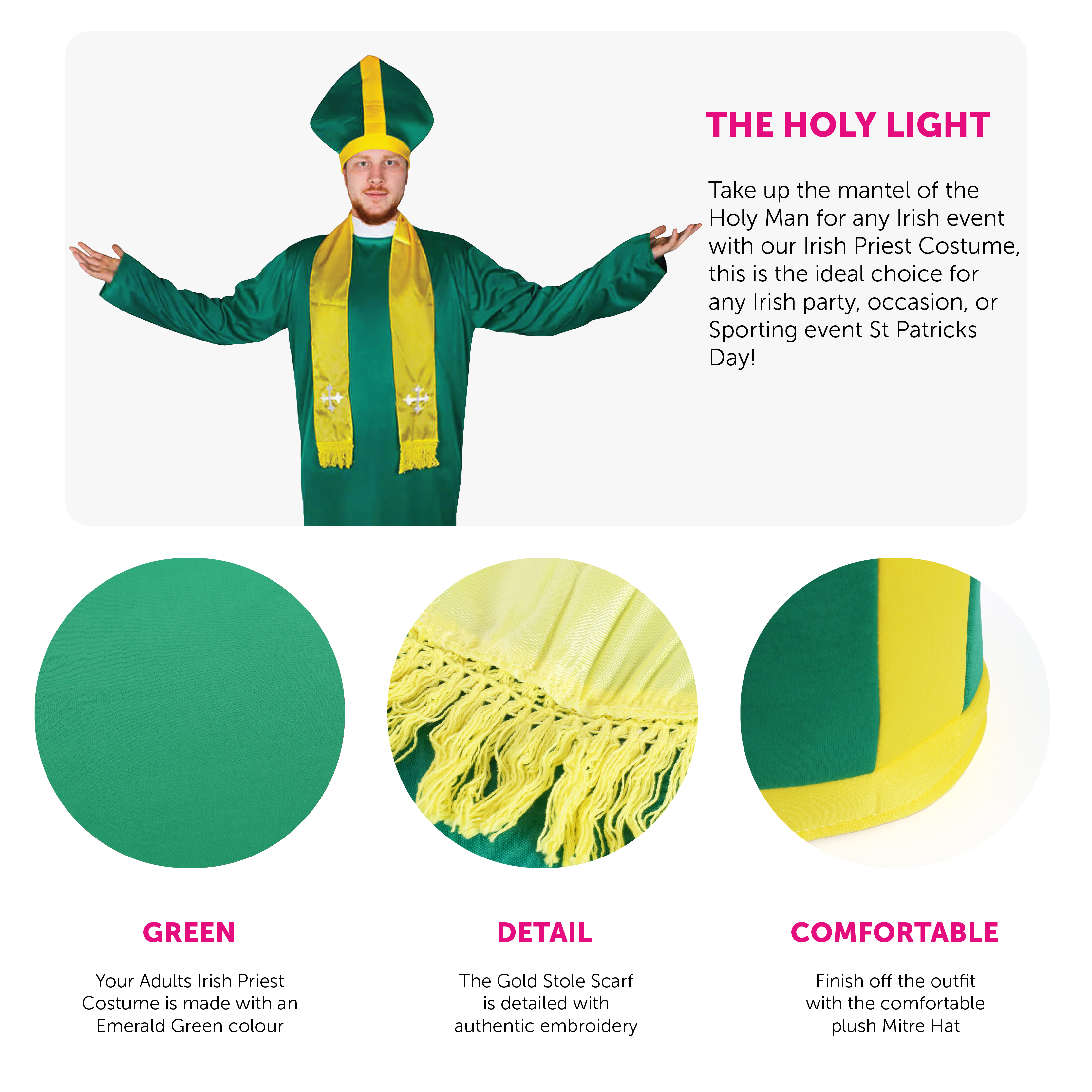 IRISH PRIEST COSTUME: Take up the mantel of the Holy Man for any Irish event with our Irish Priest Costume, this grand green robed fancy dress costume is the ideal choice for any Irish party, event, occasion, or Irish supporter for St Patricks Day!