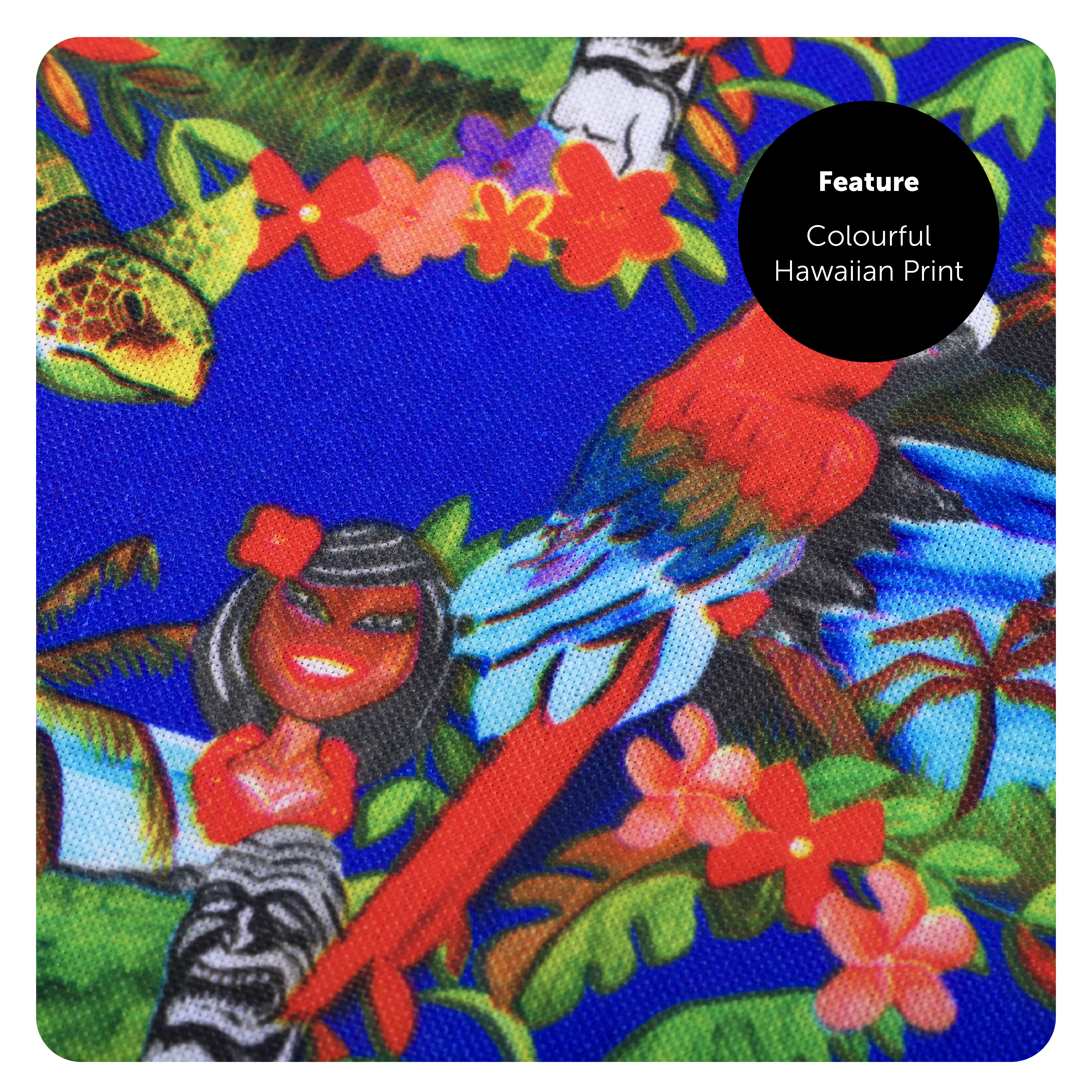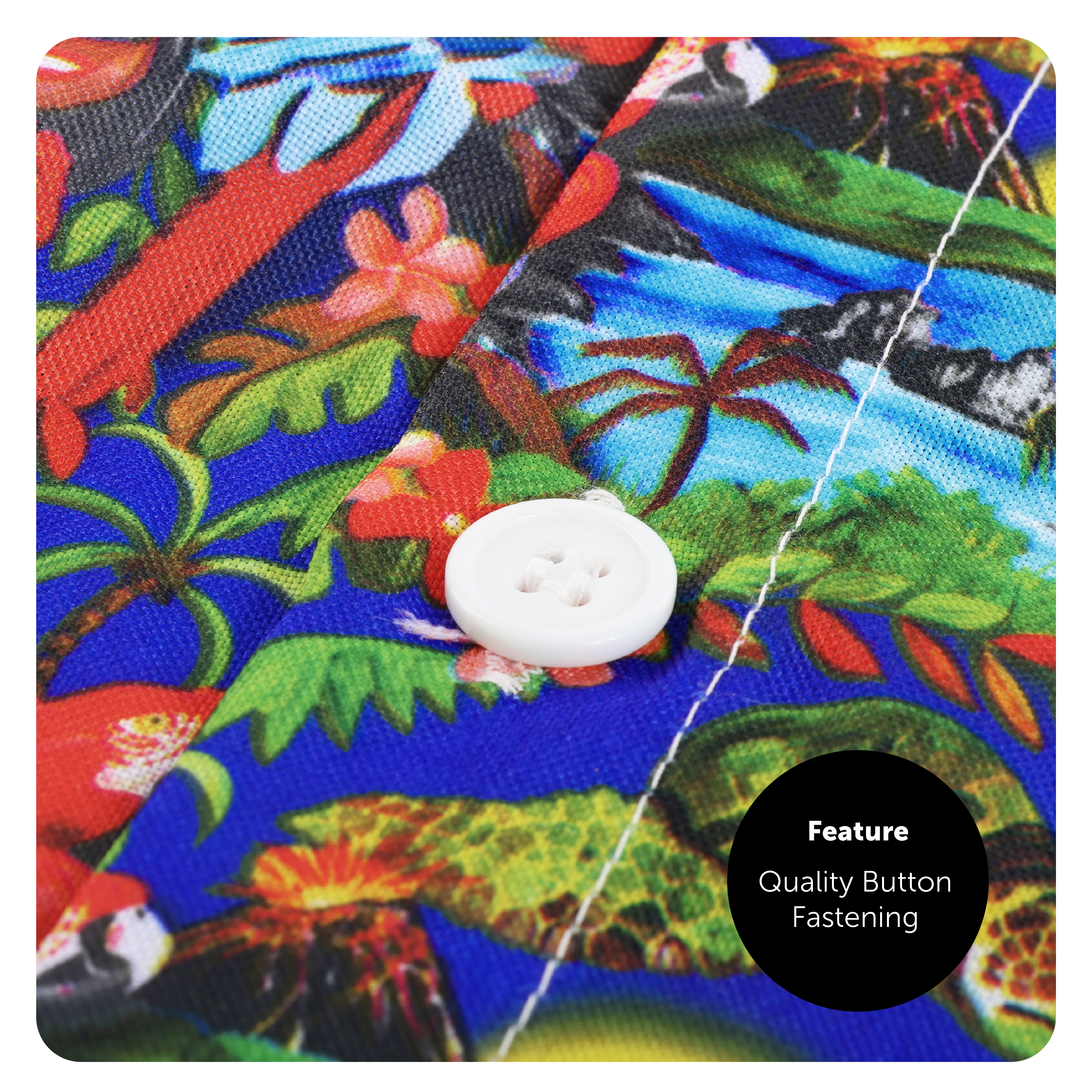 HAWAIIAN SHIRT DETAILING: Not only will the brilliant primary colour of the shirt be a standout summertime must-have, but it is also complete with fantastic Hawaiian detailing and imagery, with Parrots, Golden Time Sunsets, Palm Trees, and the Ocean!