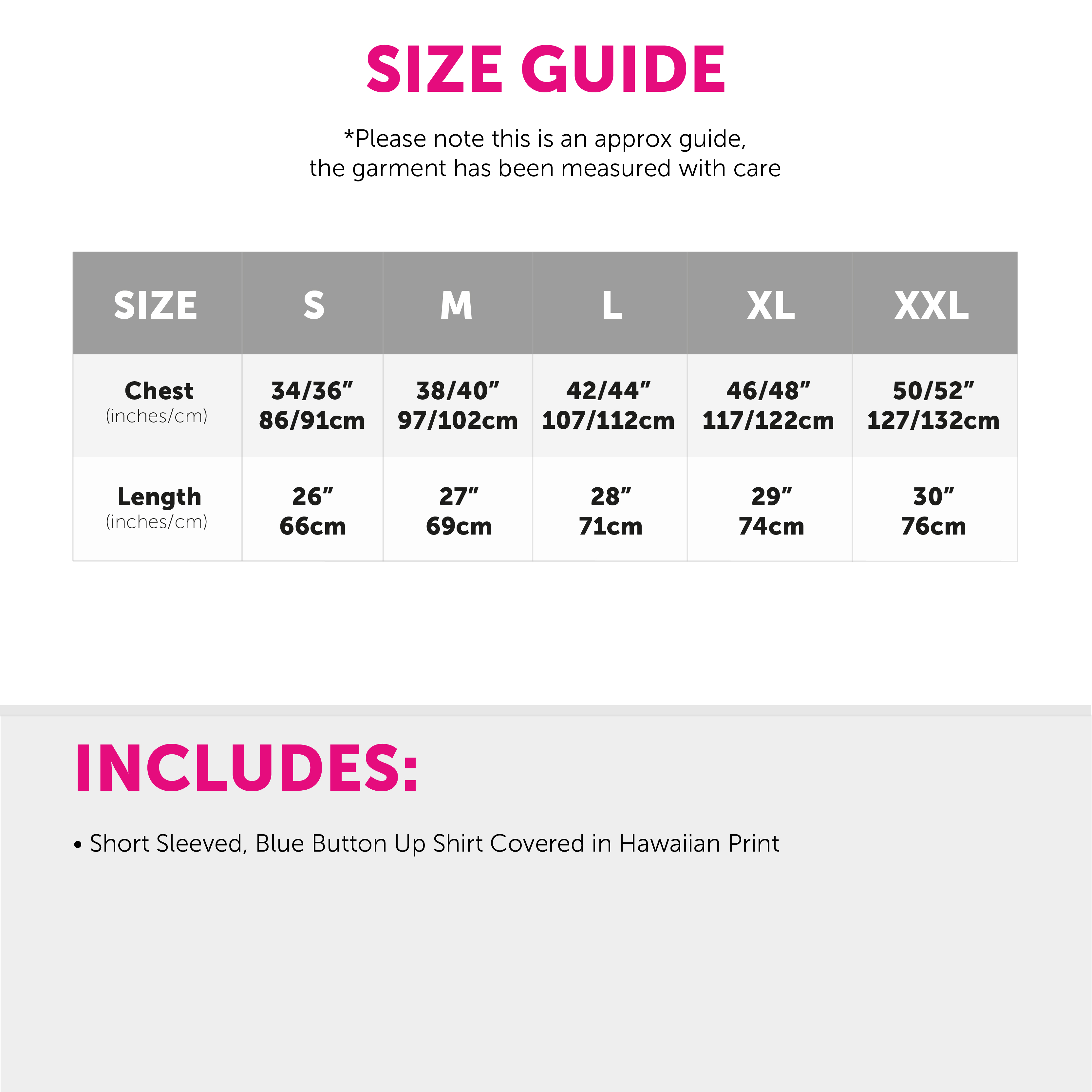 AVAILABLE IN MULTIPLE SIZES: Your Blue Hawaiian Shirt is available in multiple sizes from Small – XX-Large: Small: Chest 34/36" (86/91cm), Length 26" (66cm) | Medium: Chest 38/40” (97/102cm), Length 27” (69cm) | Large: Chest 42/44” (107/112cm), Length 28” (71cm) | X-Large: Chest 46/48" (117/122cm), Length 29" (74cm) | XX-Large: Chest 50/52" (127/132cm), Length 30" (76cm)