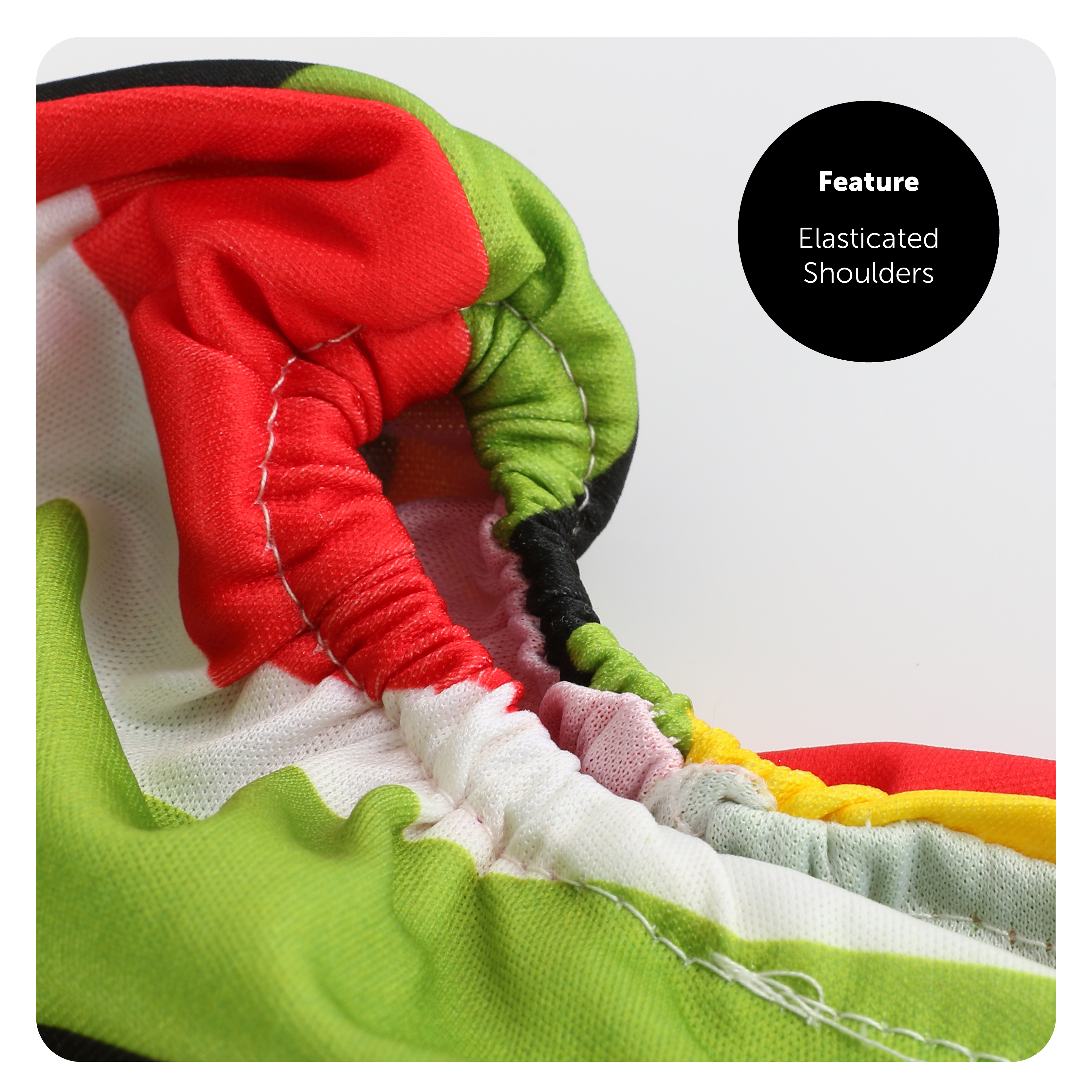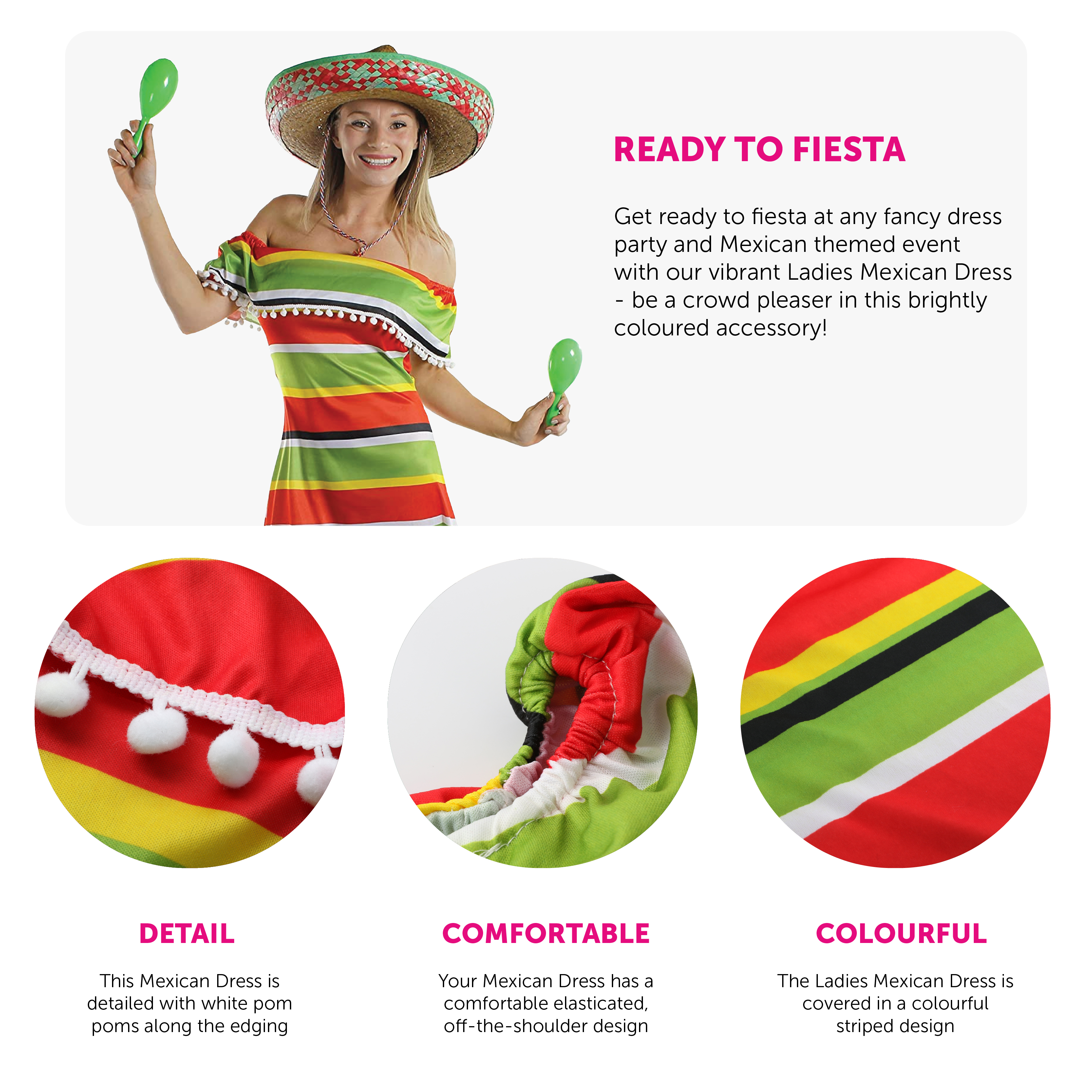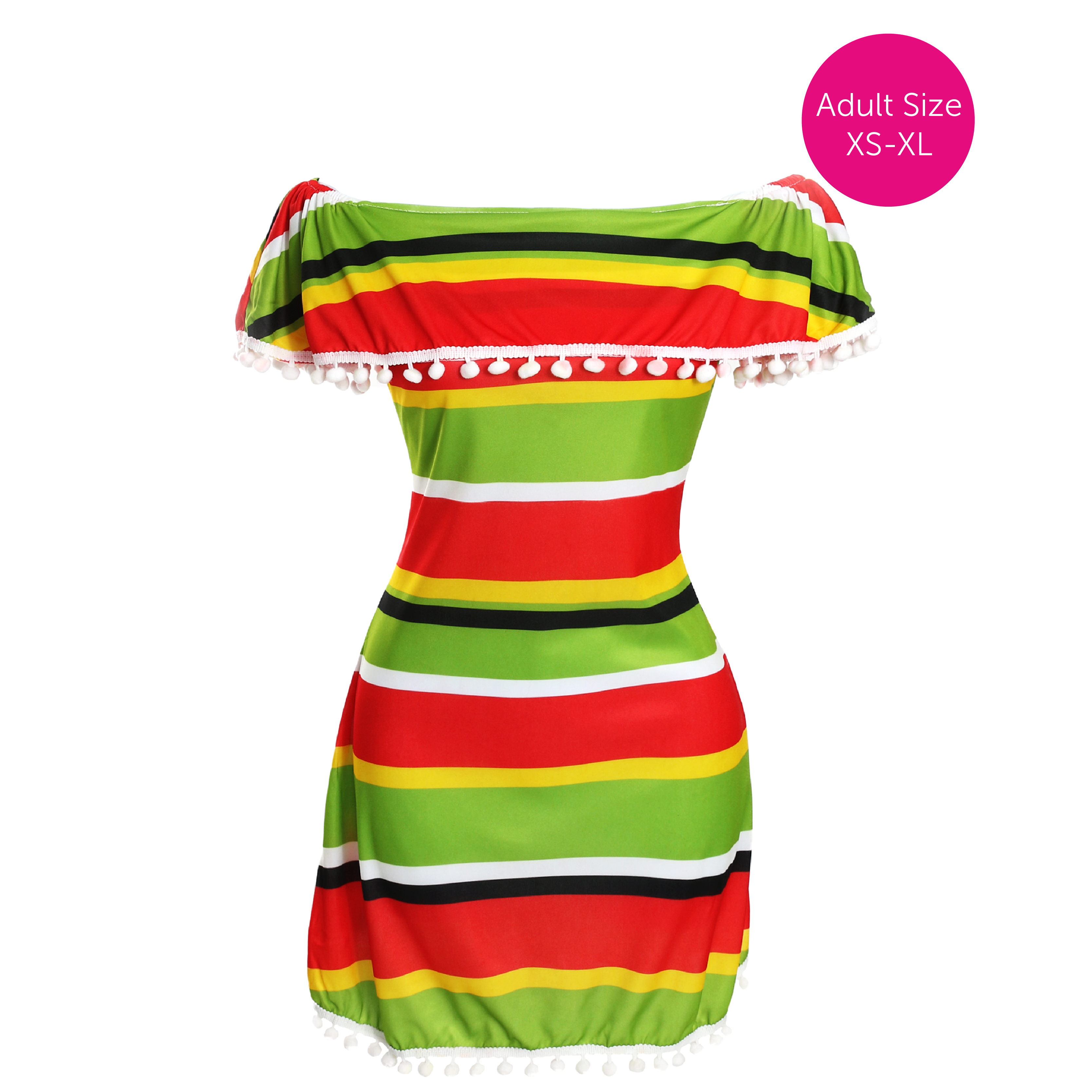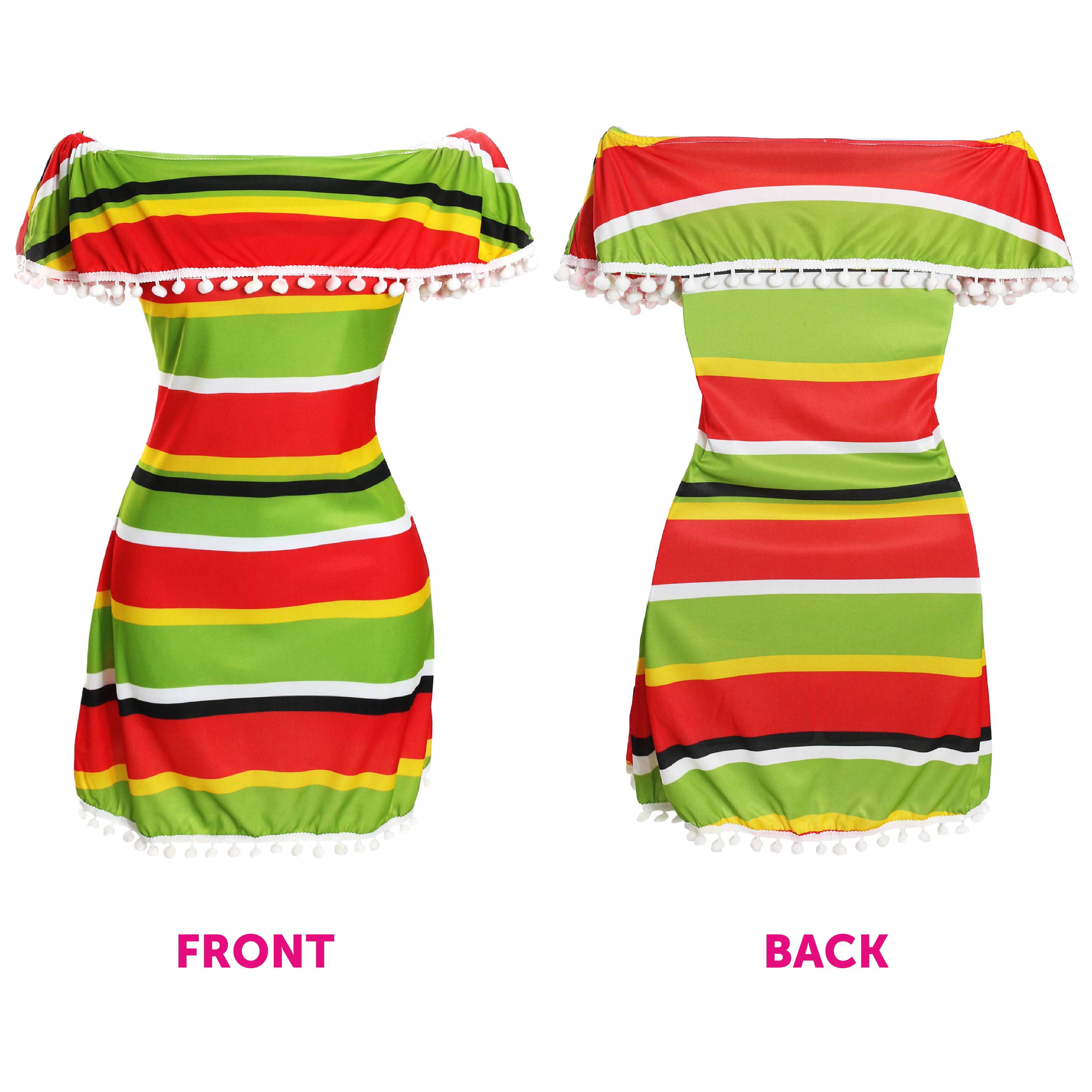 MEXICAN DRESS DETAILS: Your Ladies Mexican Dress is a striped Off-the-Shoulder dress with Pom-Pom layers and edging, with a multicoloured palette of Green, Red, Yellow, Black, and White to make your dress stand out with style in traditional colours!