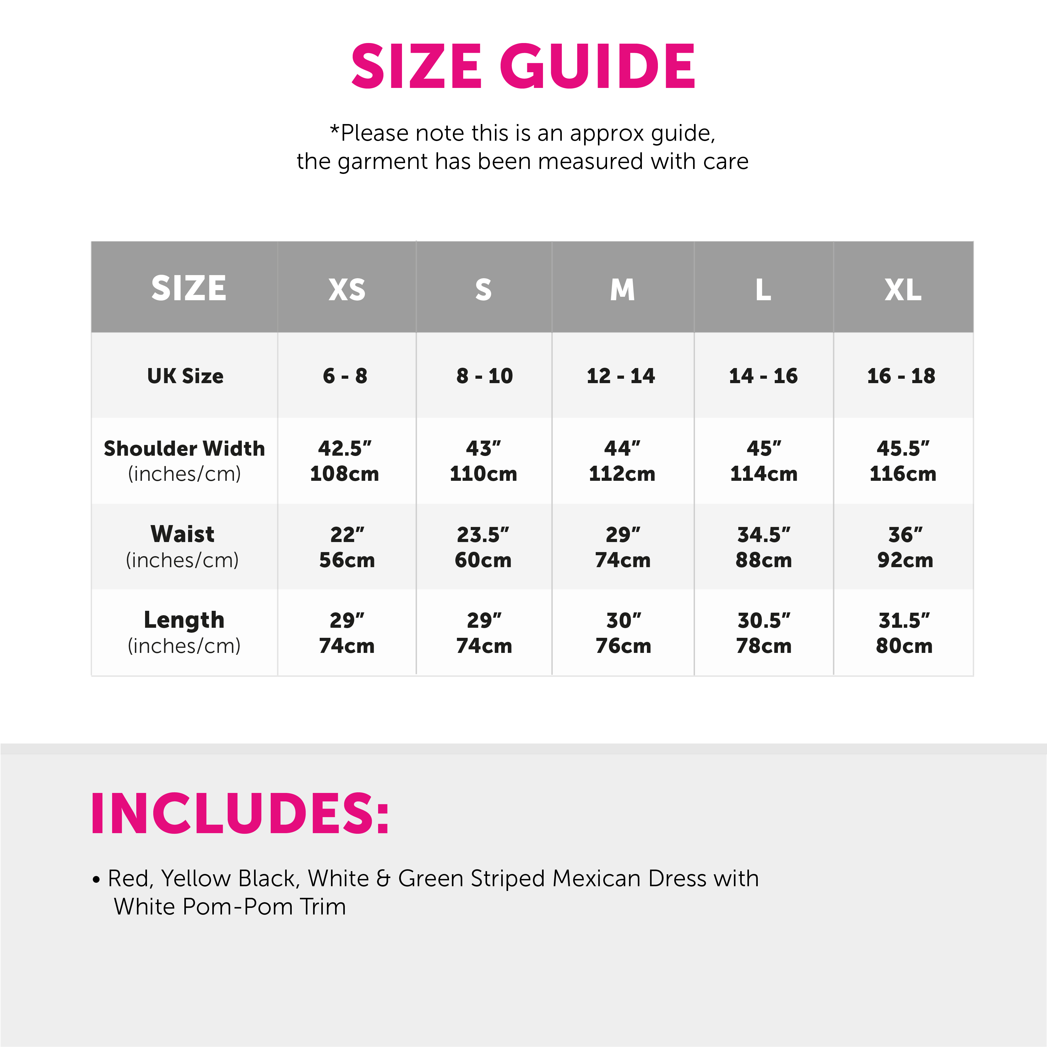 AVAILABLE IN MULTIPLE SIZES: Your Ladies Mexican Dress is available in multiple sizes, from X-Small to X-Large: X-Small (UK 6 - 8) Shoulder Width 42.5" (108cm), Waist 22" (56cm), Length 29" (74cm) | Small (UK 8 - 10) Shoulder Width 43" (110cm), Waist 23.5" (60cm), Length 29" (74cm) | Medium (UK 12 - 14) Shoulder Width 44" (112cm), Waist 29" (74cm), Length 30" (76cm) | Large (UK 14 - 16) Shoulder Width 45" (114cm), Waist 34.5" (88cm), Length 30.5" (78cm) | X-Large (UK 16 - 18) Shoulder Width 45.5" (116cm), Waist 36" (92cm), Length 31.5" (80cm)