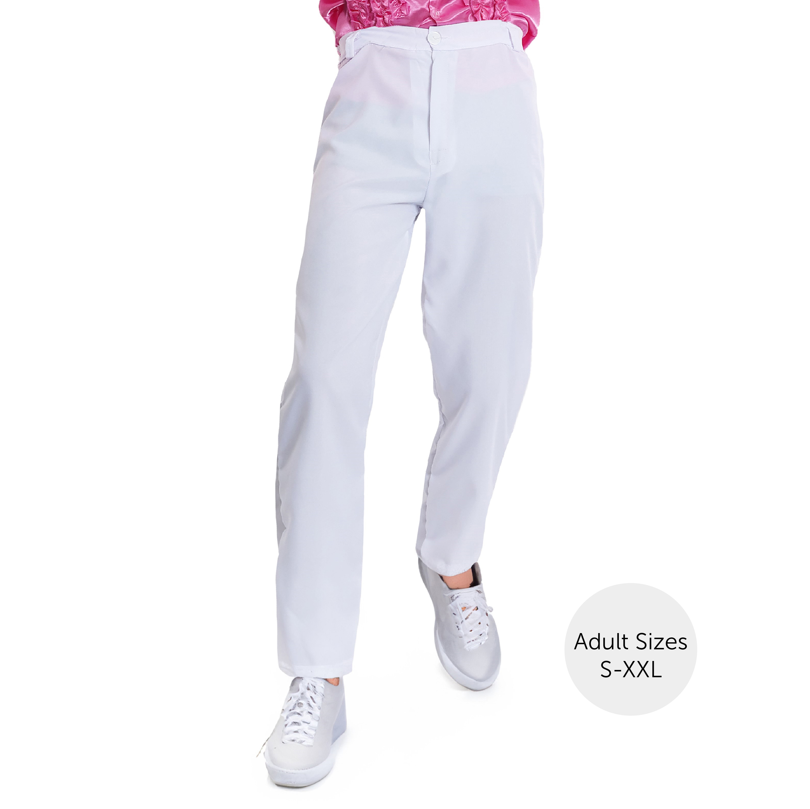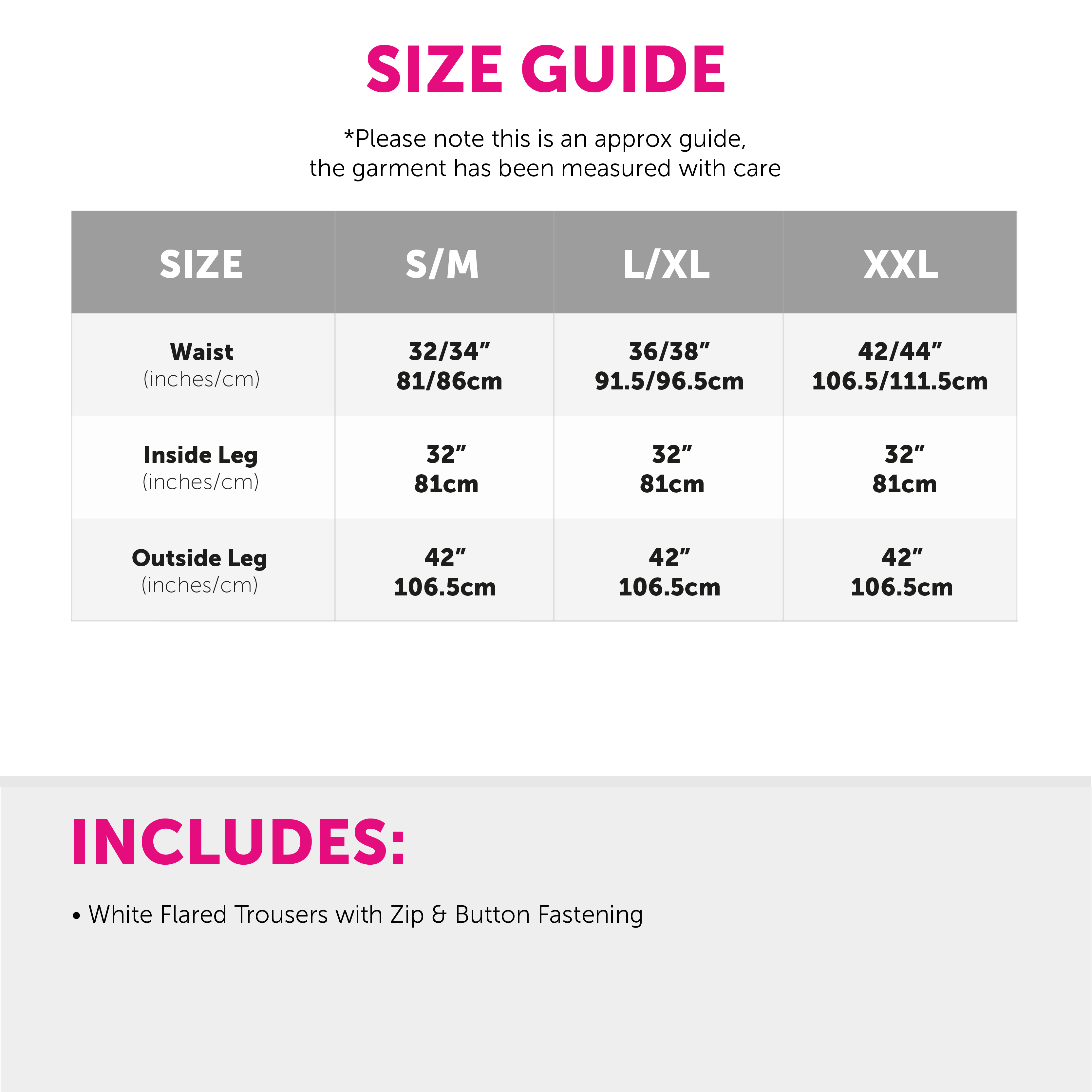 AVAILABLE IN MULTIPLE SIZES: Your Adults White Disco Flare Trousers are available in various sizes ranging from Small to XX-Large: Small/Medium - Waist: 32/34" (81/86cm), Inside Leg: 32" (81cm), Outside Leg: 42" (106.5cm) | Large/X-Large - Waist: 36/38" (91.5/96.5cm), Inside Leg: 32" (81cm), Outside Leg: 42" (106.5cm) | XX-Large - Waist: 42/44" (106.5/111.5cm), Inside Leg: 32" (81cm), Outside Leg: 42" (106.5cm)