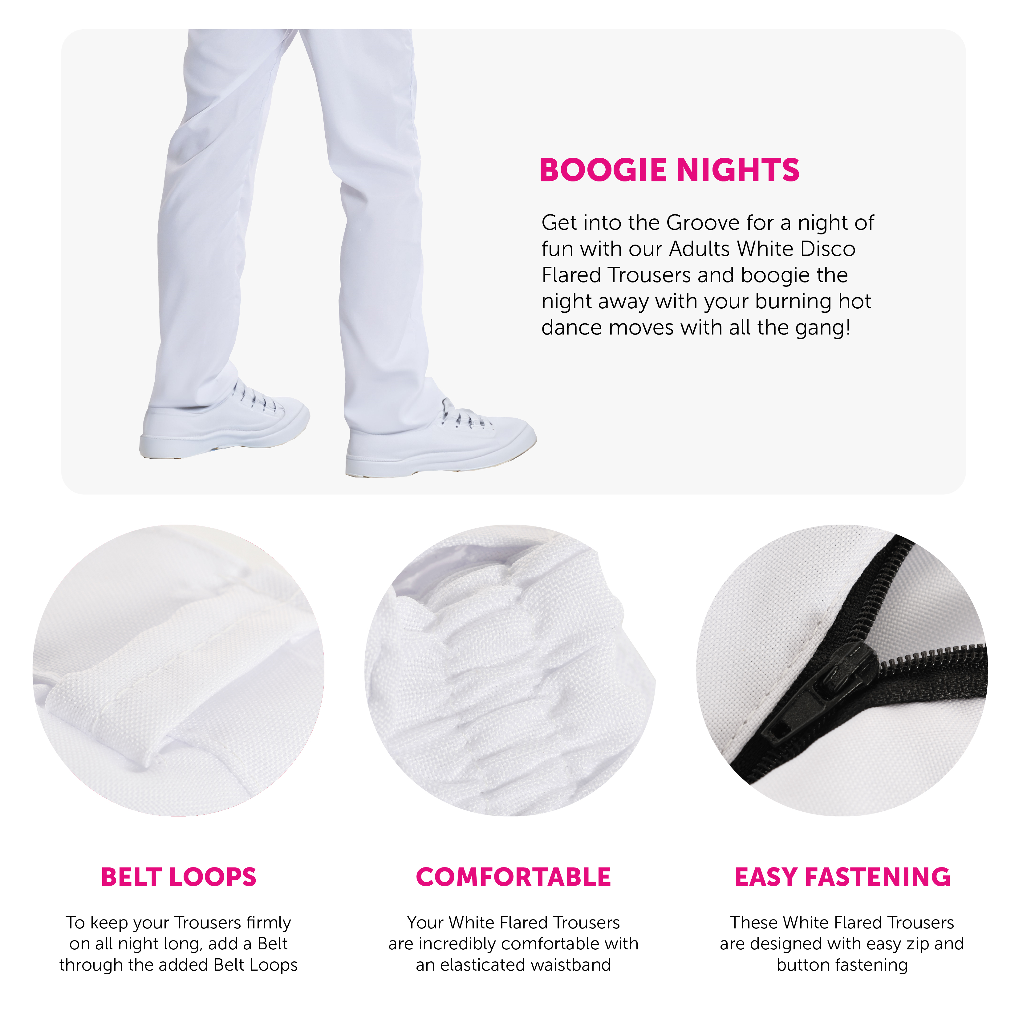 TROUSER DETAILS: These Adults White Disco Flared Trousers are comfortable Flared Leg Trousers with zip and button up fastening, the perfect addition to any Fancy Dress Costume!