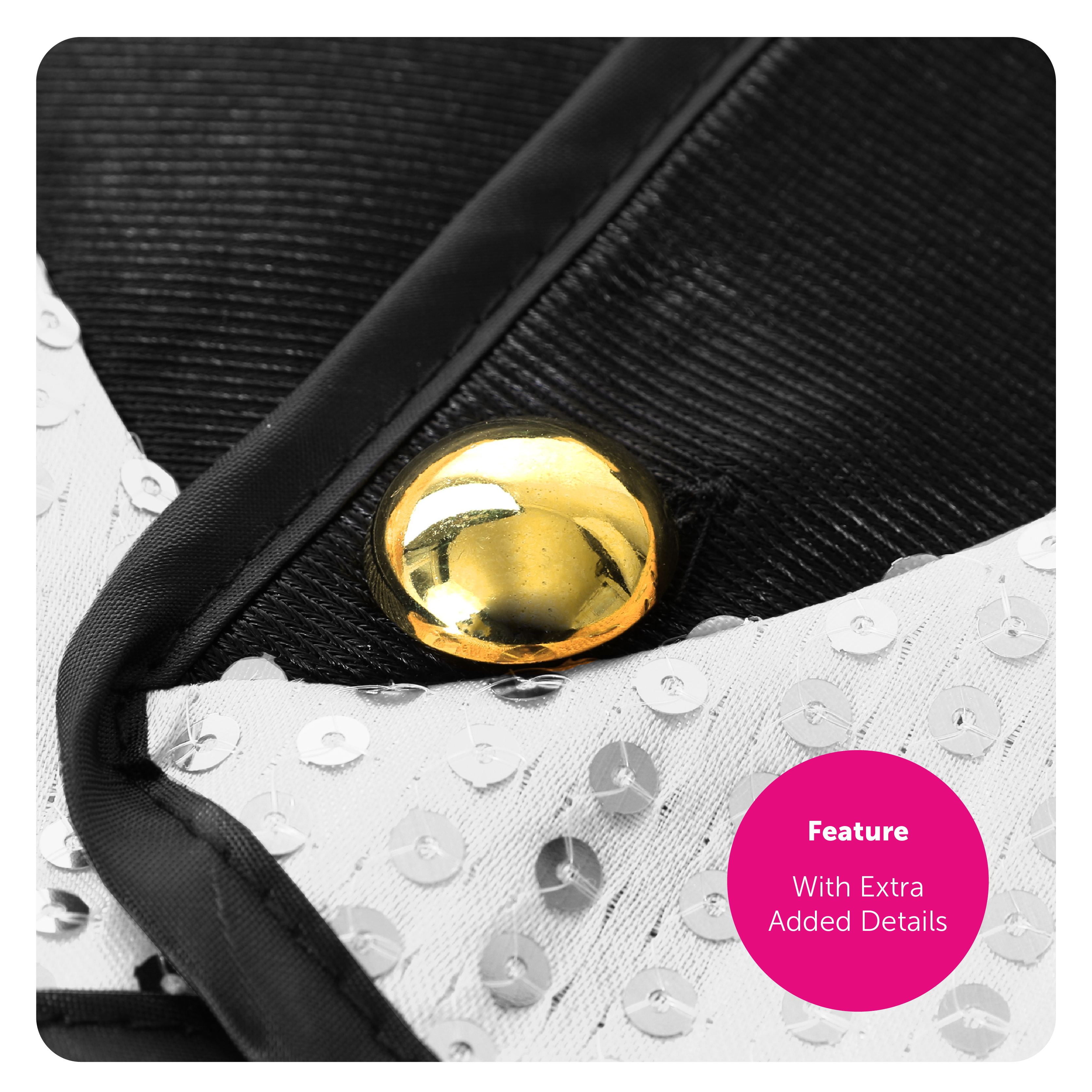 SILVER TAILCOAT DETAILS: This Adults Tailcoat is a beautiful Silver sequin covered Coat with black edging and detailed with a Gold Button, the perfect finishing touch to any outfit!